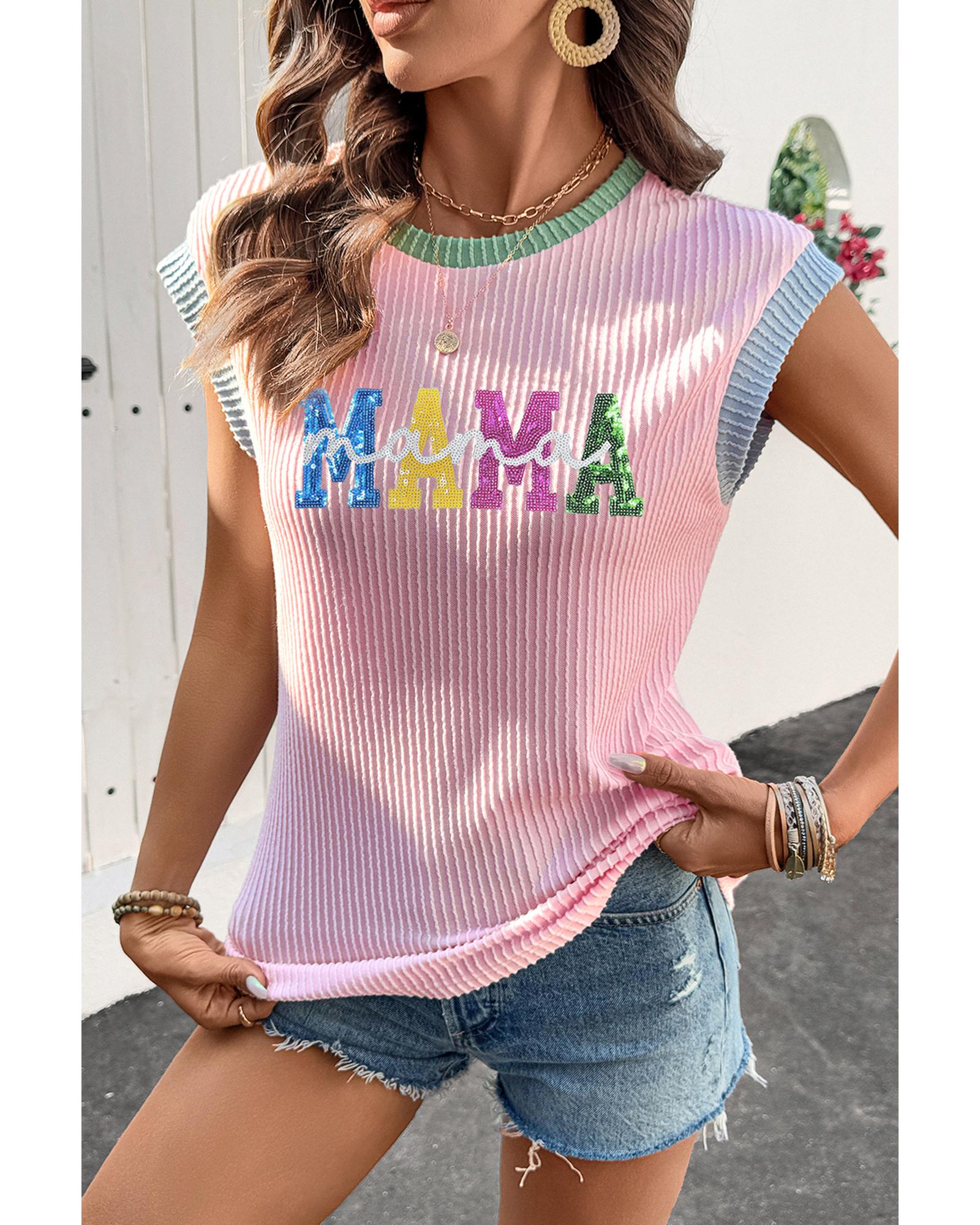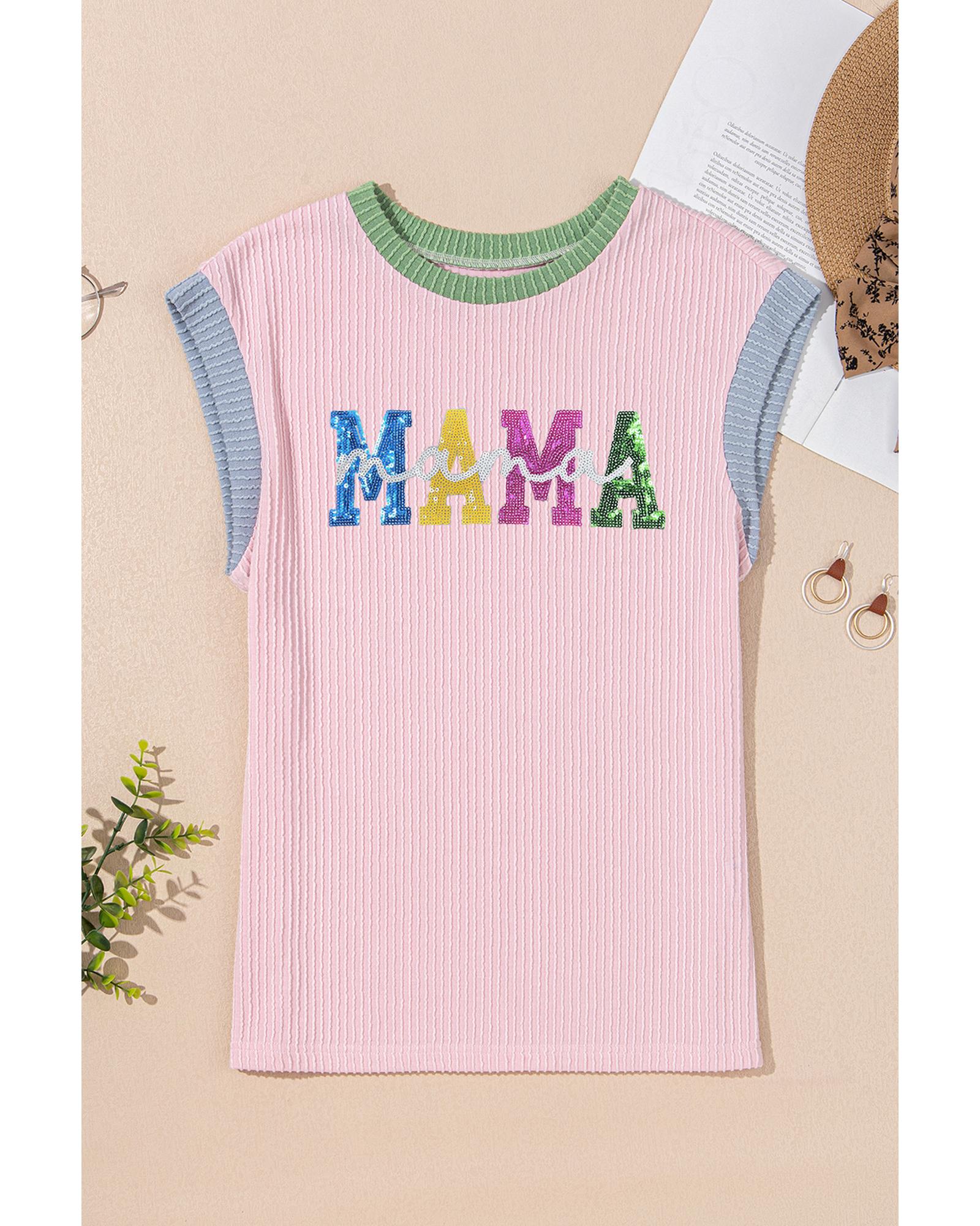Pink Sequined MAMA Graphic Corded Rib Knit Colorblock T Shirt – L