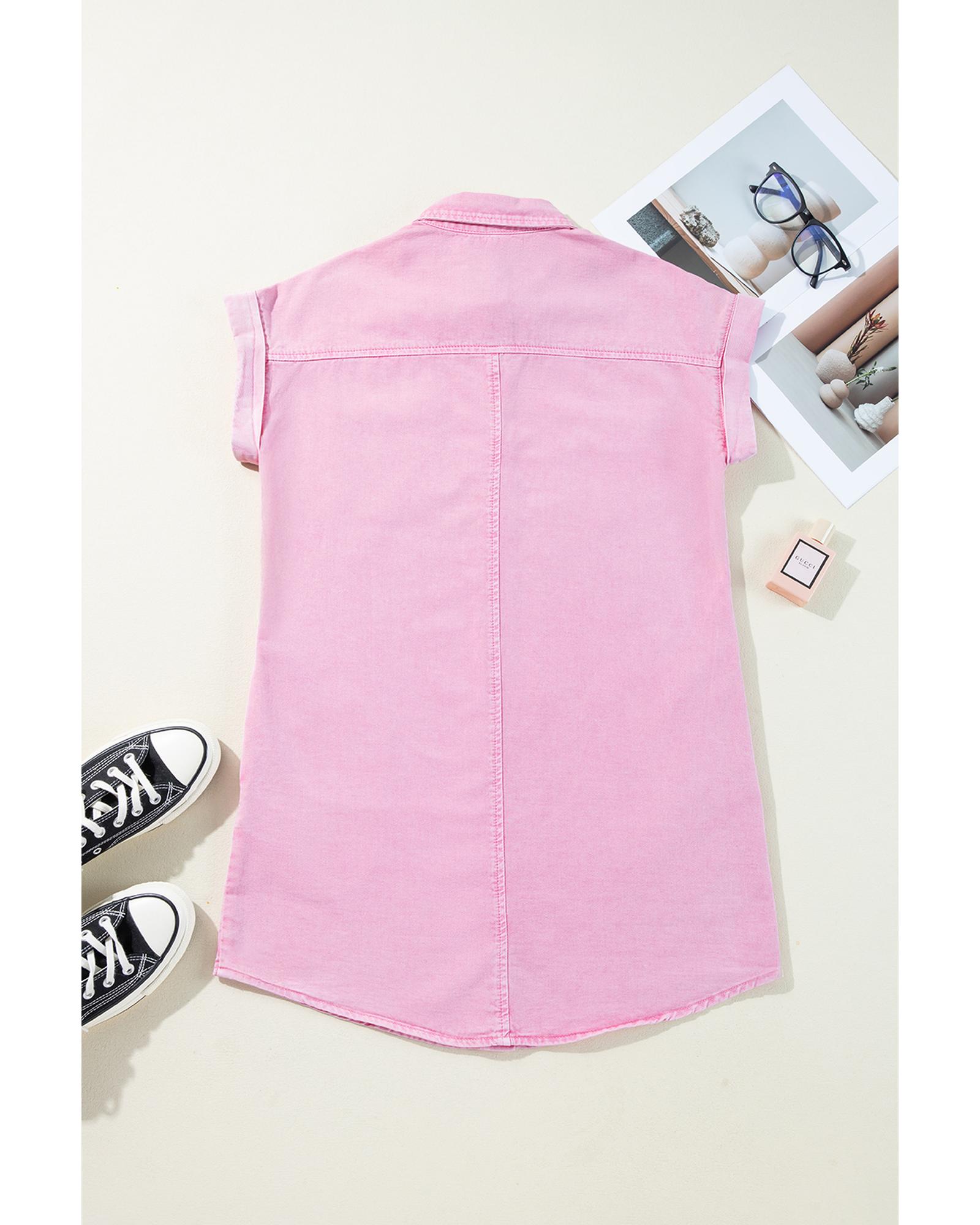 This pink short sleeve denim shirt dress features a classic design with practical details, making it a versatile addition to your wardrobe. Its fitted style offers a trendy look suitable for various casual occasions. The dress is crafted from comfortable cotton material, ensuring ease of wear during warmer weather.