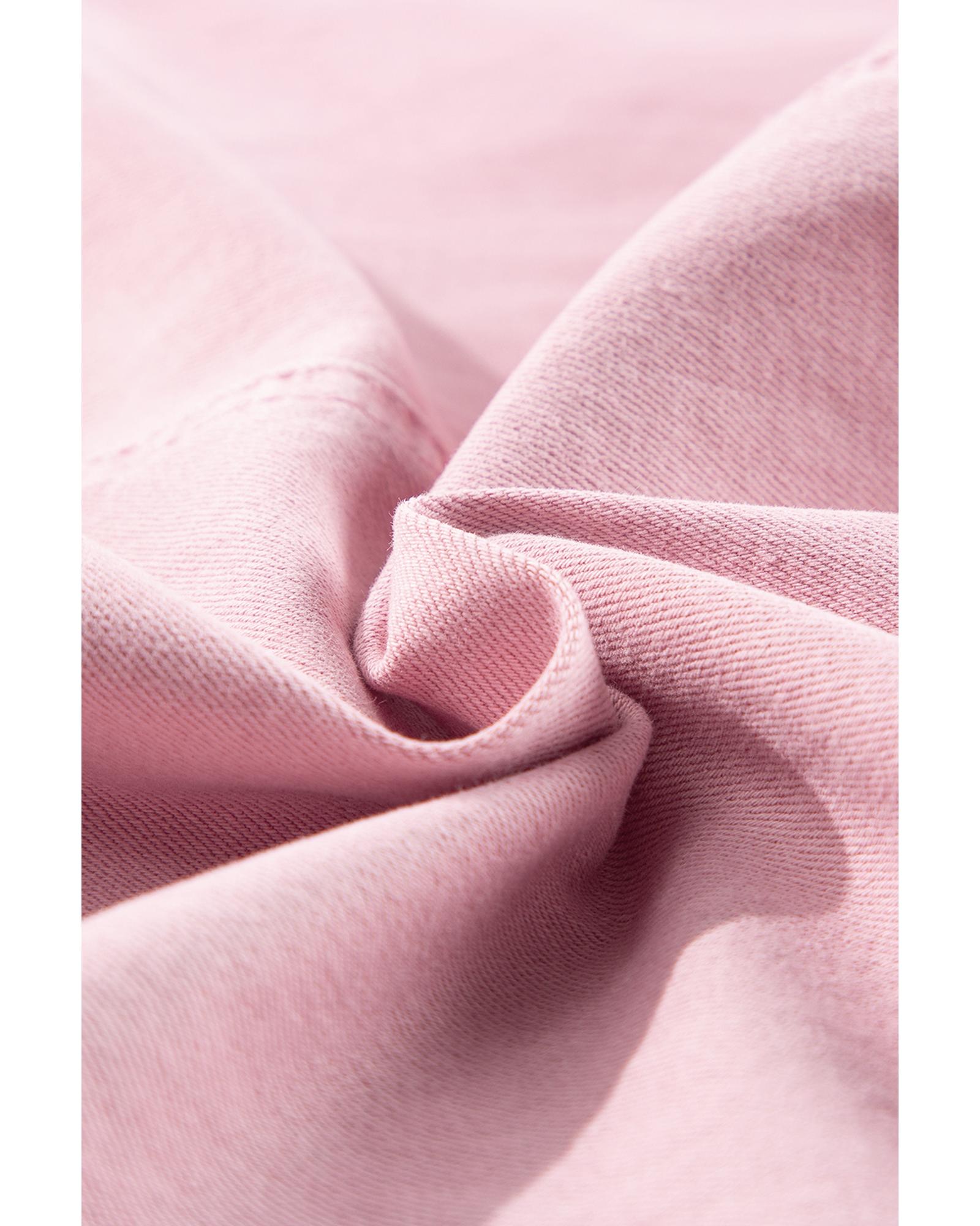 This denim romper features a solid pink color with stylish knot straps, offering a trendy and chic appearance. Designed for comfort and versatility, it is suitable for various casual occasions. The romper includes practical pockets and is crafted from a durable denim material, making it both fashionable and functional.