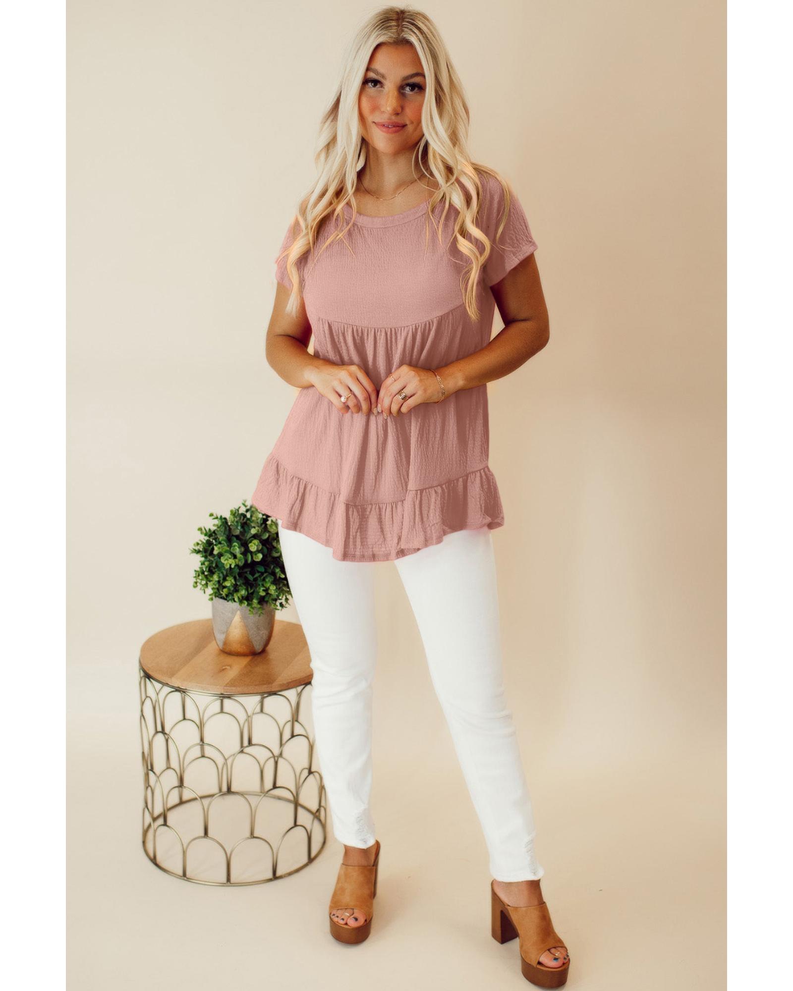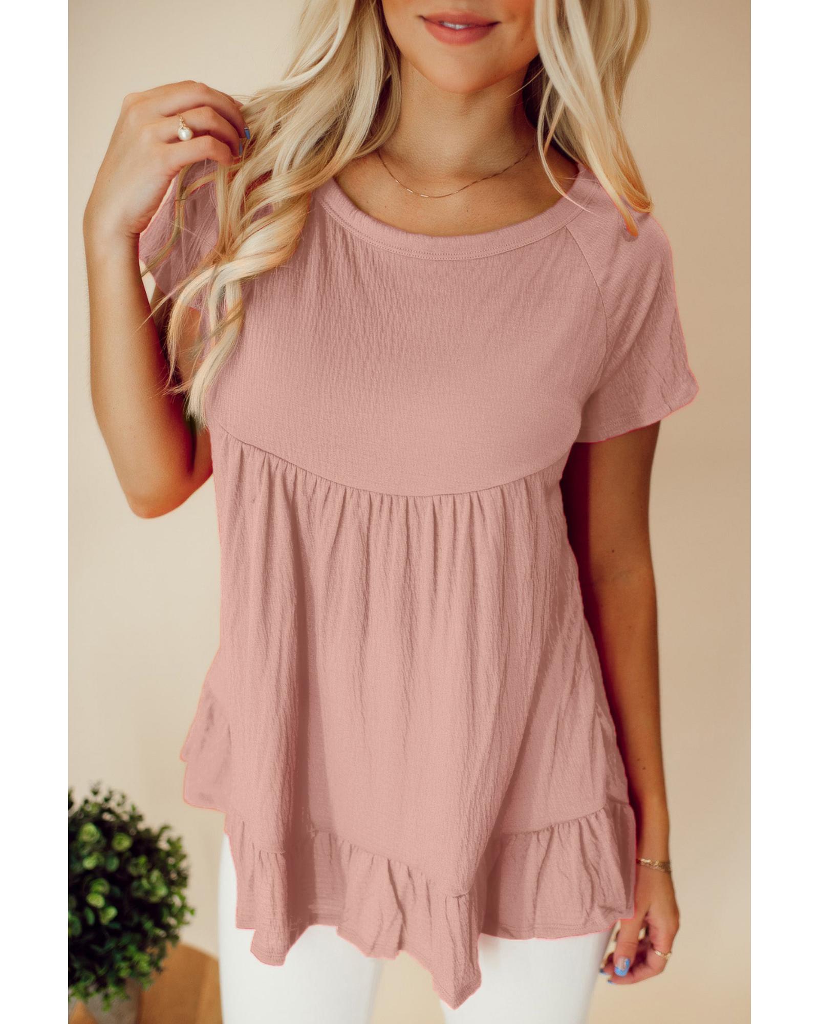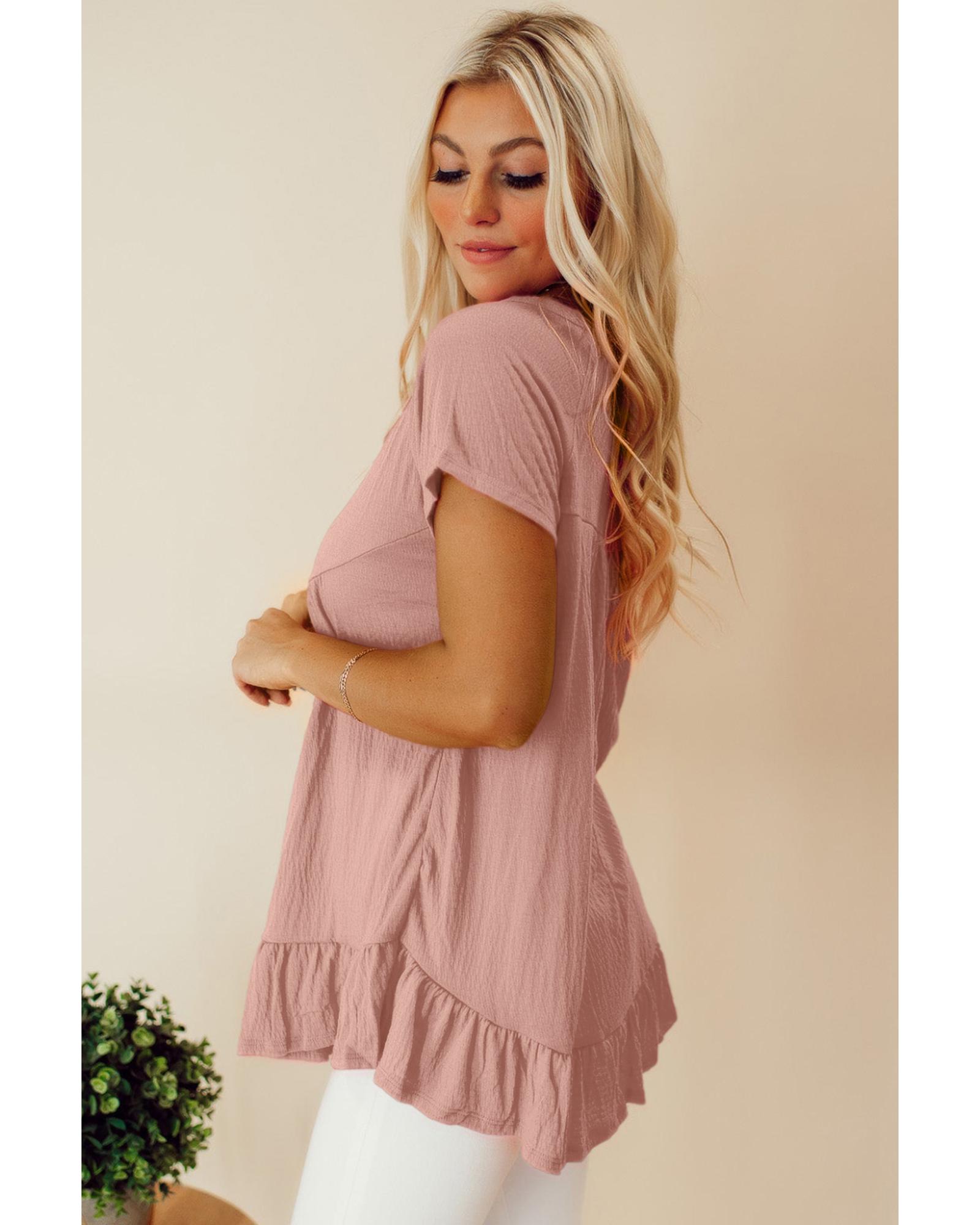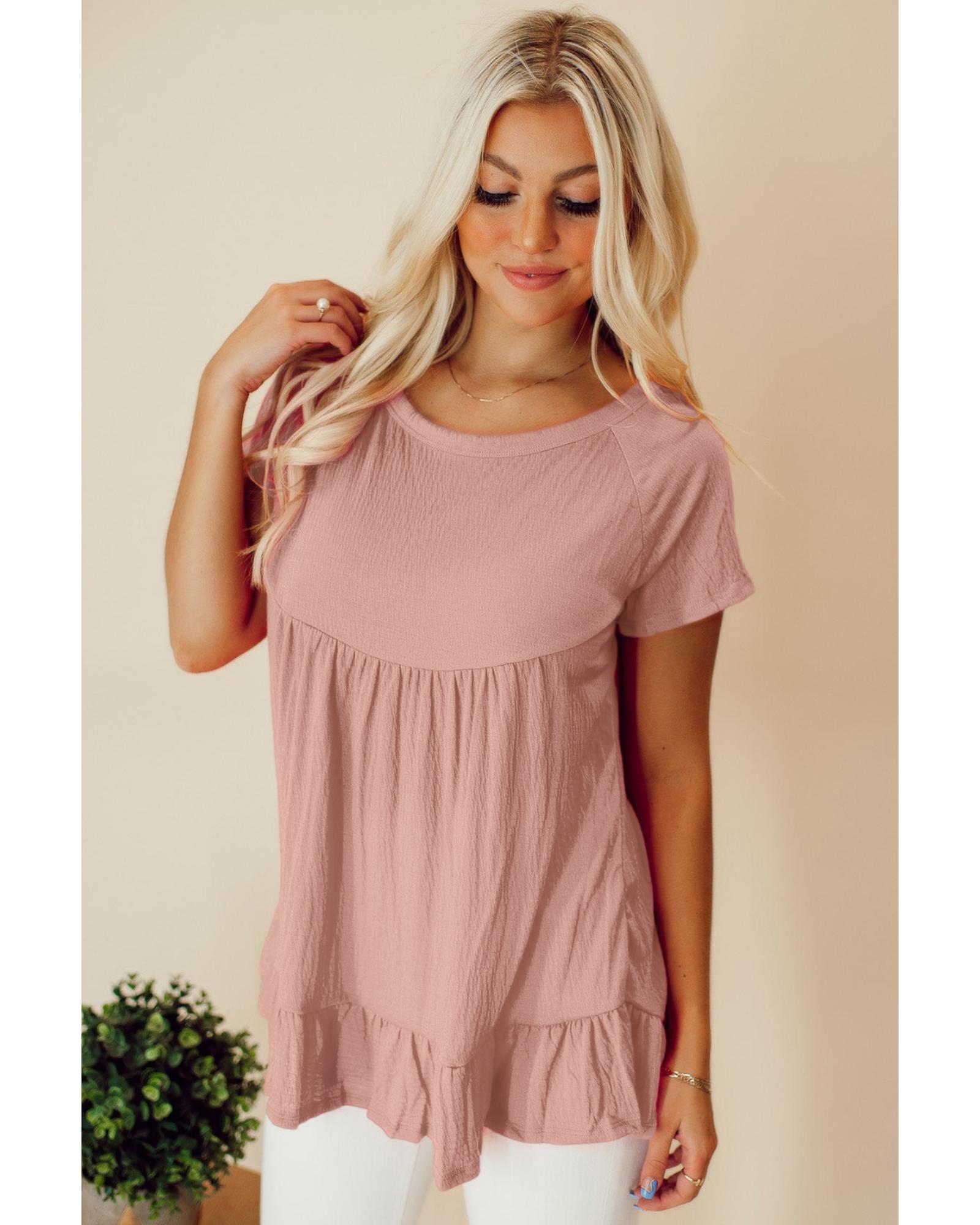 This pink solid short sleeve ruffle hem top features a trendy fitted design with a flowy fit, round neckline, and short sleeves. The exposed seam and ruffled hemline add a stylish touch, making it flattering for most body shapes. Suitable for both men and women, it offers a comfortable and fashionable look.