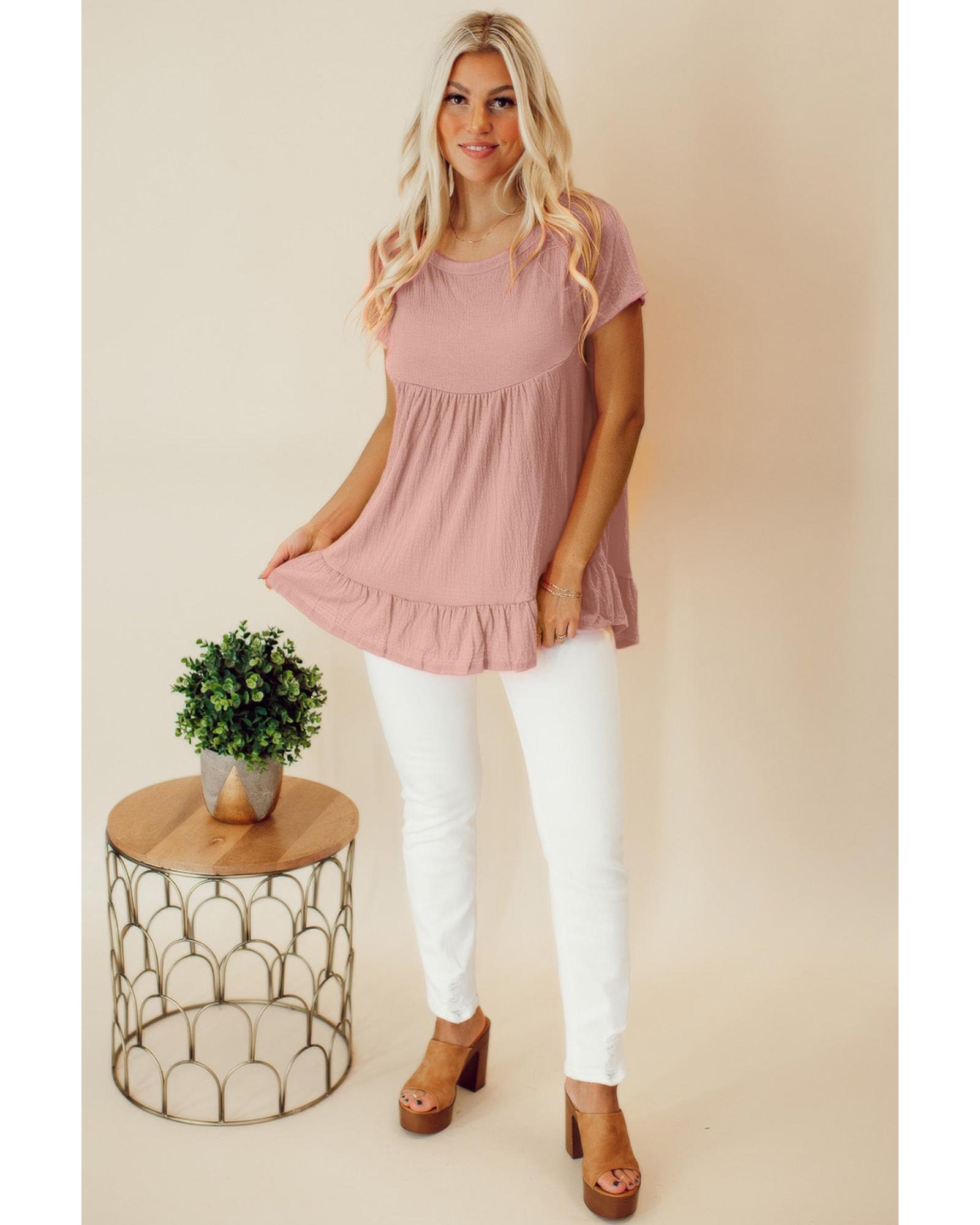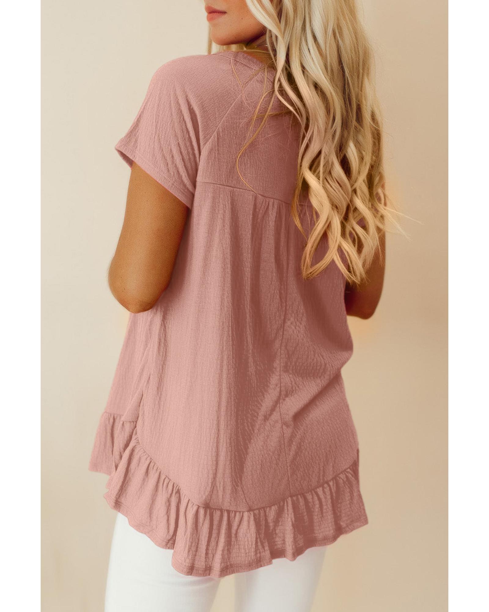 This pink solid short sleeve ruffle hem top features a trendy fitted design with a flowy fit, round neckline, and short sleeves. The exposed seam and ruffled hemline add a stylish touch, making it flattering for most body shapes. Suitable for both men and women, it offers a versatile and fashionable look.