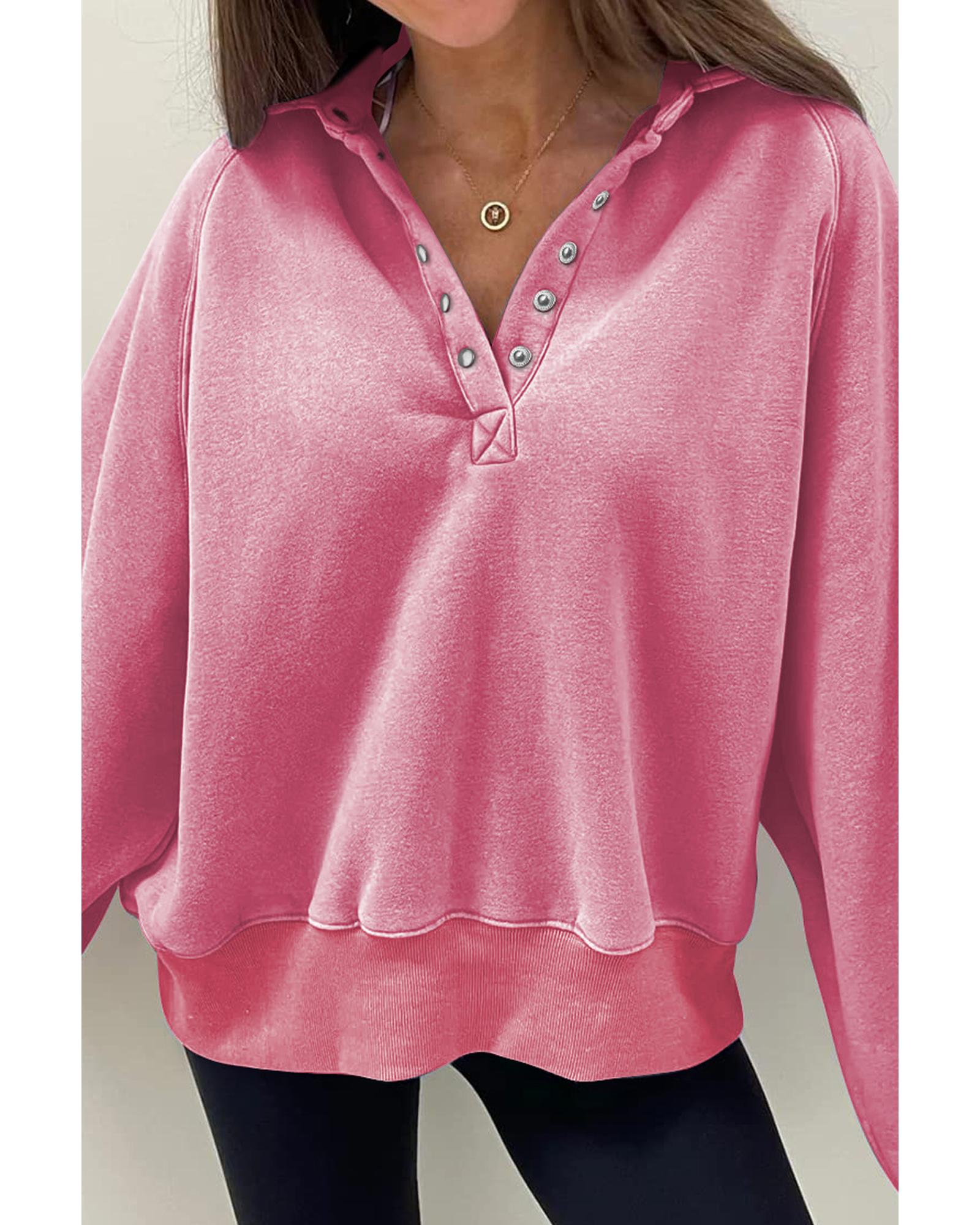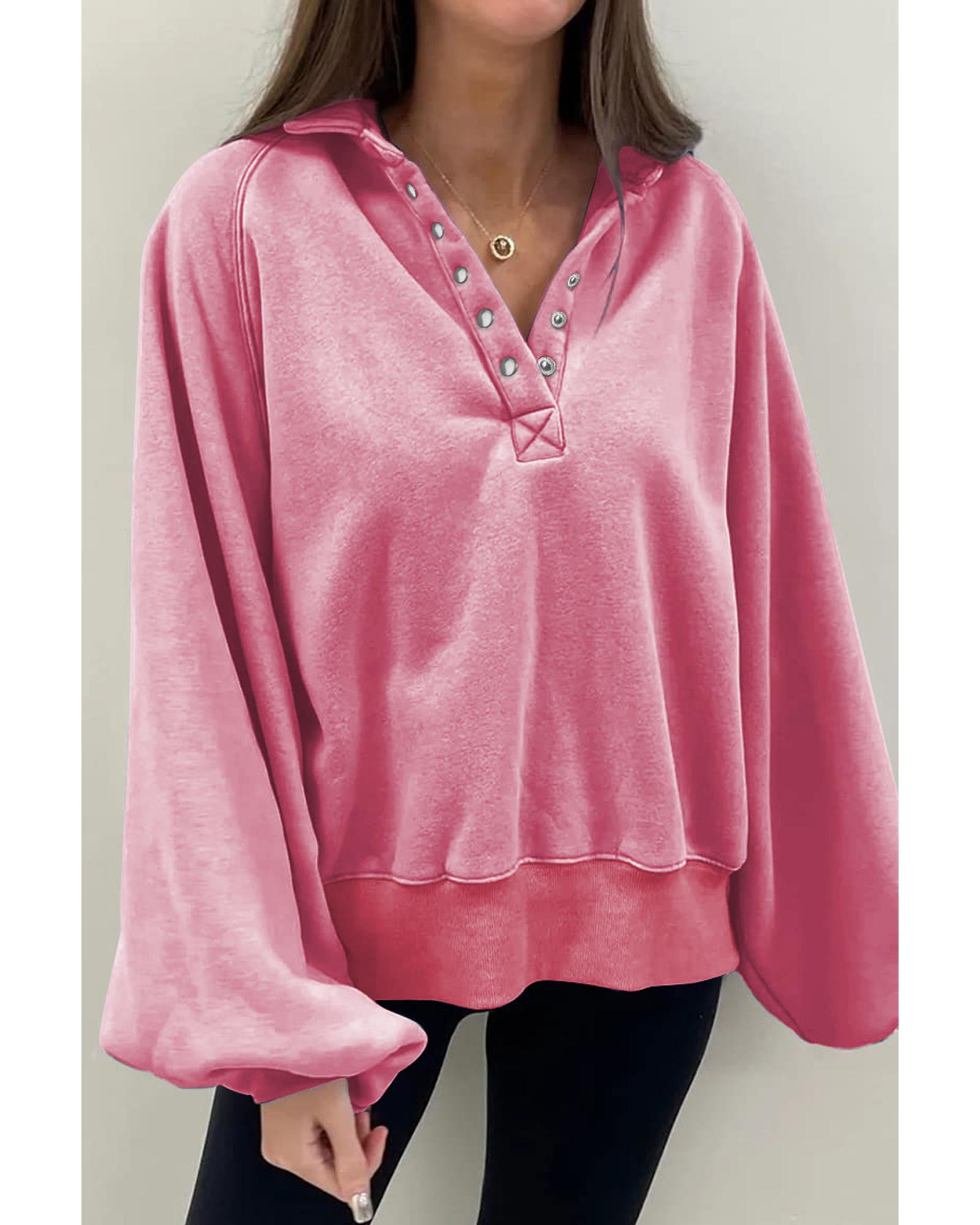 Pink Solid Snap Buttons Collared Balloon Sleeve Oversized Sweatshirt – S