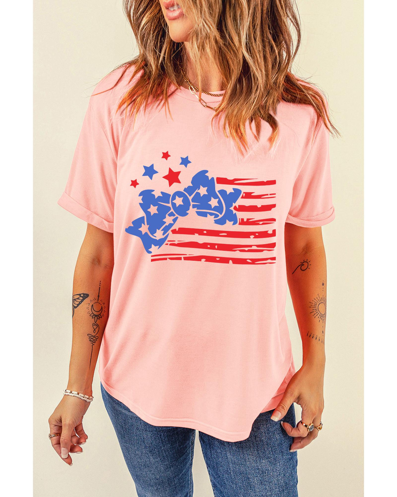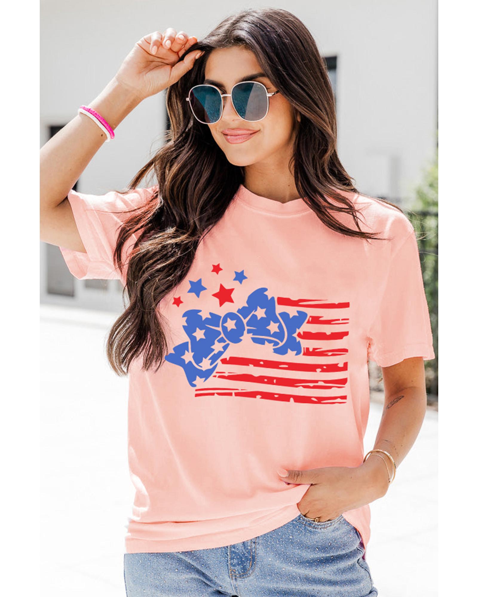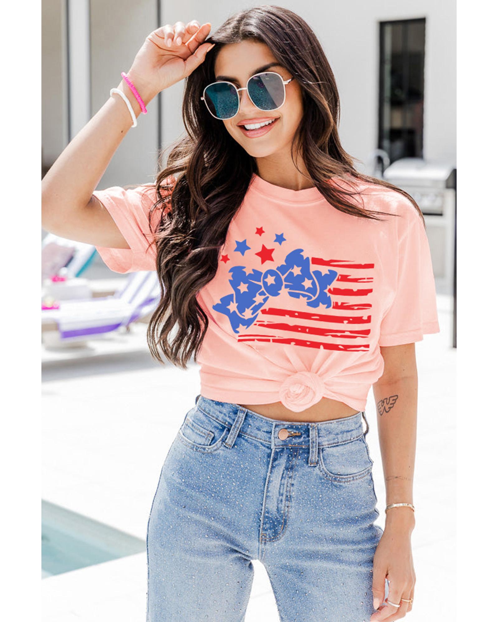 This stylish T-shirt features a trendy bow knot design combined with a unique stars and stripes print, making it a versatile addition to your casual wardrobe. Crafted for comfort, it offers a relaxed fit and is made from soft, breathable fabric suitable for everyday wear.