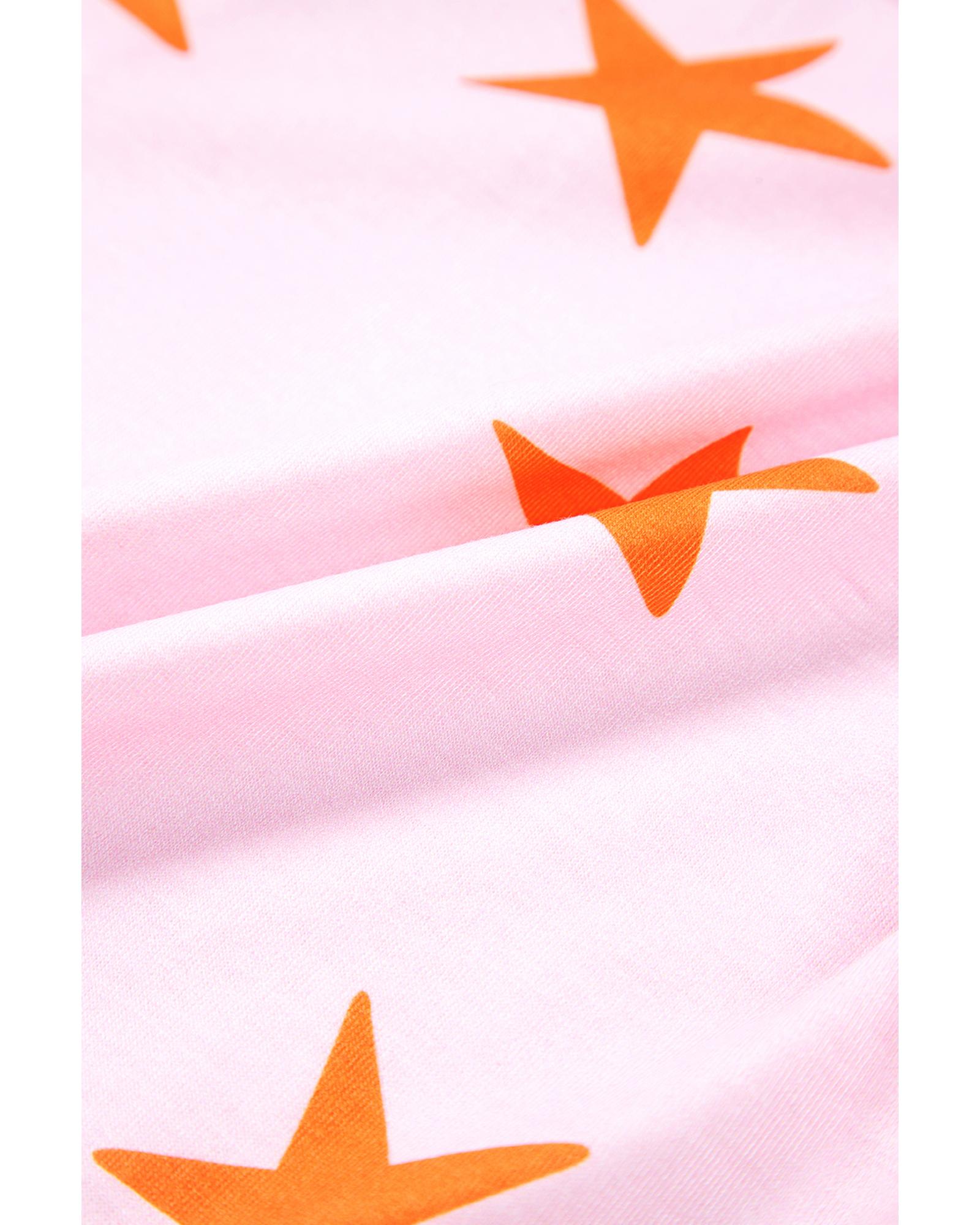 This bamboo pajama set features a stylish and comfortable design, perfect for relaxing at home. The set includes a short sleeve shirt and matching shorts, both adorned with a charming star print. Made from soft bamboo fabric, it offers a breathable and eco-friendly option for sleepwear.