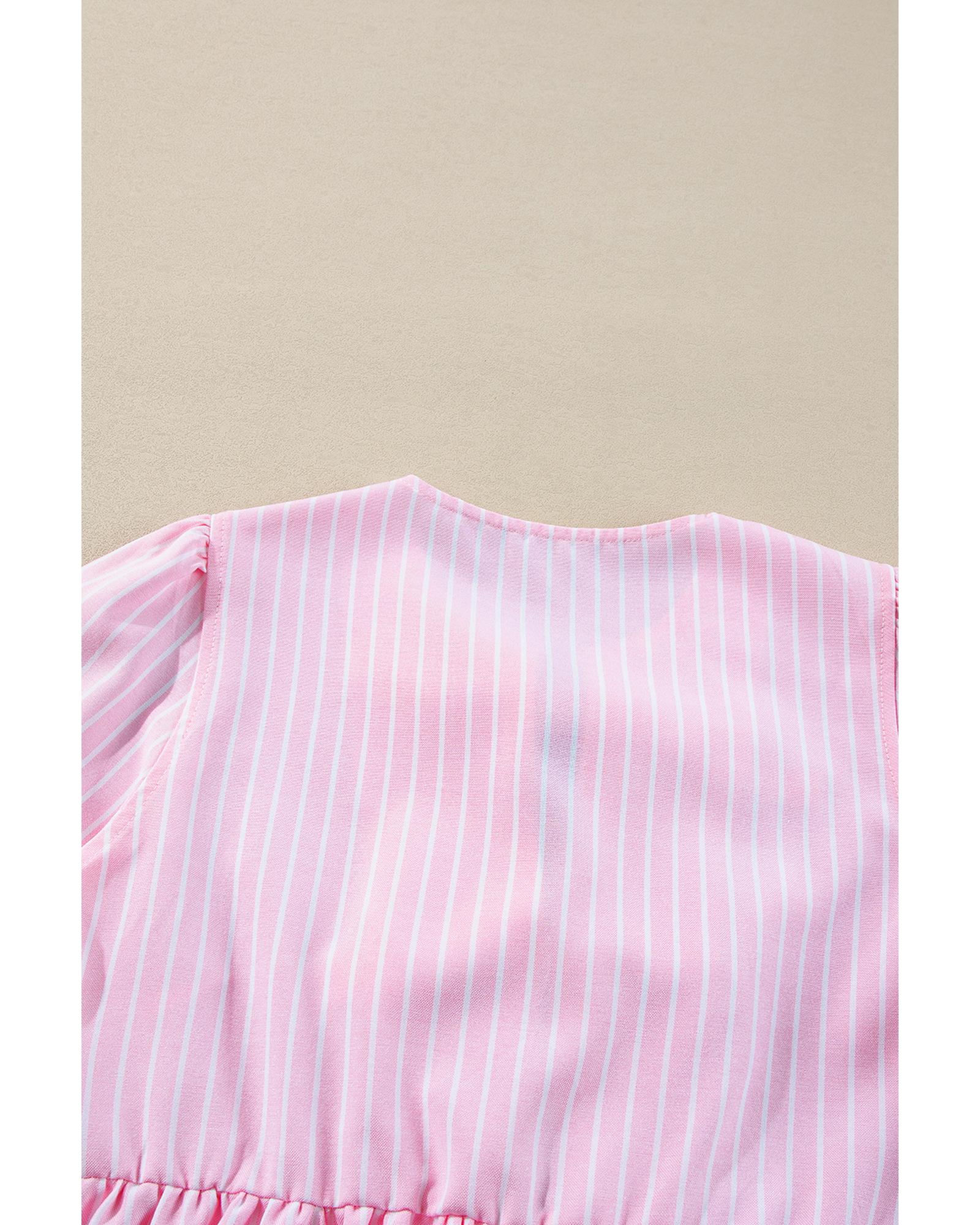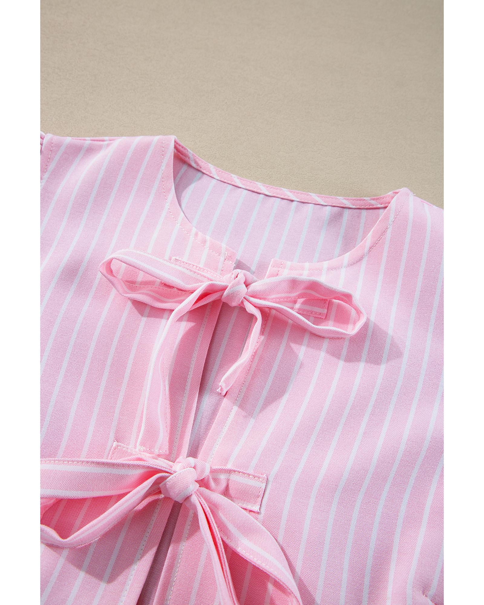 Pink Stripe Bowknot Front Crew Neck Puff Sleeve Blouse – XL