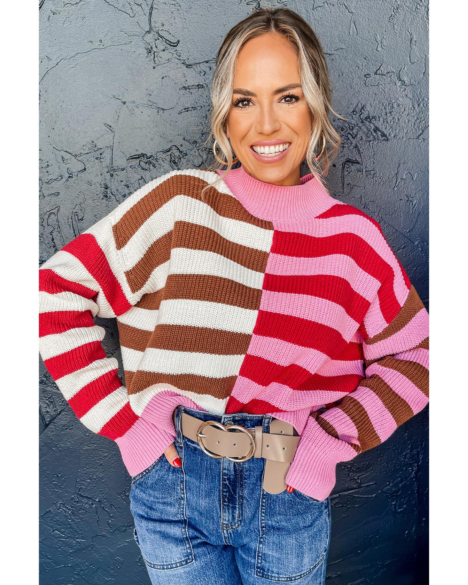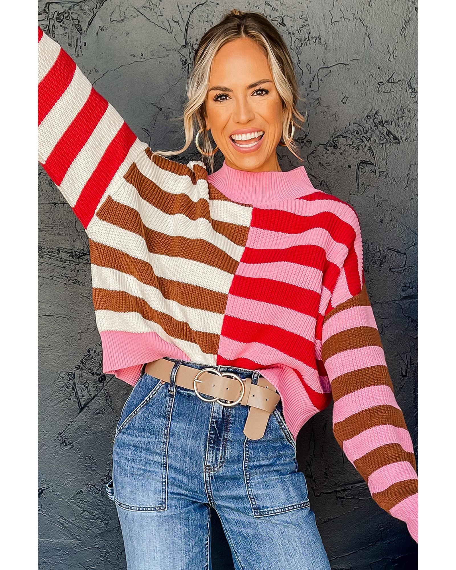 Pink Stripe Color Block High Neck Drop Shoulder Loose Sweater – L