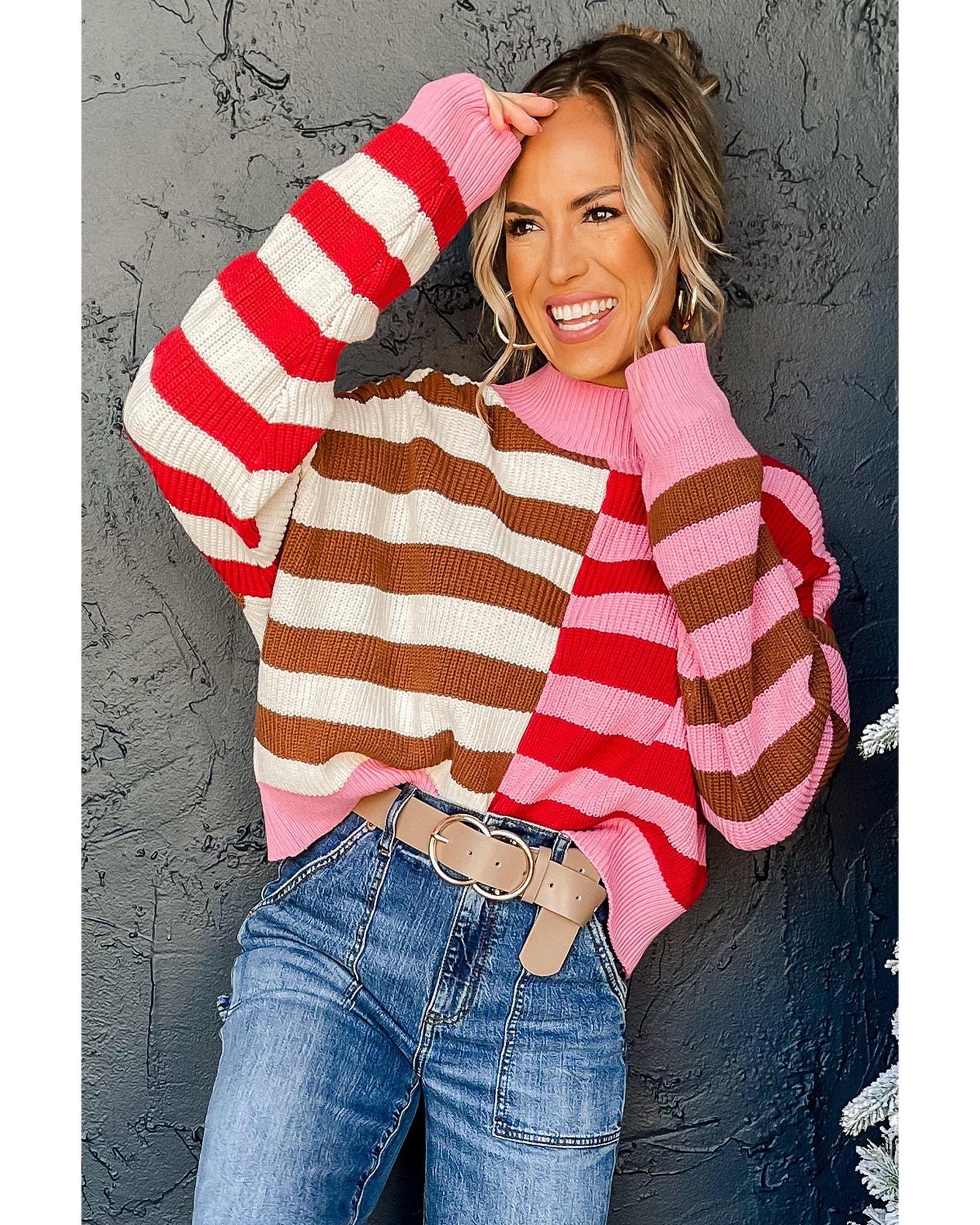 Pink Stripe Color Block High Neck Drop Shoulder Loose Sweater – XL