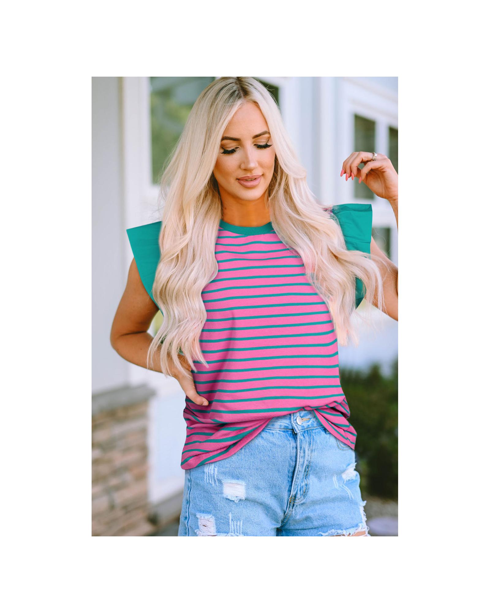 This blouse features a trendy fitted design with a vibrant colorblock striped pattern. It combines feminine ruffled sleeves with a classic crew neck, creating a chic and elegant silhouette suitable for various occasions.
