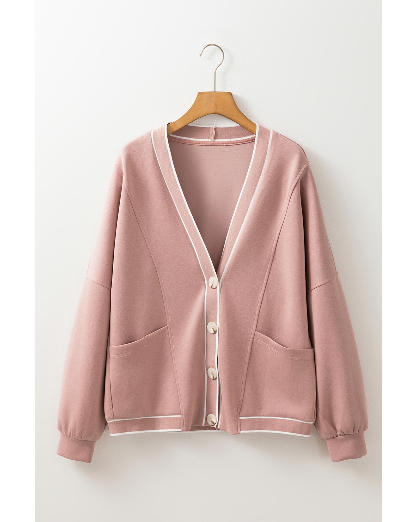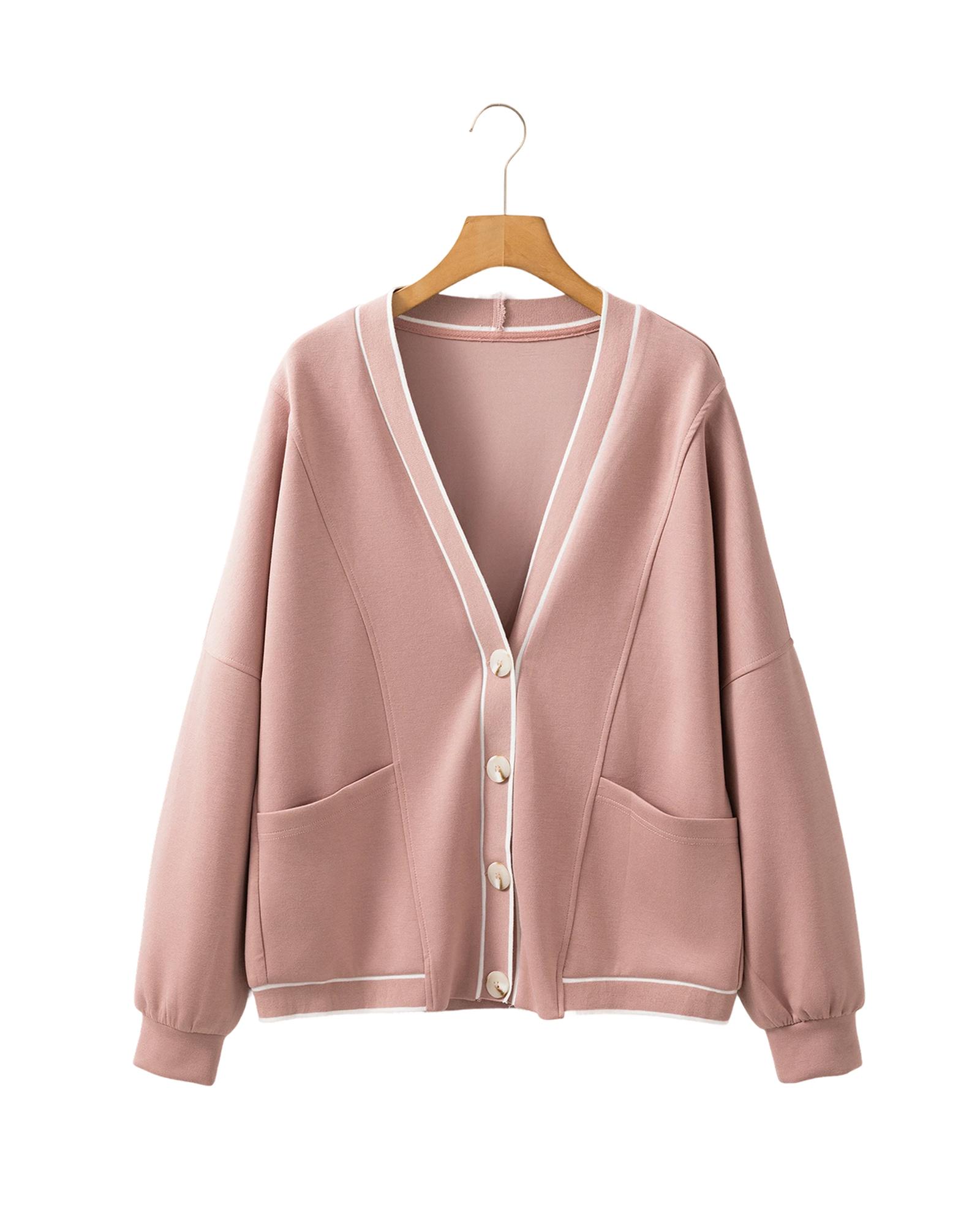 This knitted cardigan features a casual yet stylish design with a contrast trim V neckline and a buttoned front. It offers a relaxed fit with drop shoulder and loose sleeves, making it a versatile addition to your wardrobe. The cardigan is equipped with side pockets and pairs well with various fashionable bottoms.