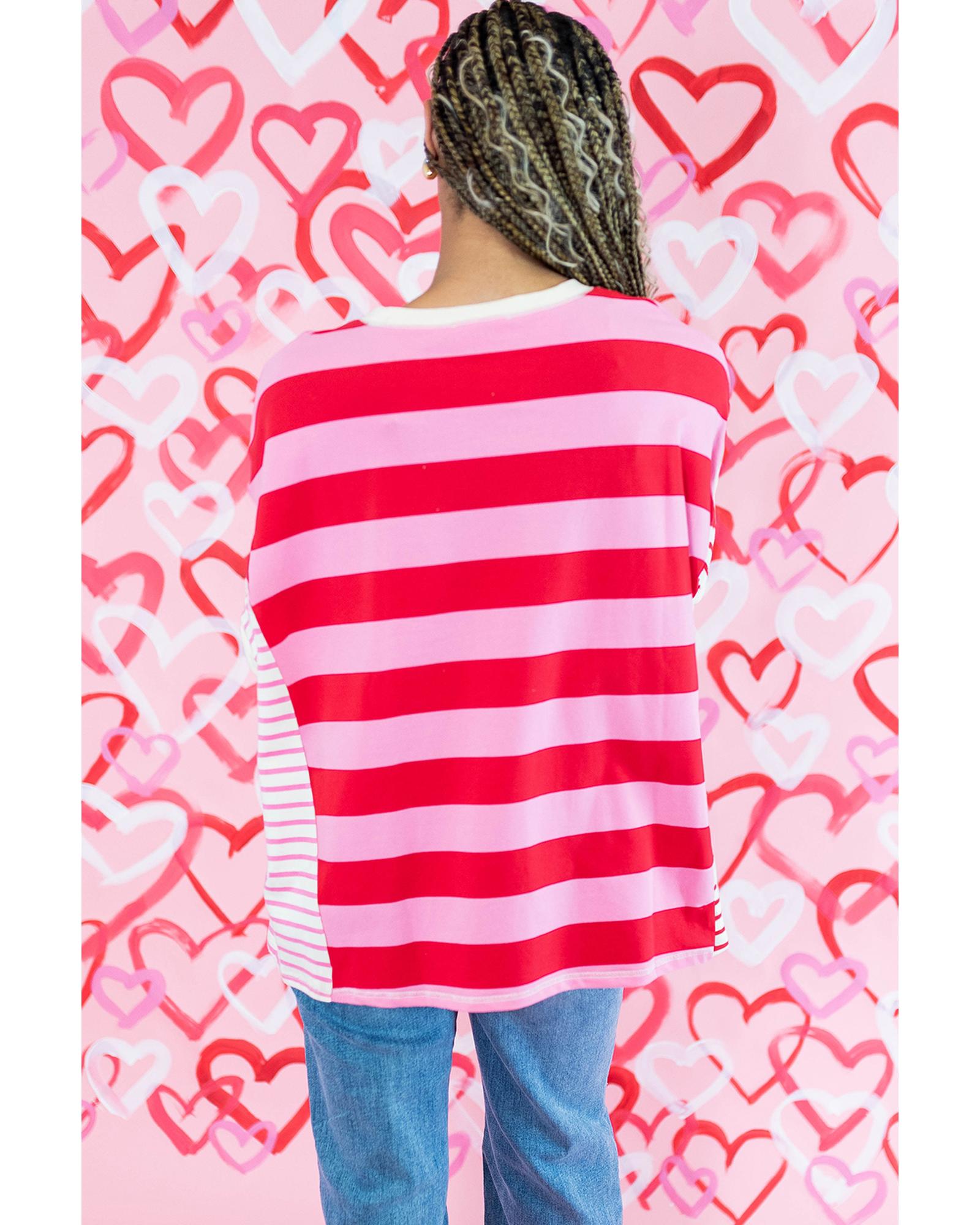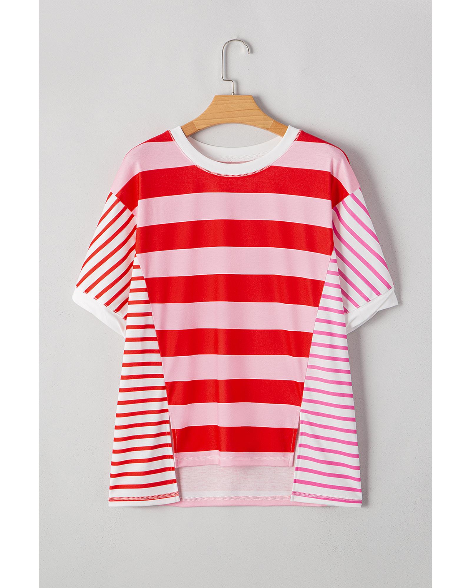 This round neck T-shirt features a stylish patchwork design with a pink stripe pattern, offering a trendy and fashionable look. Its loose fit provides comfort and ease of movement, making it suitable for casual wear. The side splits and high-low hem add unique and chic details to the overall design.
