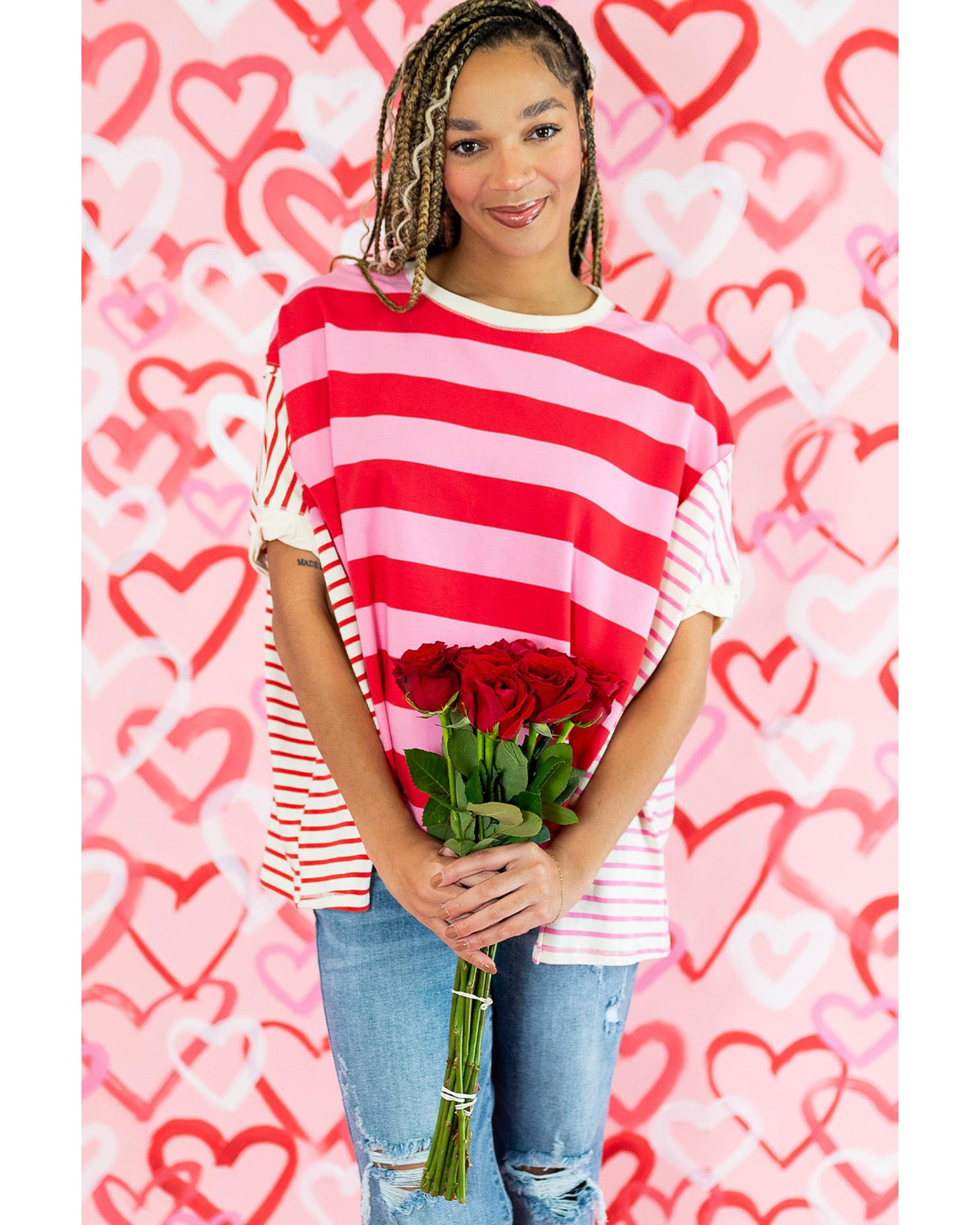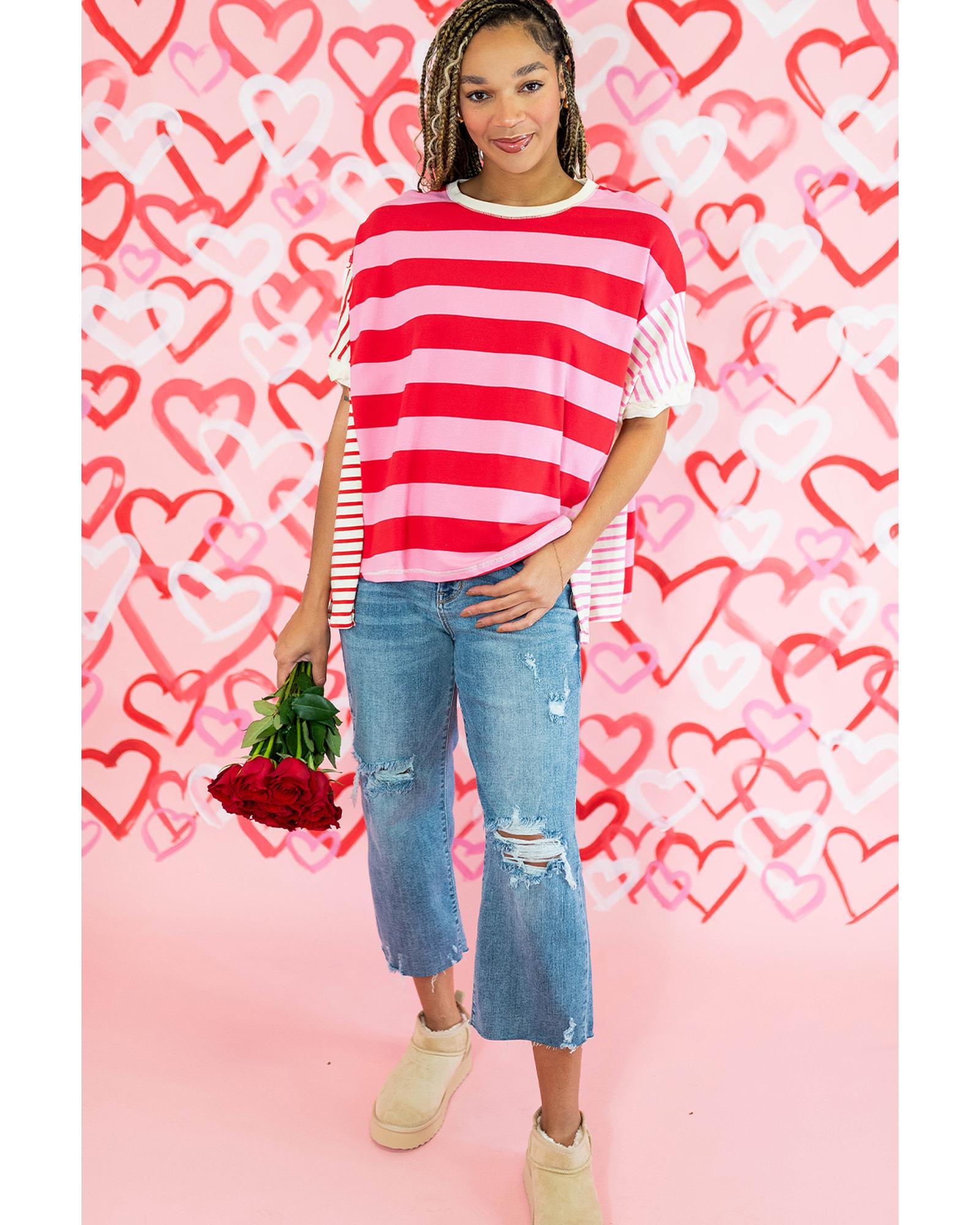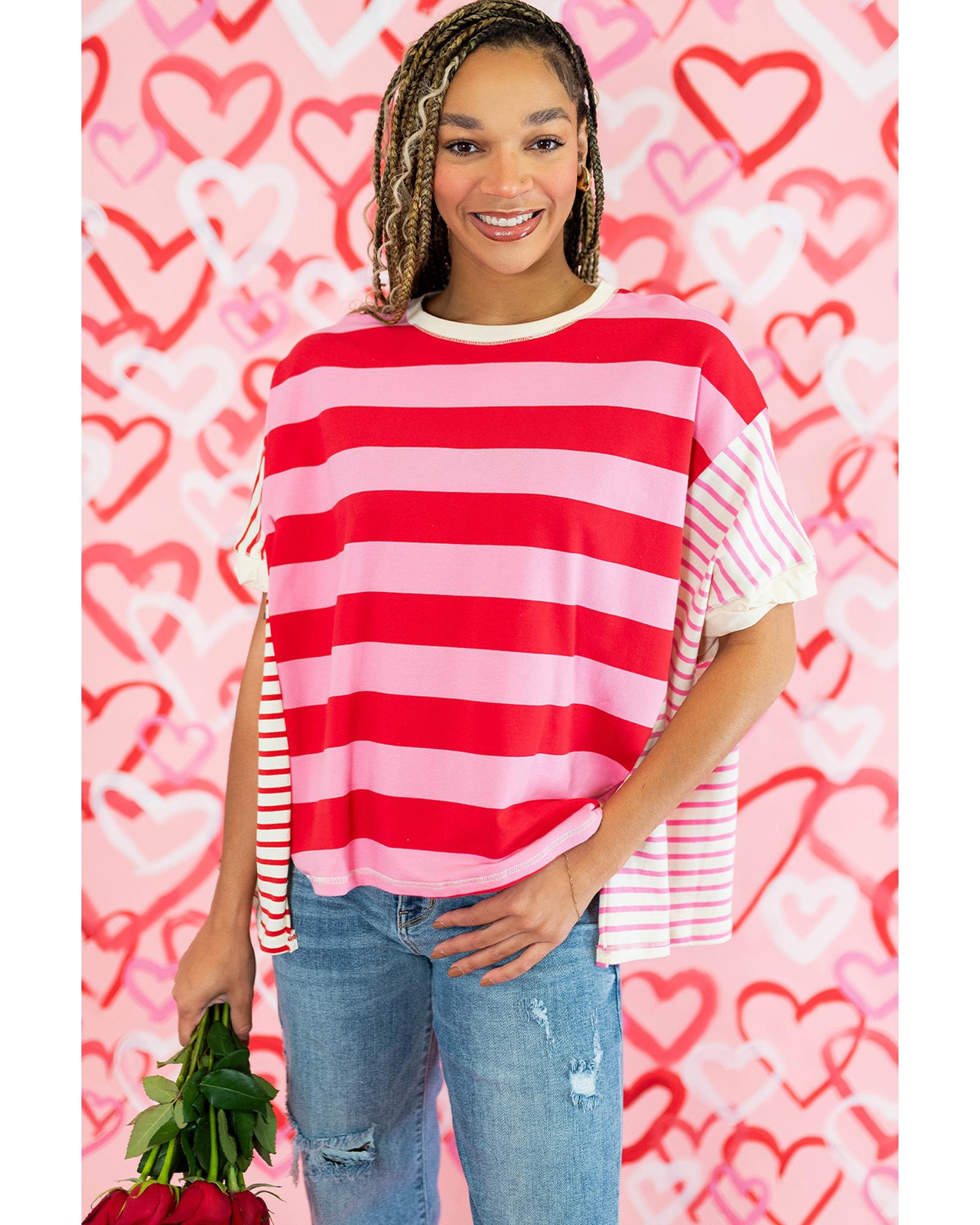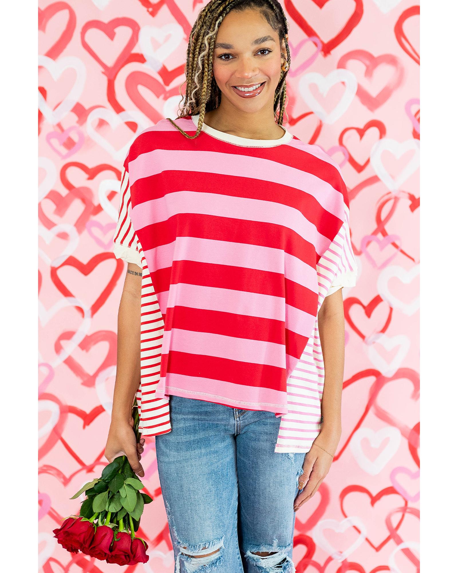 Pink Stripe Patchwork Round Neck Side Split Loose T Shirt – S