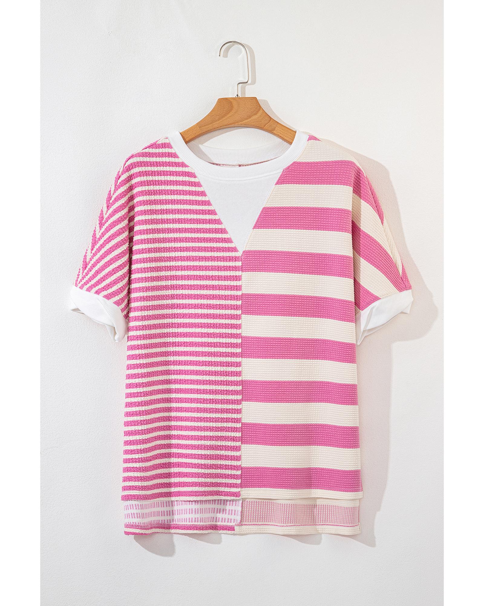 Pink Stripe Patchwork Textured Short Sleeve High Low Loose Top – XL