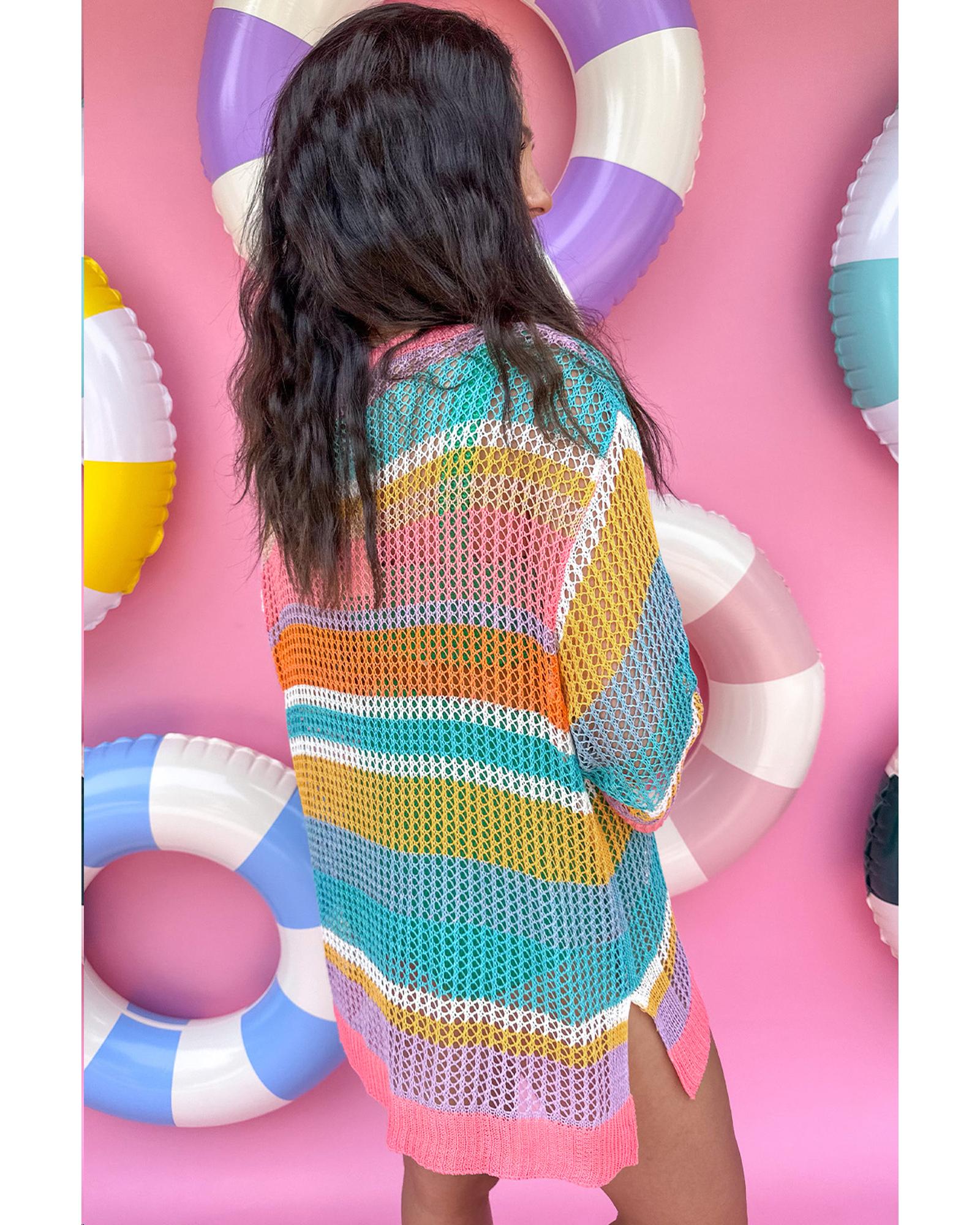 This plus size open knit sweater features a vibrant pink stripe design with patch pockets and short sleeves, offering a trendy and relaxed fit suitable for casual wear. Its open knit fabric makes it ideal for layering or warmer weather, providing both style and comfort.