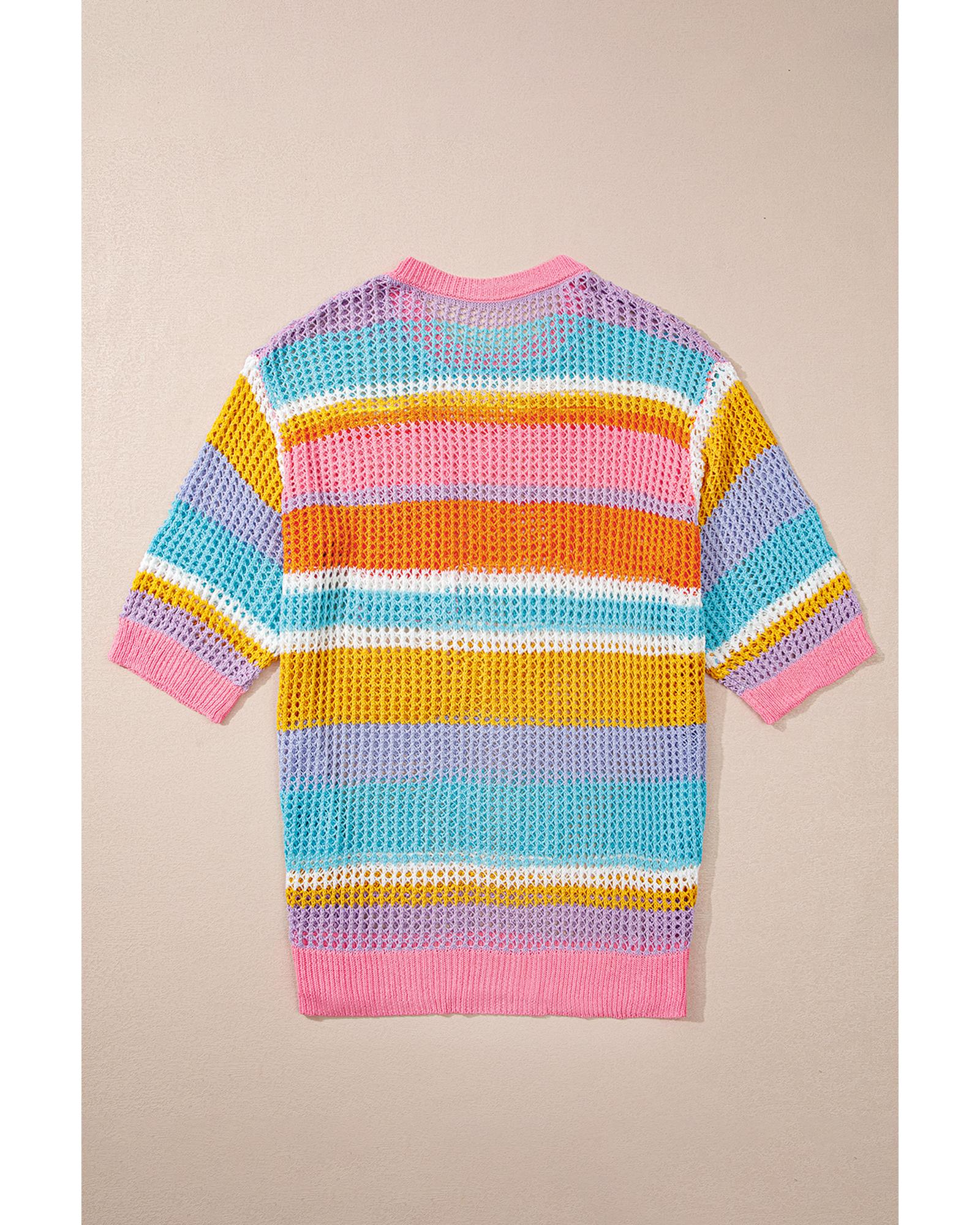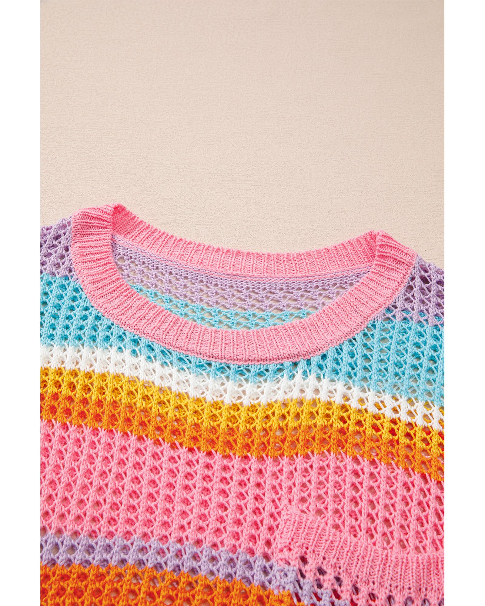 This plus size open knit sweater features a vibrant pink stripe design with patch pockets and short sleeves, offering a trendy and relaxed fit suitable for casual wear. Its open knit fabric makes it ideal for layering or warmer weather, providing both style and comfort.