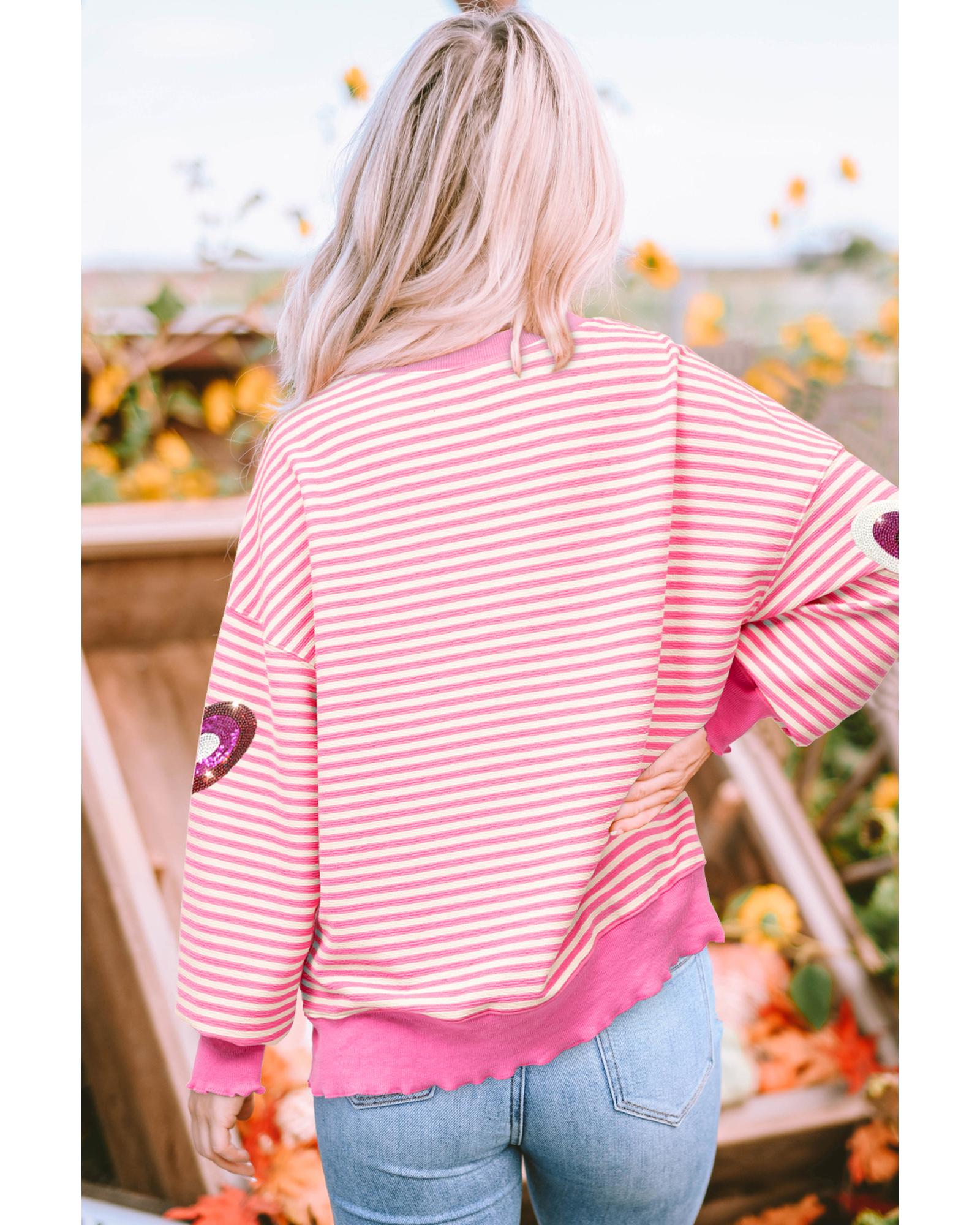 This long sleeve Valentines top features a stylish striped pattern with sequin hearts for added sparkle. Designed with a comfortable and relaxed fit, it is perfect for celebrating special occasions with a trendy look.
