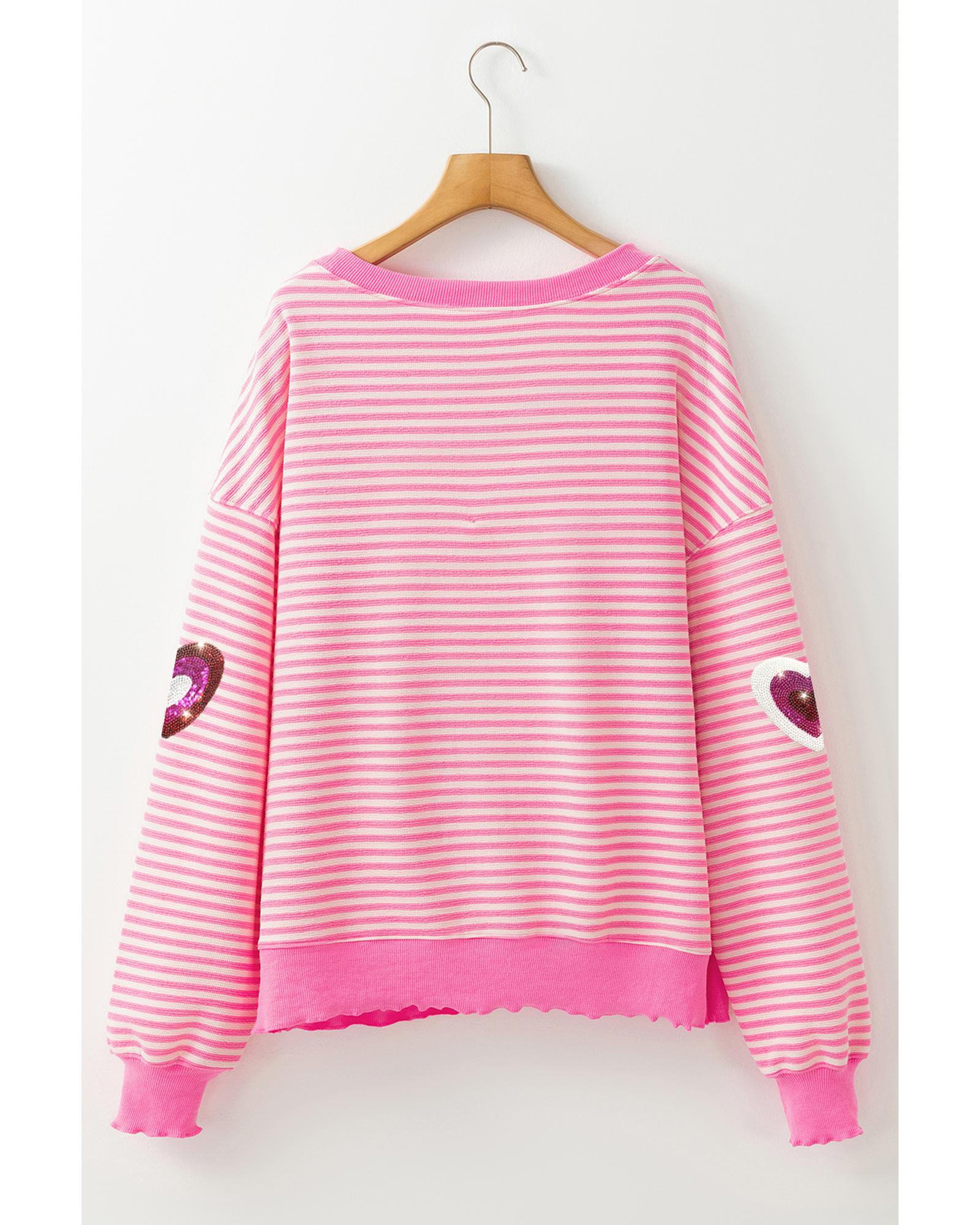 This long sleeve top features a trendy fitted design with a festive Valentines Day theme. It is decorated with sequin hearts and a stylish striped pattern, making it a fashionable choice for special occasions or casual wear. The top offers a comfortable and relaxed fit, suitable for various body types.