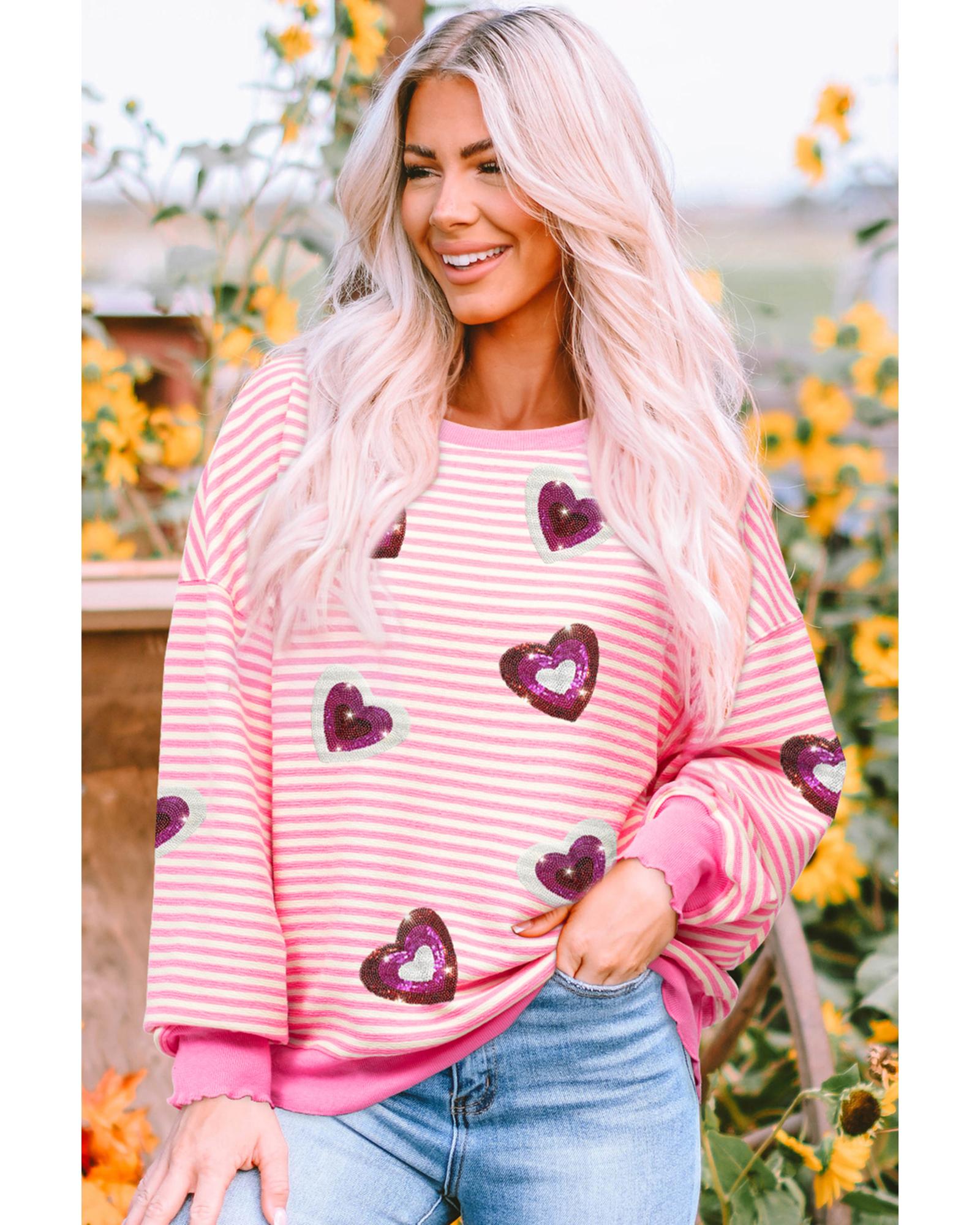 Pink Stripe Sequin Heart Patched Pattern Long Sleeve Valentines Top – XL