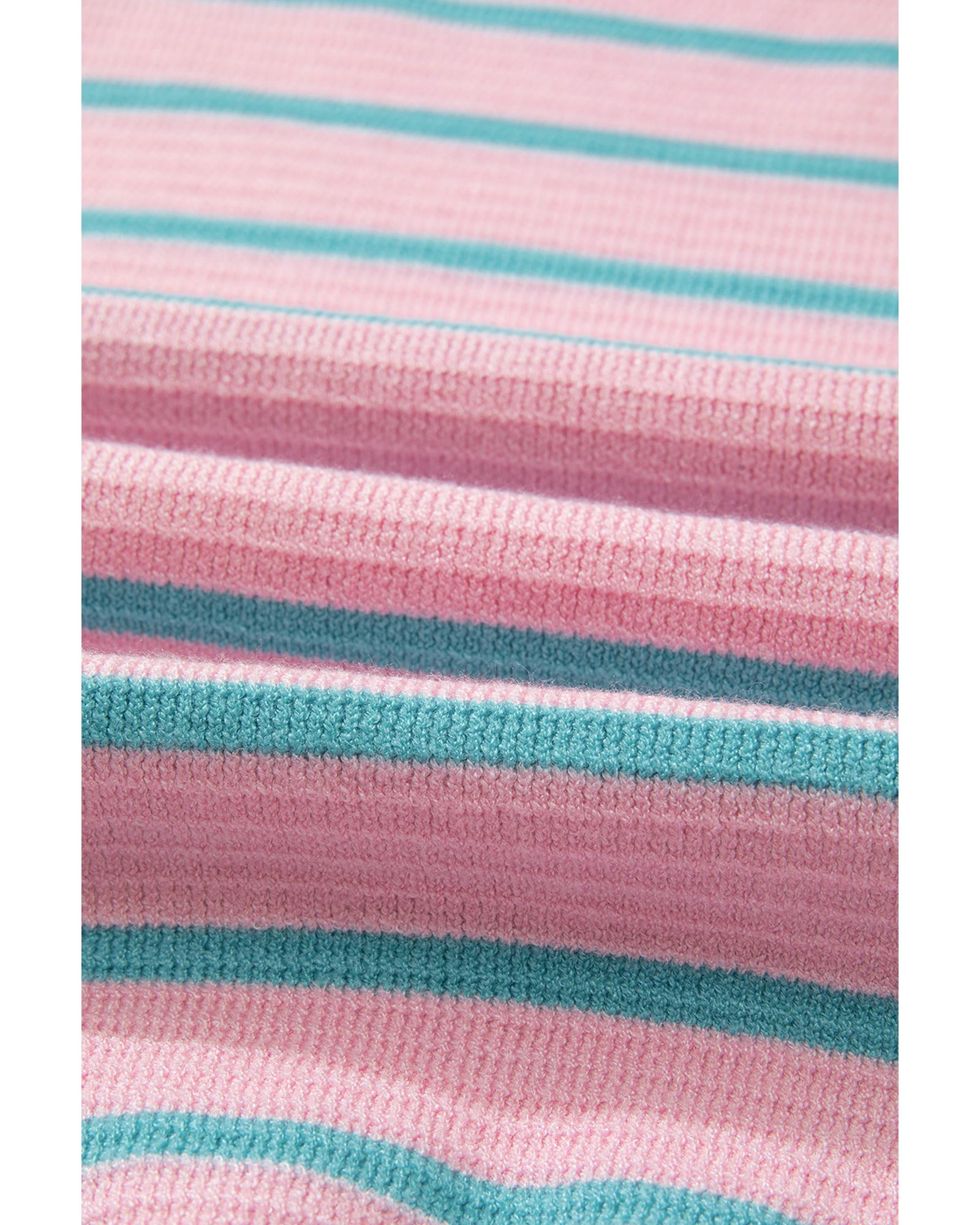 Pink Stripe Trimmed Round Neck Drop Shoulder Loose Sweater – L