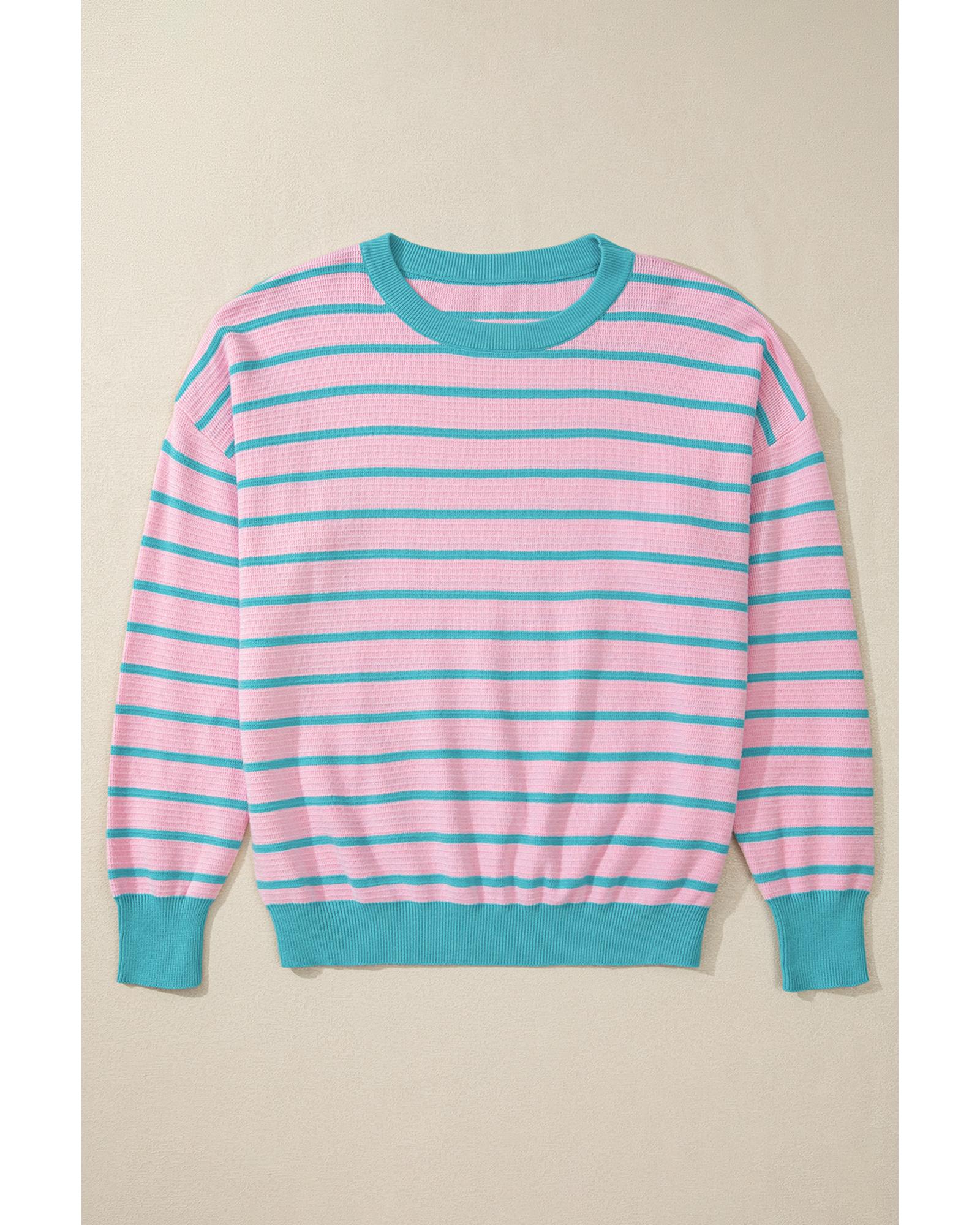 This round neck sweater features a stylish pink stripe trim and a relaxed, drop shoulder design, making it a versatile addition to any wardrobe. Its classic striped pattern and comfortable fit are suitable for various occasions and body types, providing both warmth and style.
