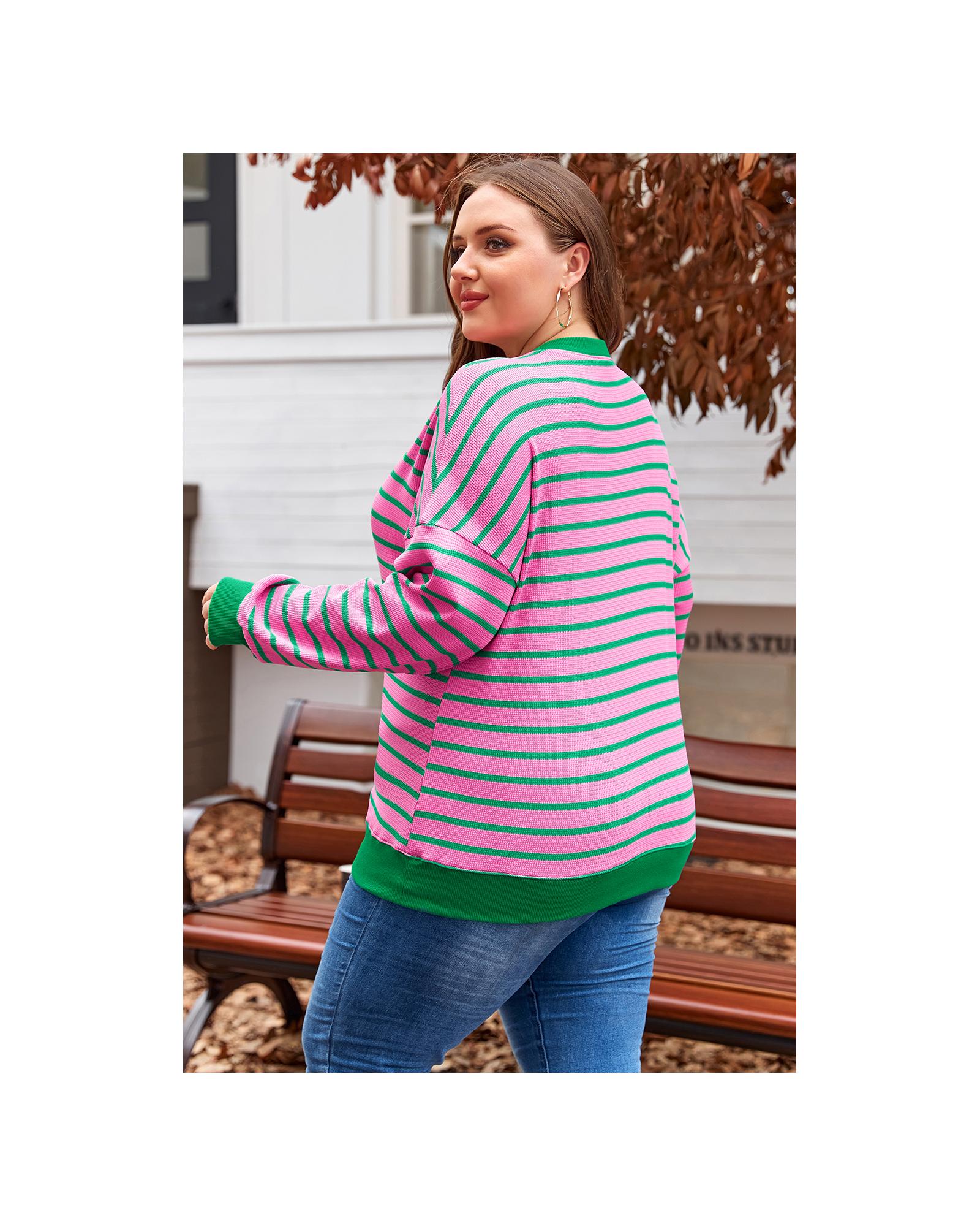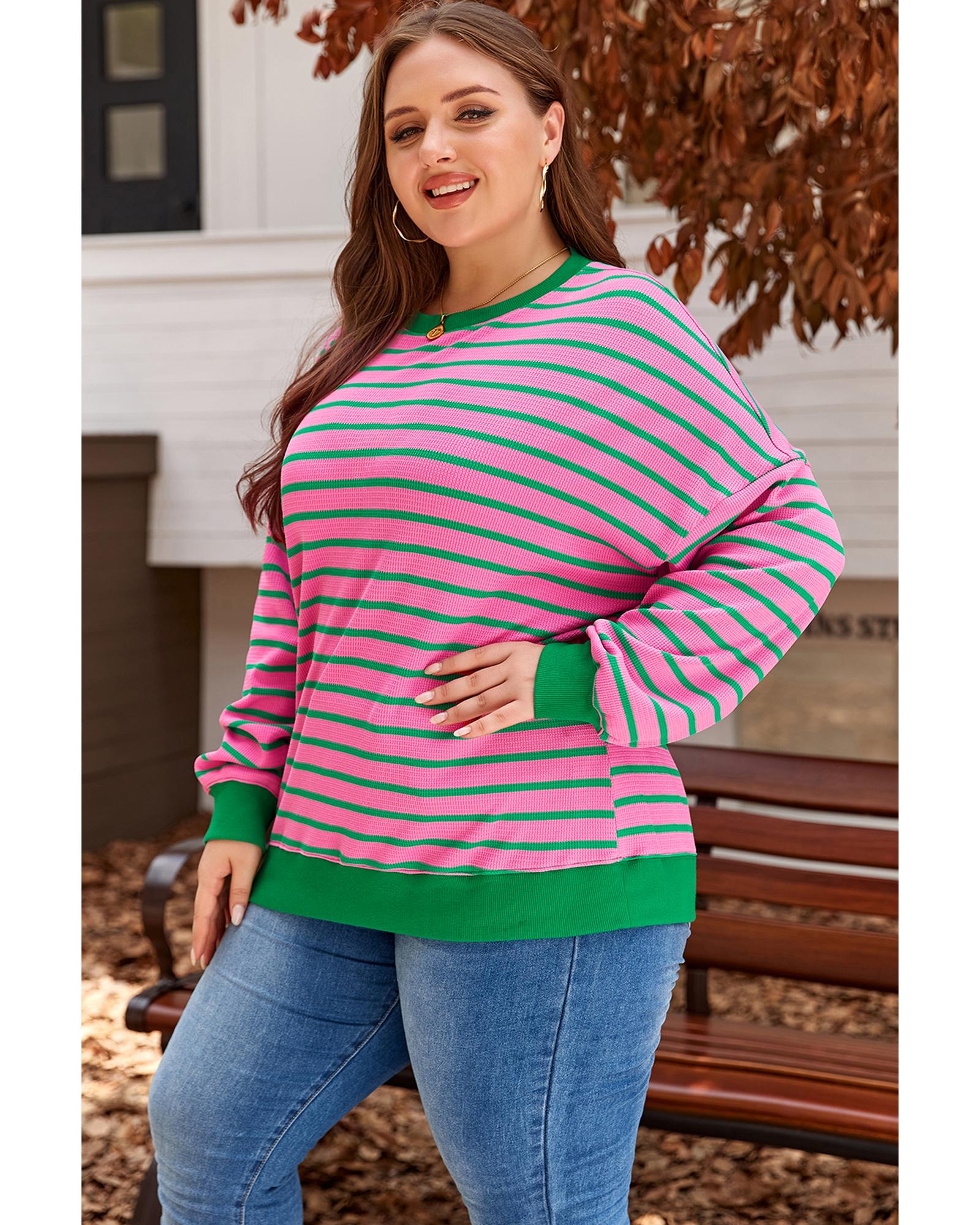 Pink Stripe Waffle Knit Crew Neck Plus Size Sweatshirt – 2X