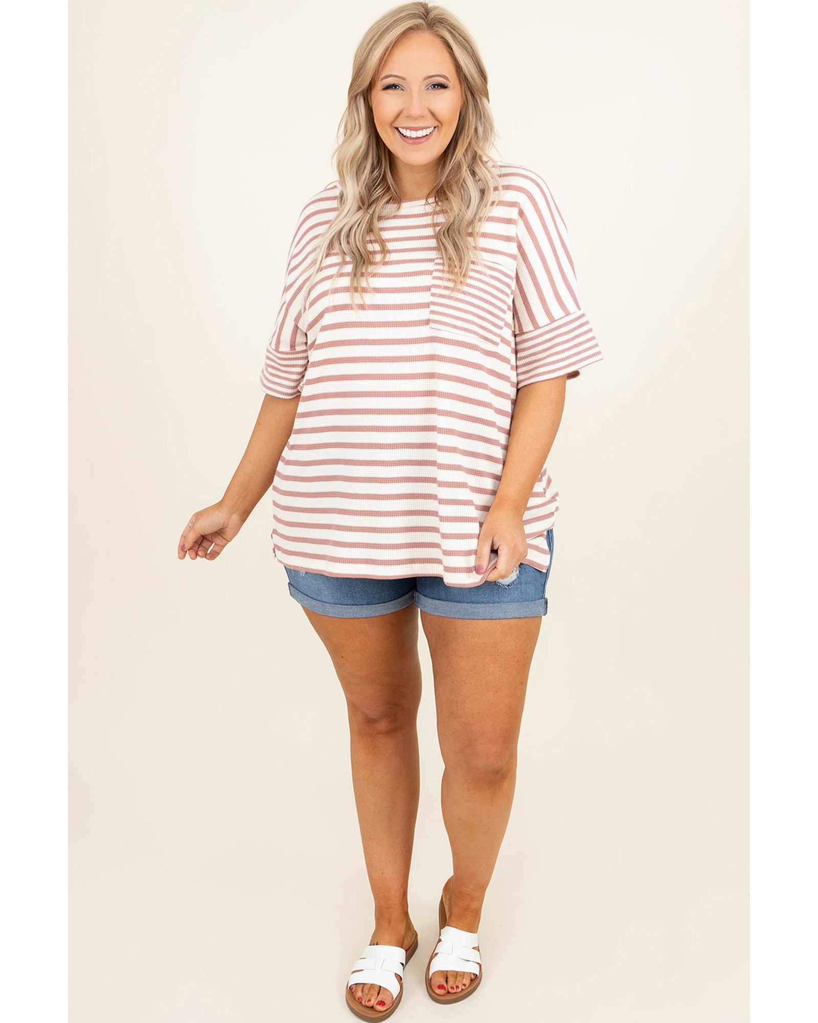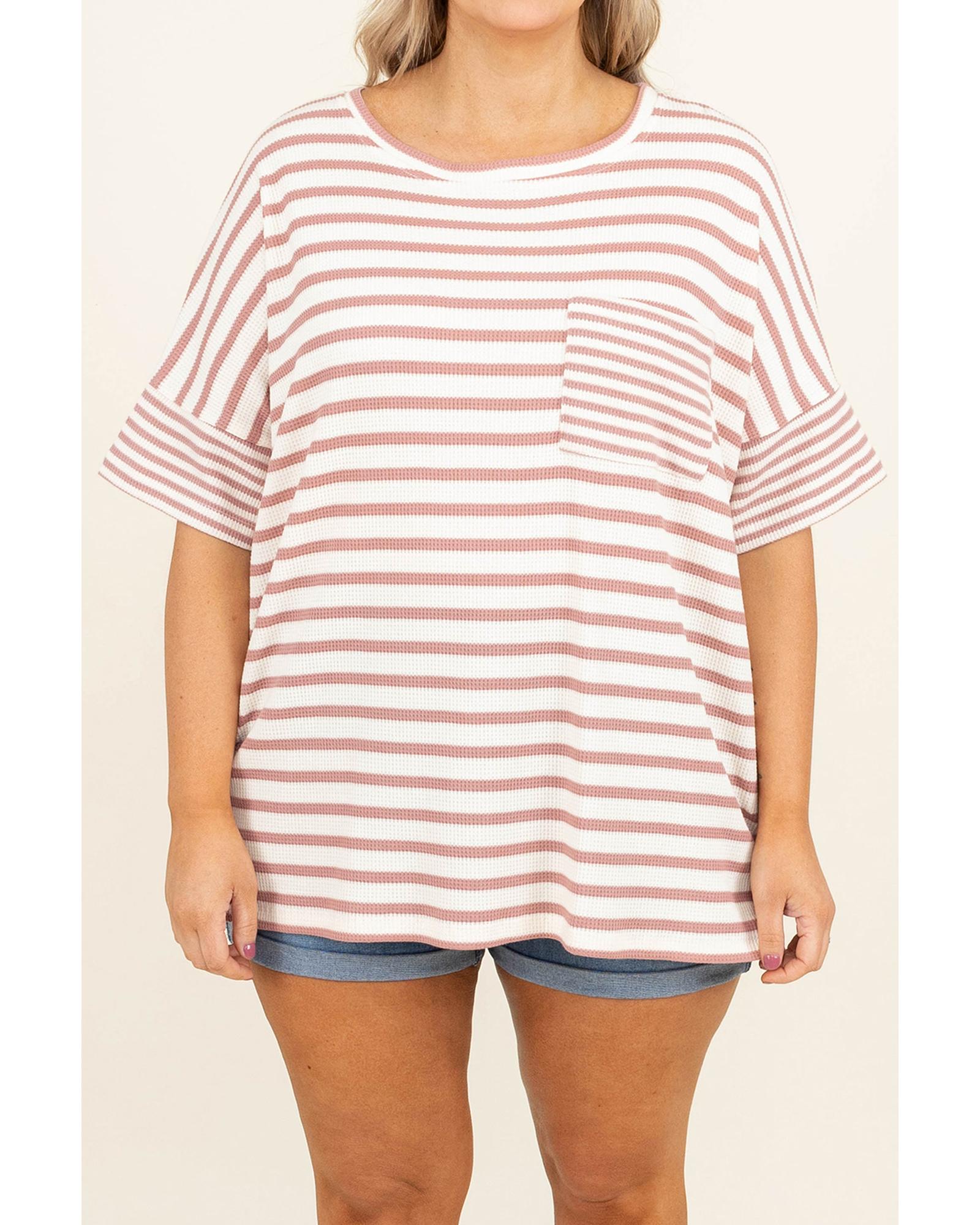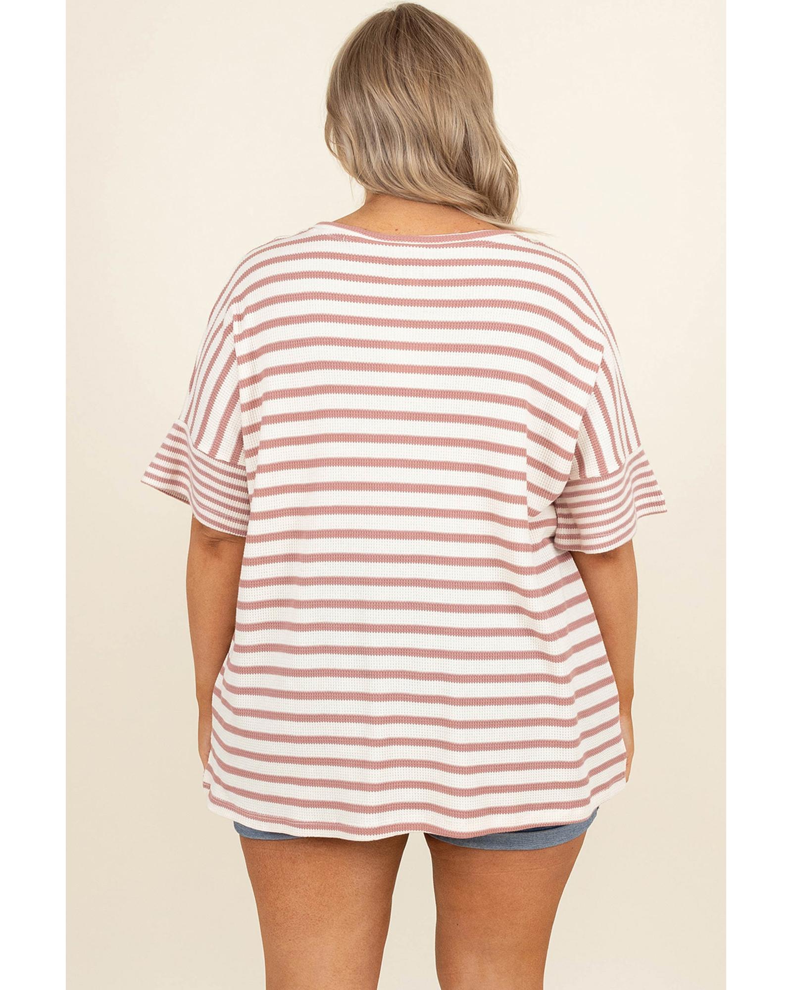 Pink Stripe Waffle Knit Pocketed Half Sleeve Plus Size T Shirt – 4X