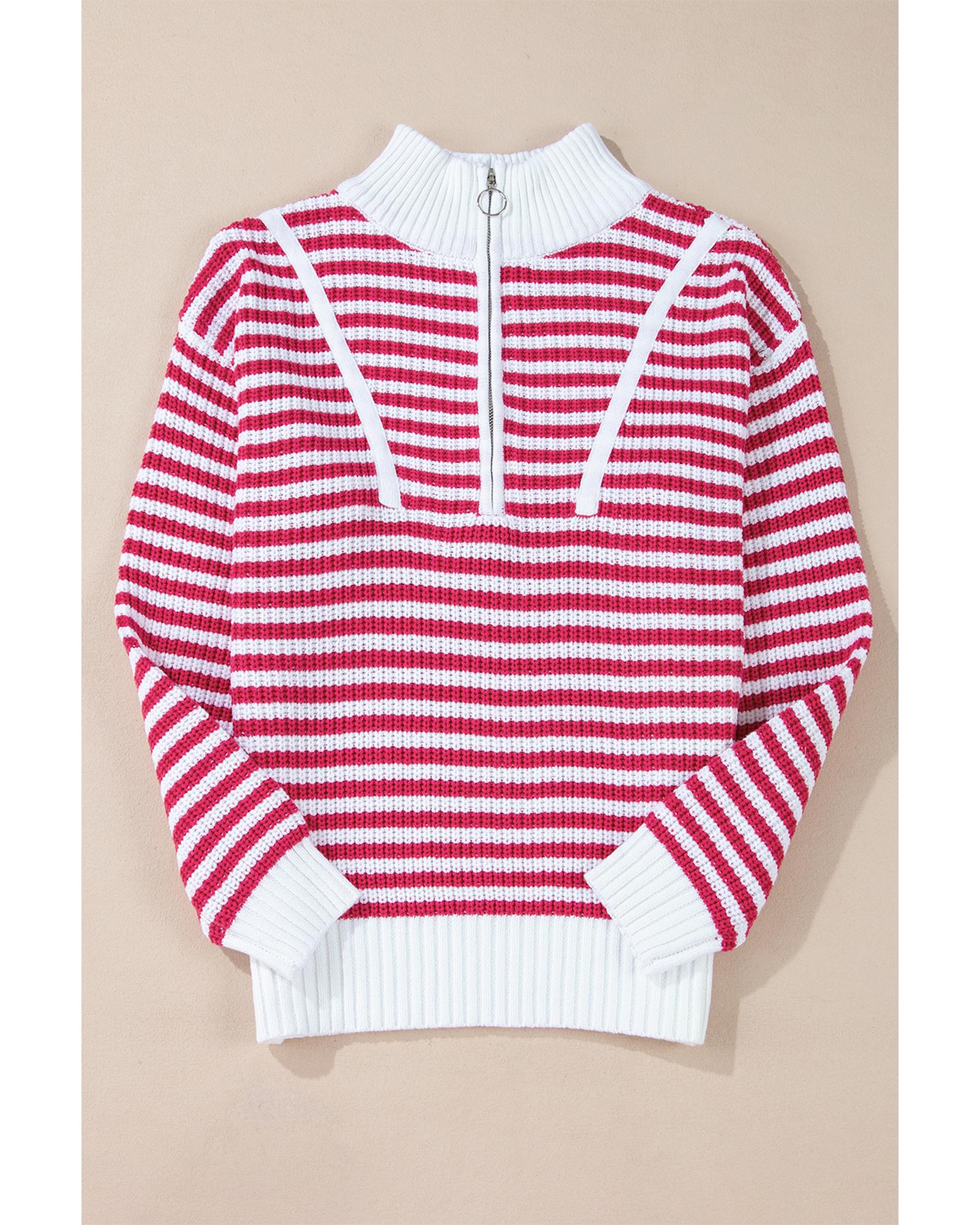 This sweater features a trendy striped design with a stylish zip-up collar, combining modern fashion with comfort. Its relaxed fit and drop shoulder design make it versatile for various occasions, allowing for effortless dressing up or down.