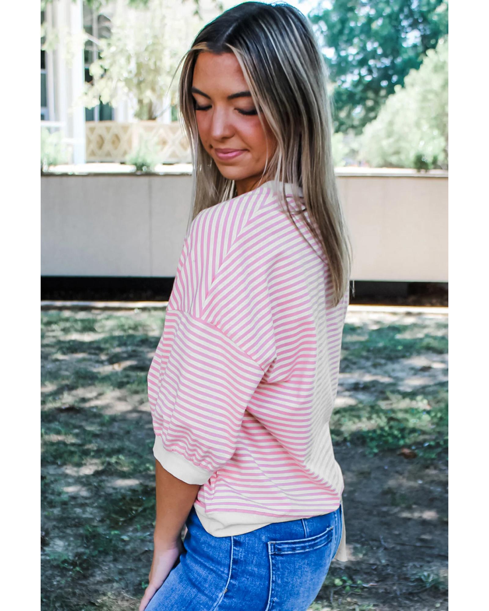 Pink Striped 3/4 Sleeve Drop Shoulder Top – XL