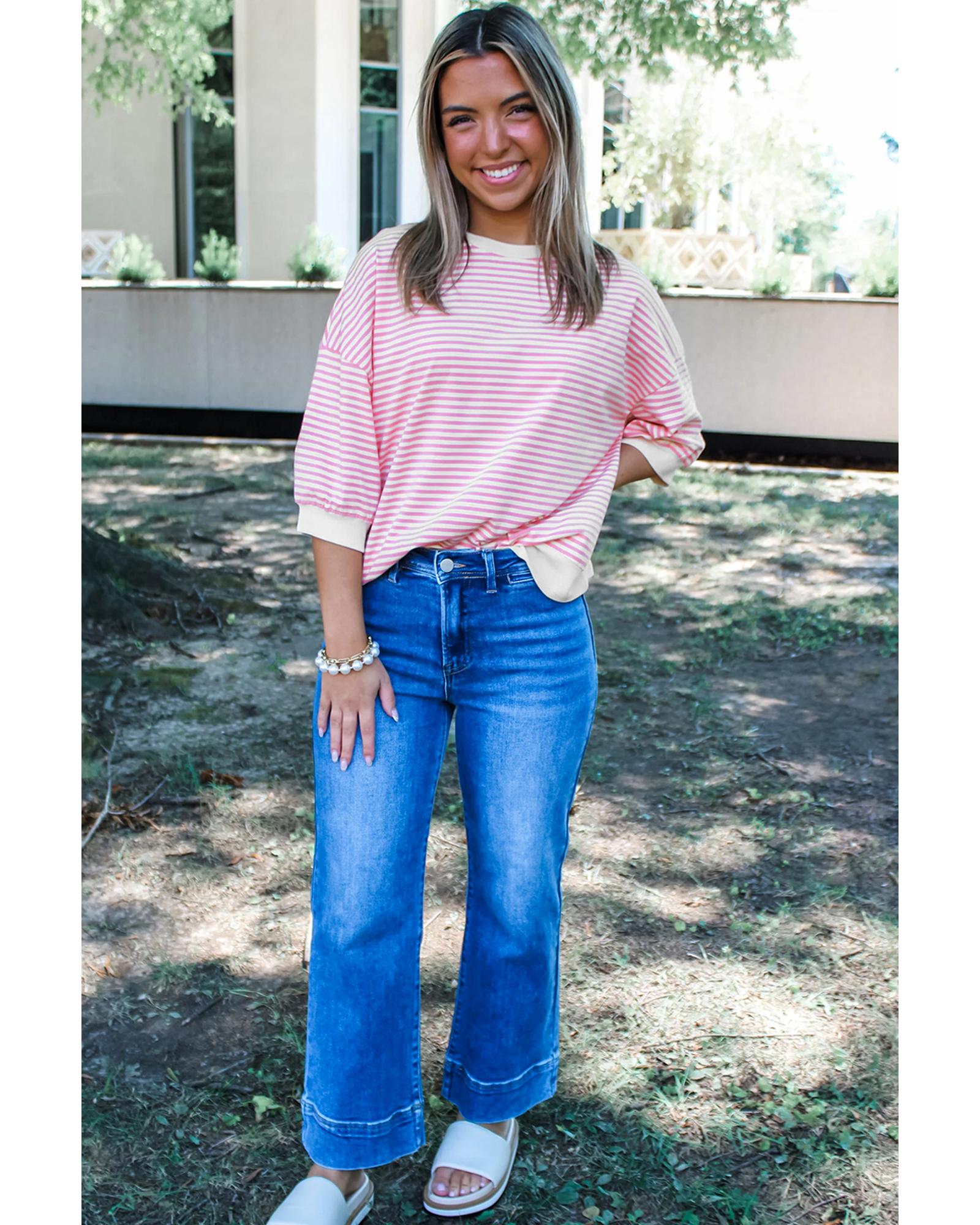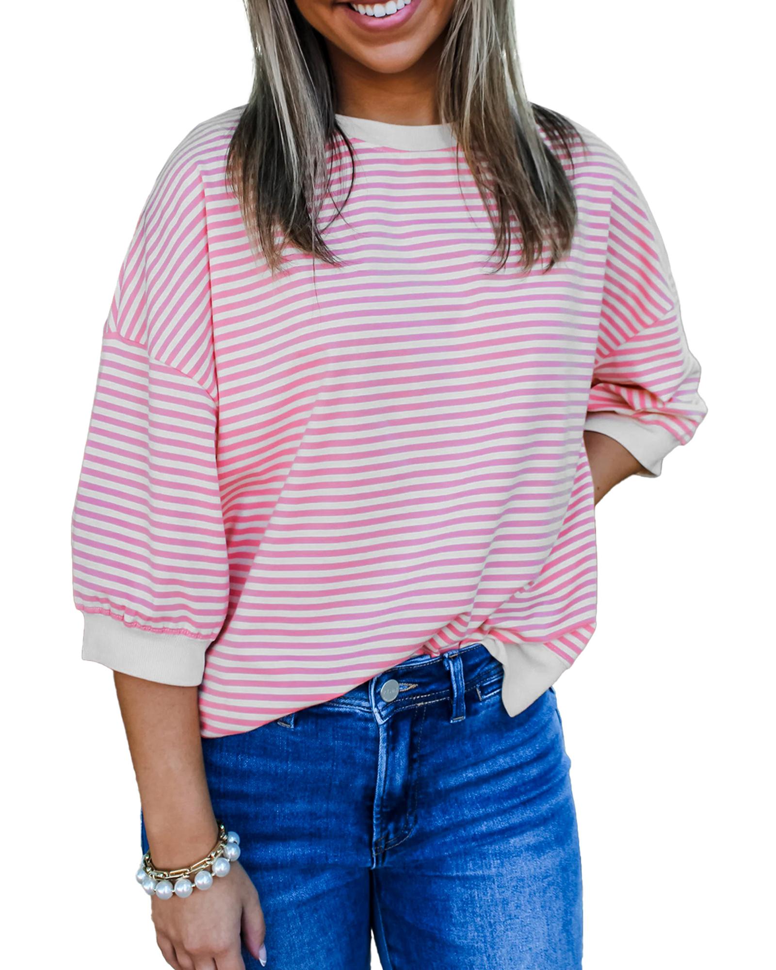 Package Content: 1 Pink Striped 3/4 Sleeve Drop Shoulder Top