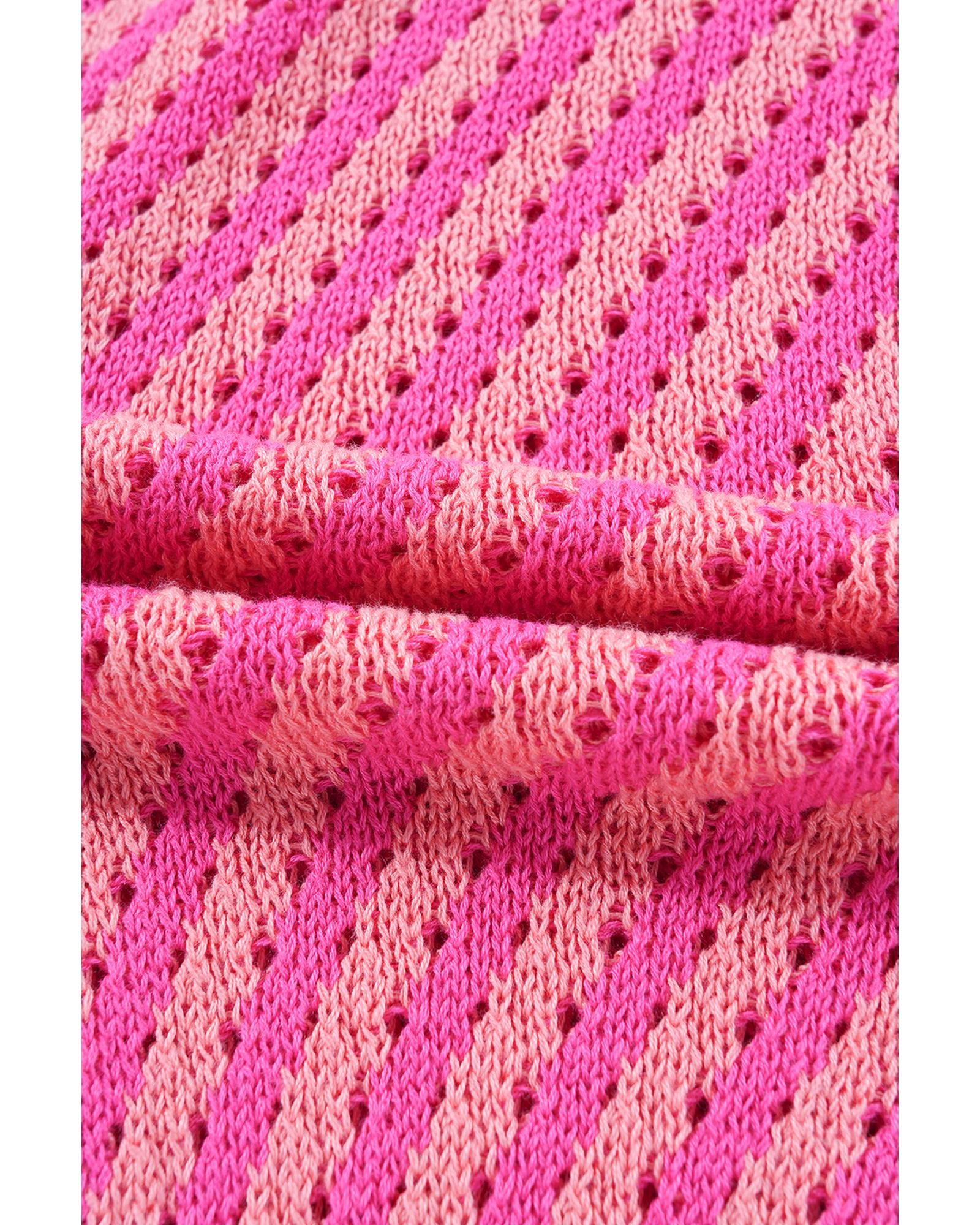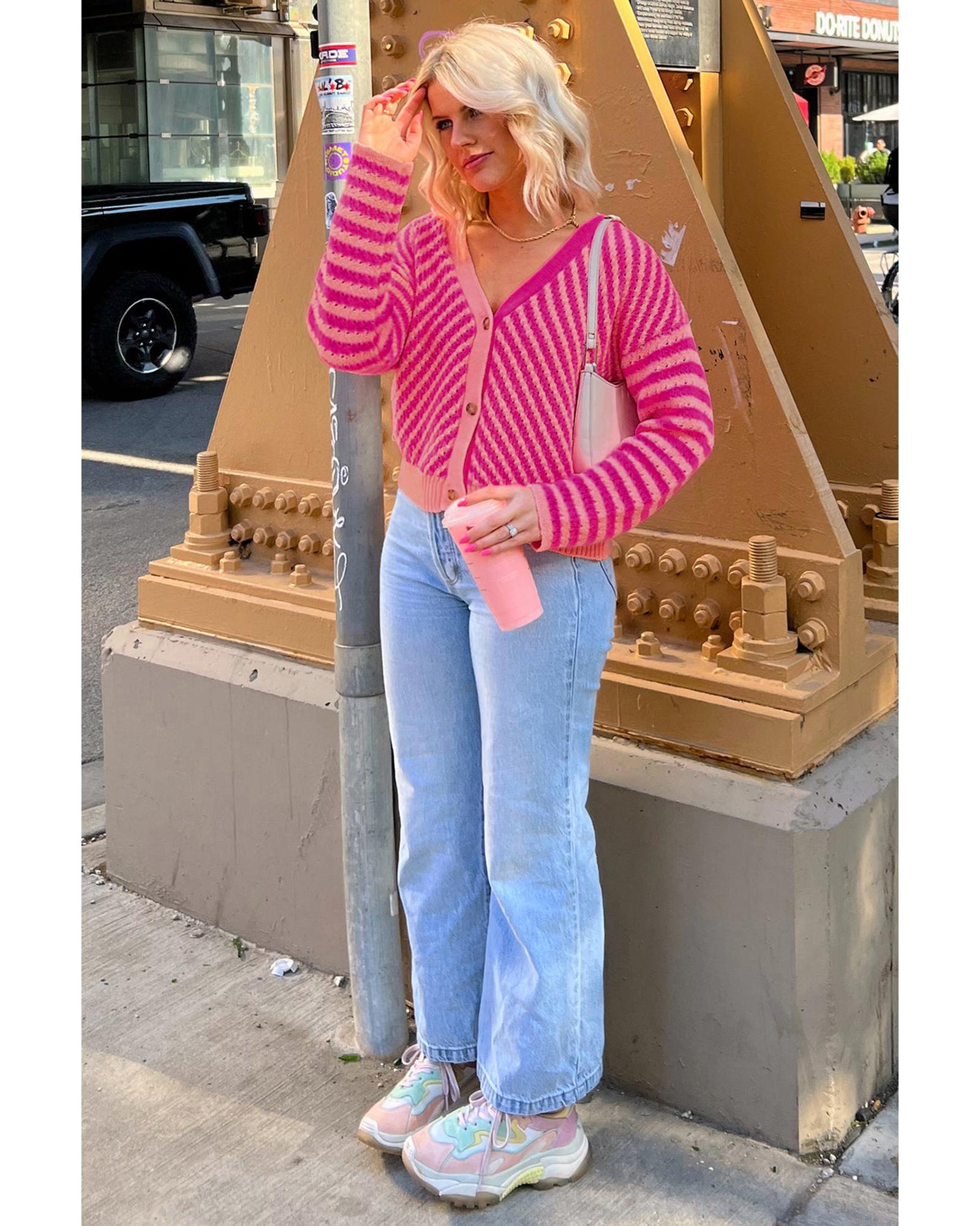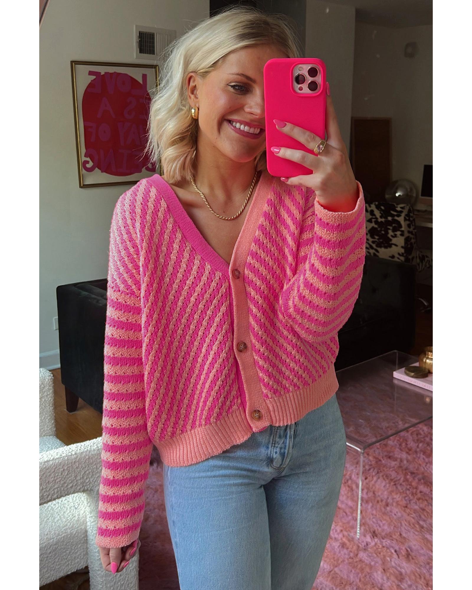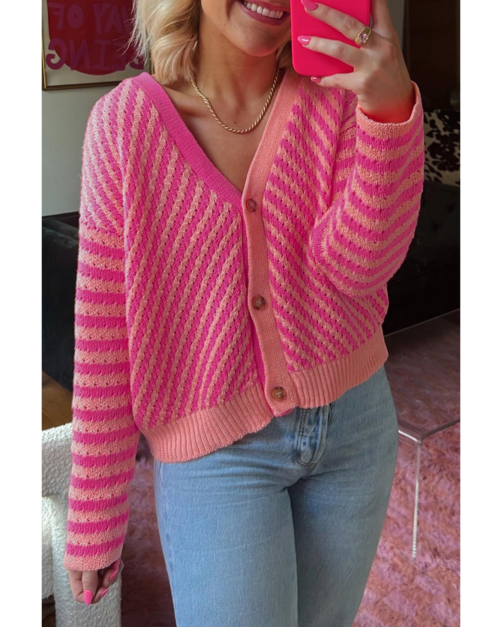 This cardigan features a stylish pink striped pattern with a buttoned V-neck design and a relaxed drop shoulder fit. It offers a classic and versatile look suitable for various occasions, combining comfort with fashionable appeal.