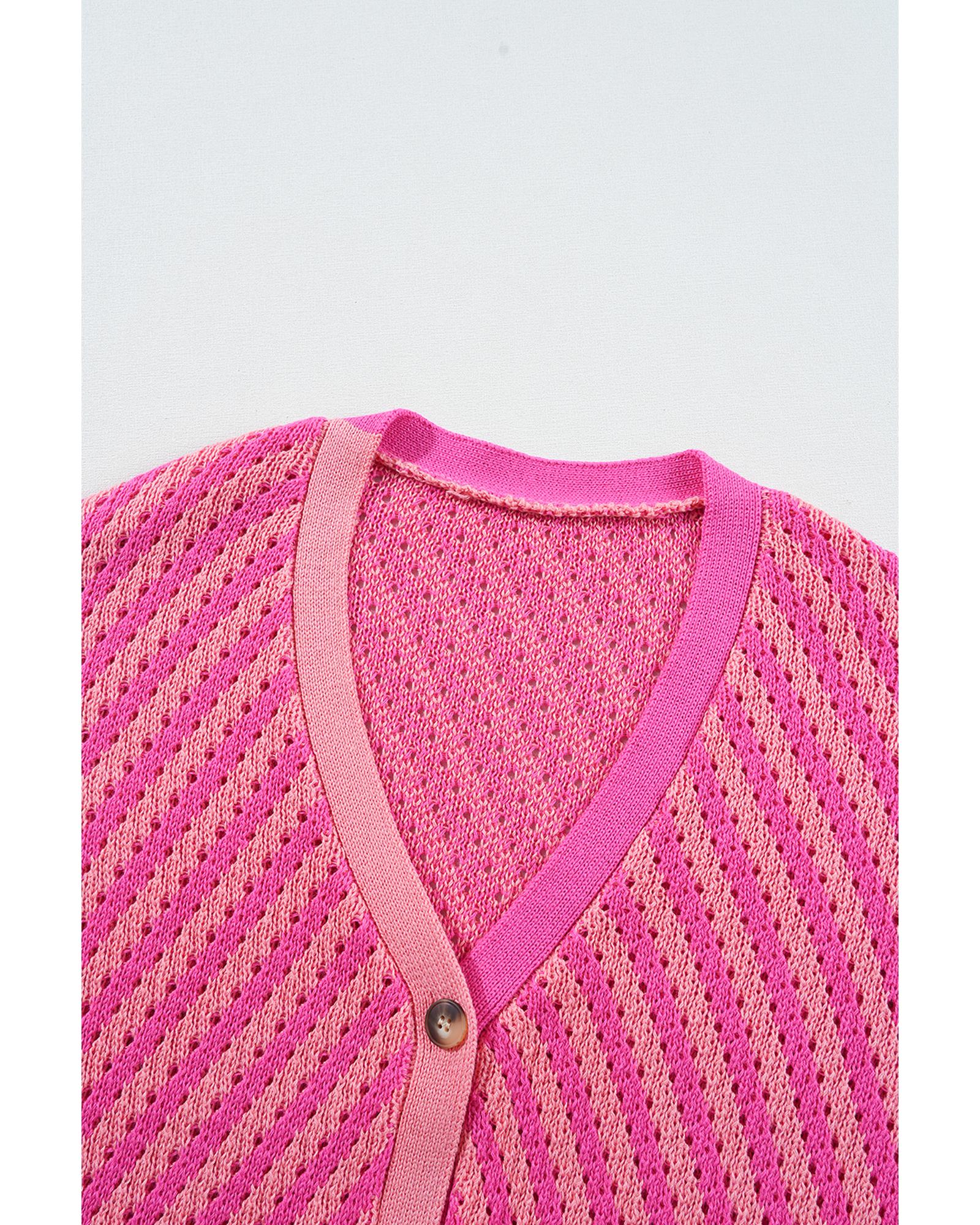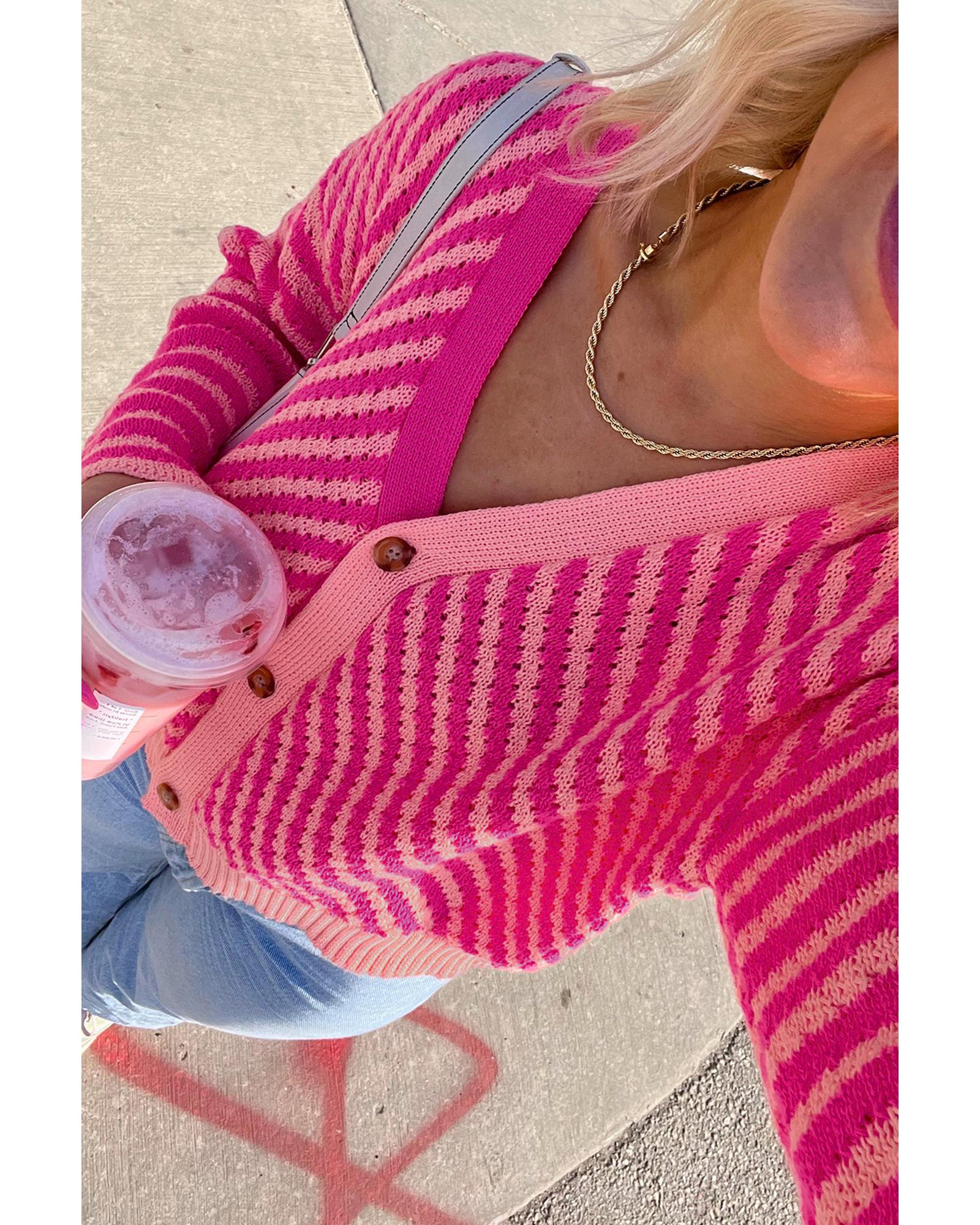 Pink Striped Buttoned V Neck Drop Shoulder Cardigan – S