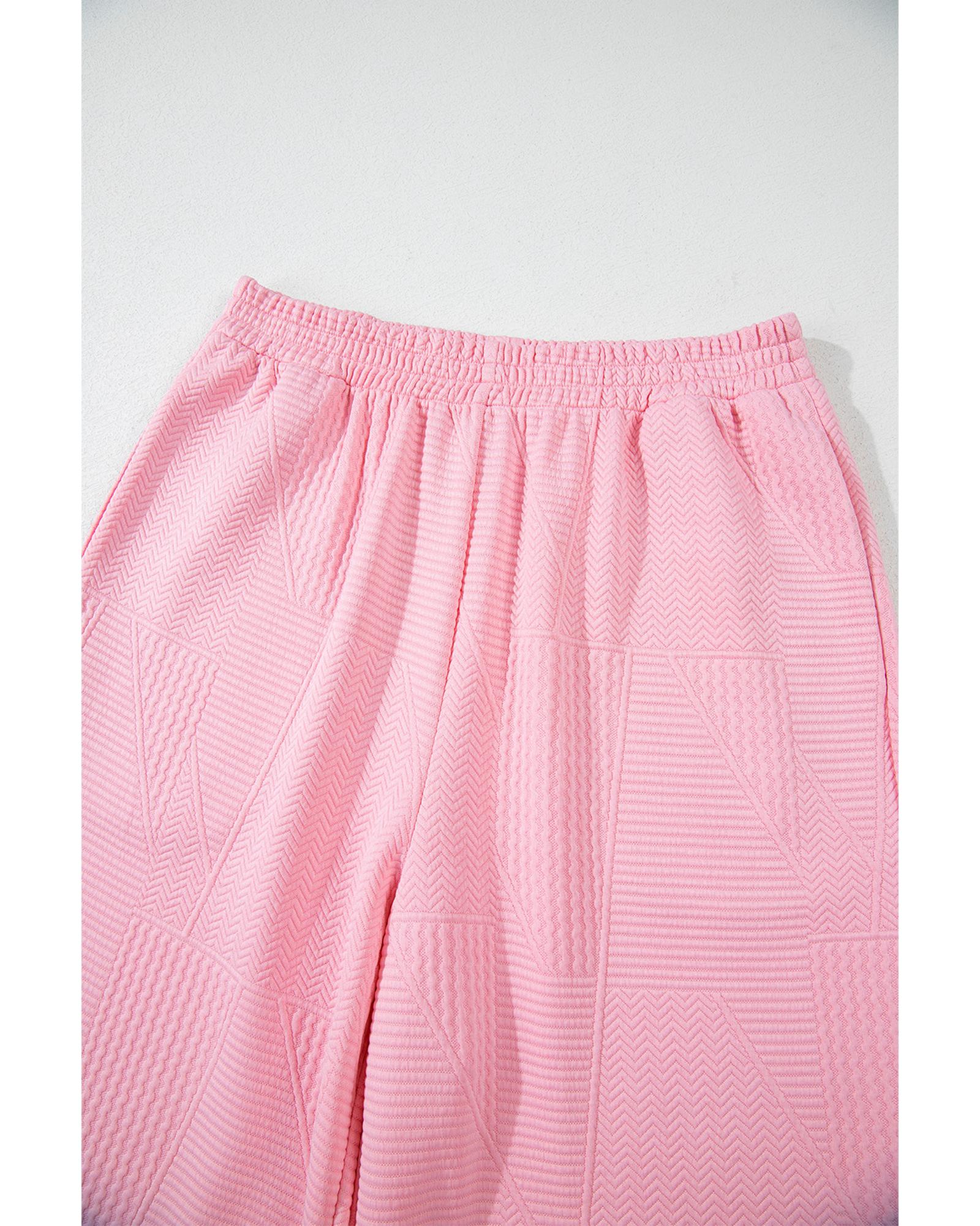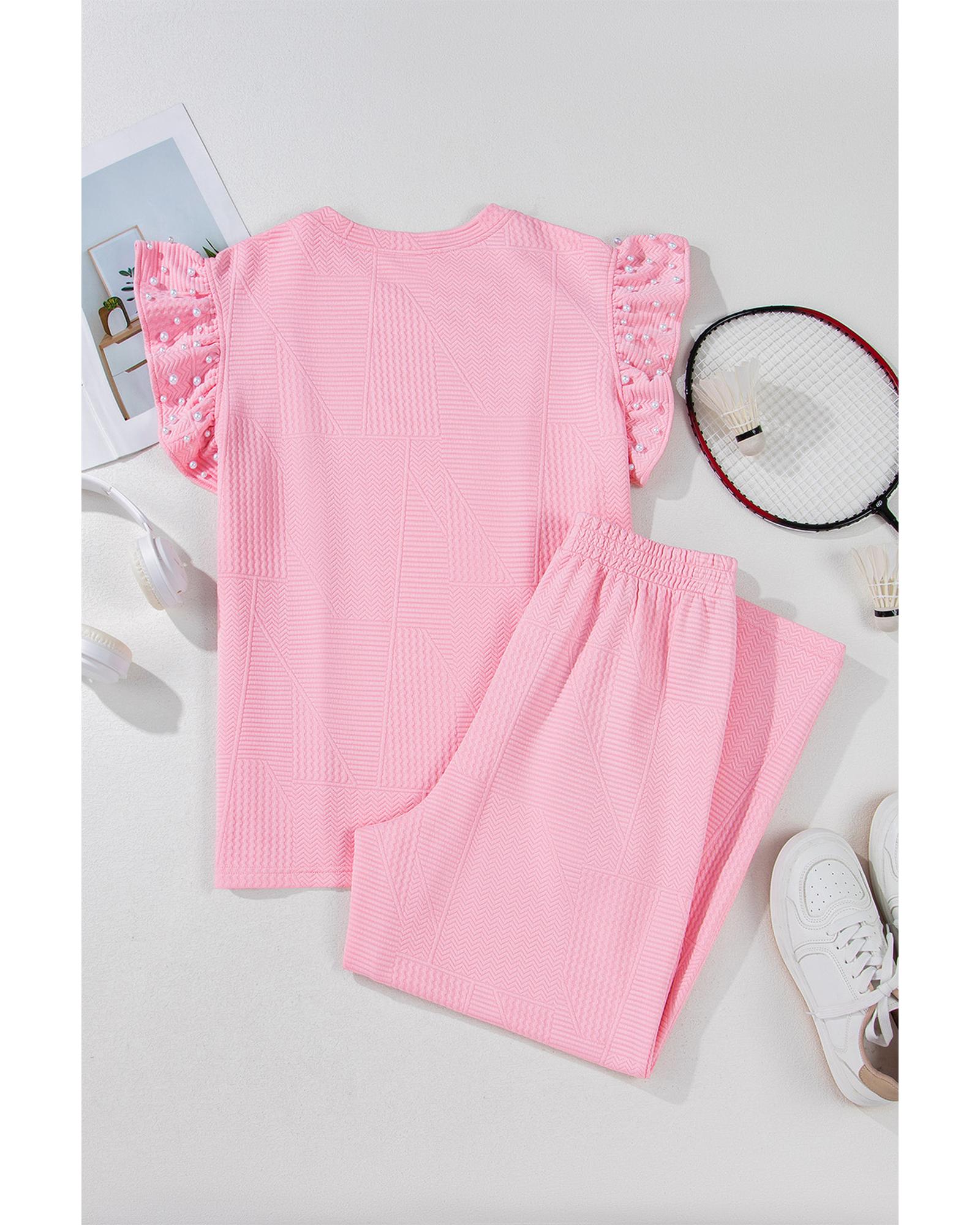 Pink Textured Pearled Ruffled Sleeve Wide Leg Pants Set – L