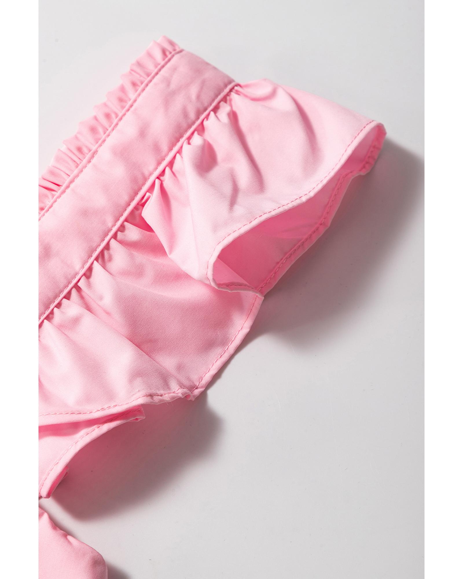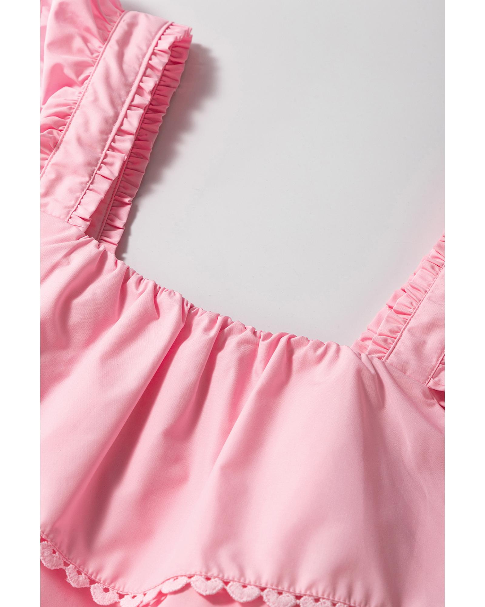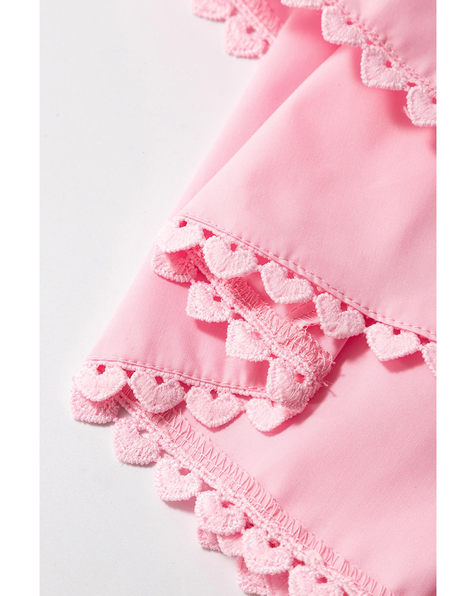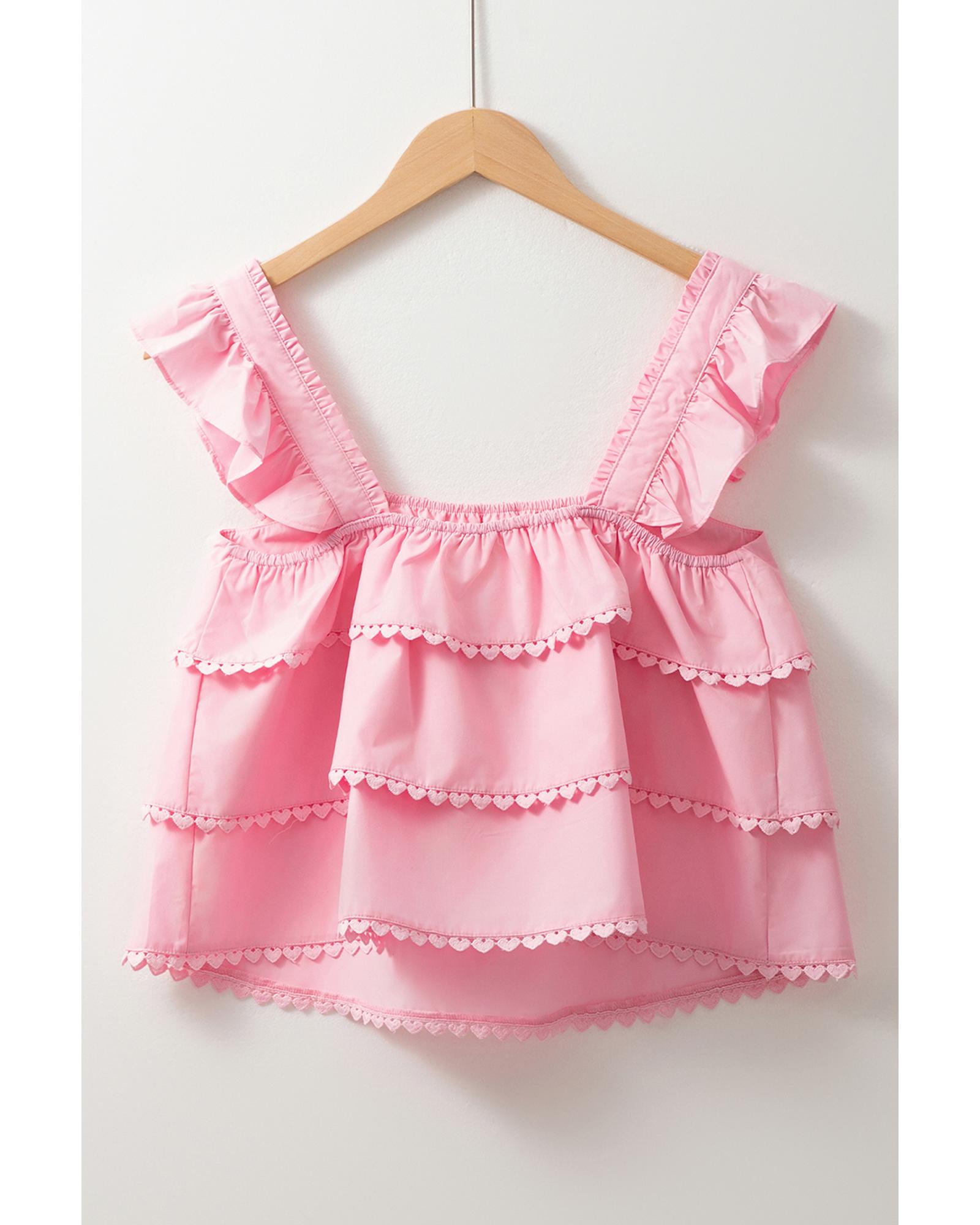 This pink tiered heart trim square neck flutter top features a stylish babydoll silhouette with flutter shoulder details and a tiered heart trim design. Its versatile style makes it suitable for pairing with solid pants, skirts, or shorts, perfect for casual or semi-casual occasions.