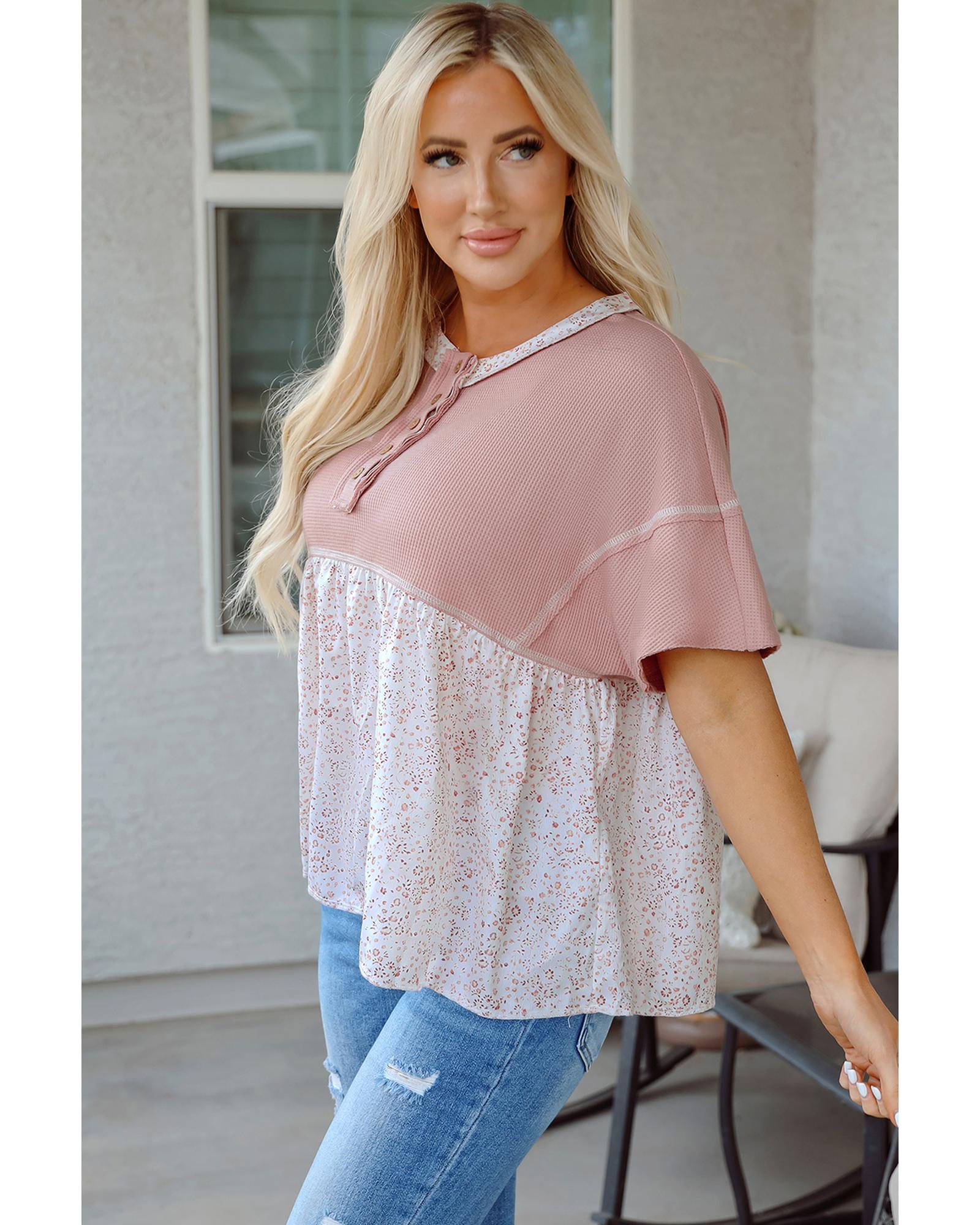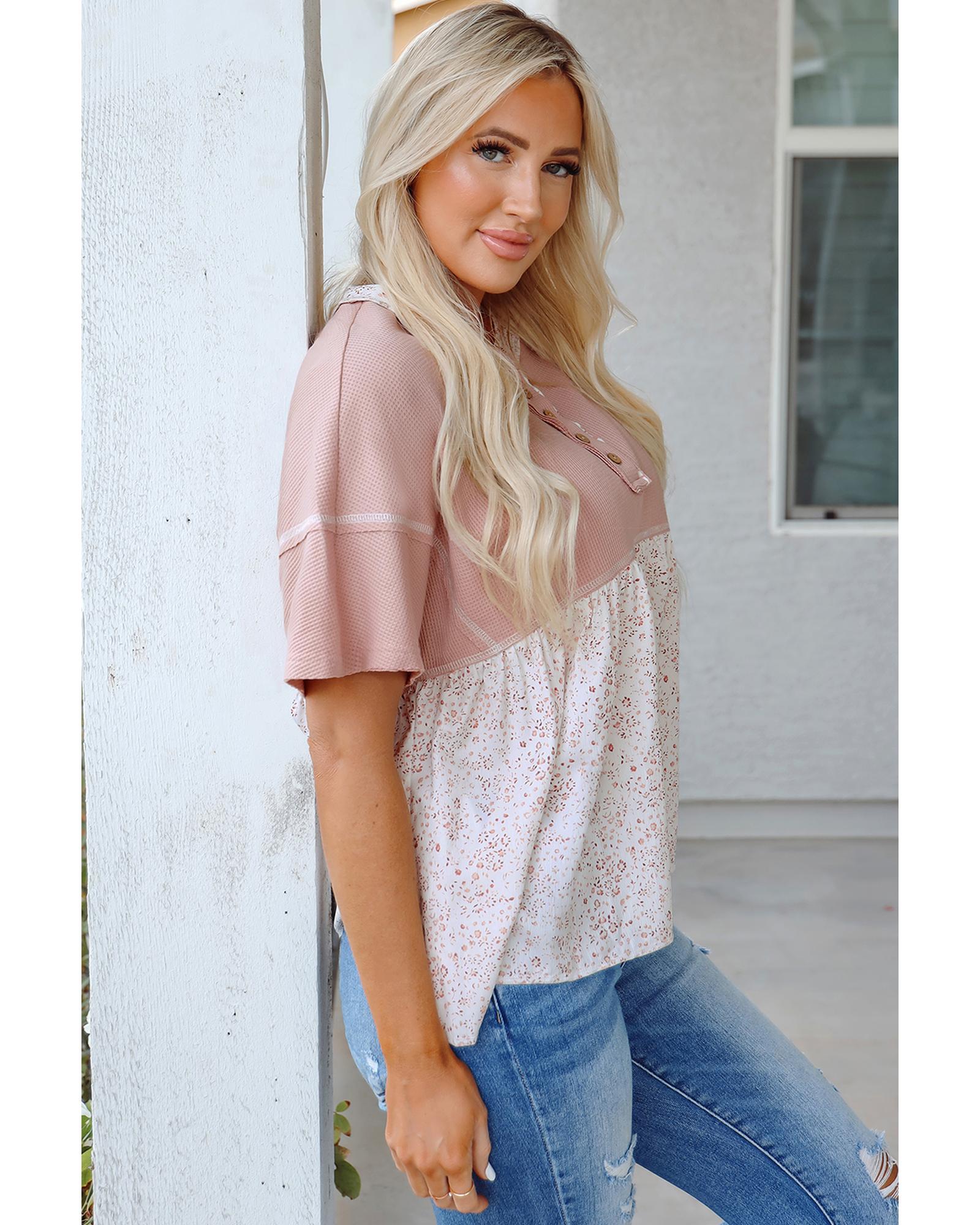 Pink Waffle Floral Patchwork Exposed Seam Detail Short Sleeve Top – M