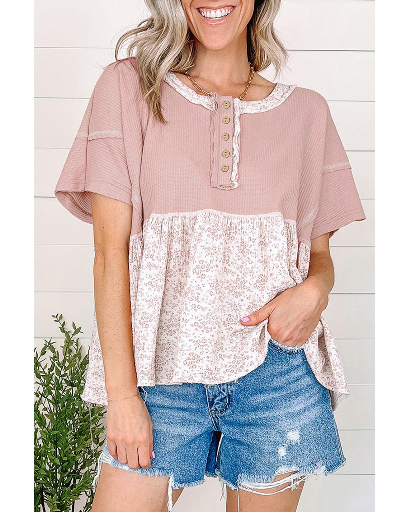 This short sleeve top features a floral crinkled patchwork design combined with a waffle knit fabric, creating a stylish and textured appearance. The exposed seam detail adds an edgy touch to the overall look, making it suitable for casual wear. Designed for comfort, it offers a breathable fit that pairs well with jeans for a relaxed and fashionable style.