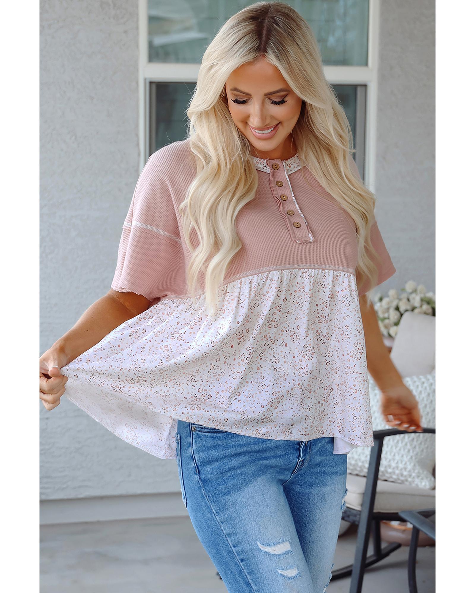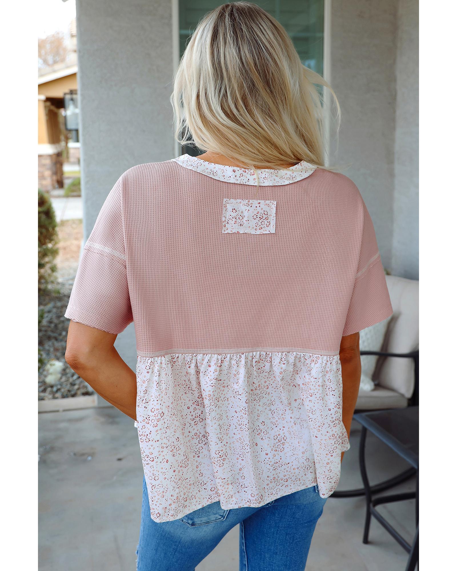Pink Waffle Floral Patchwork Exposed Seam Detail Short Sleeve Top – XL