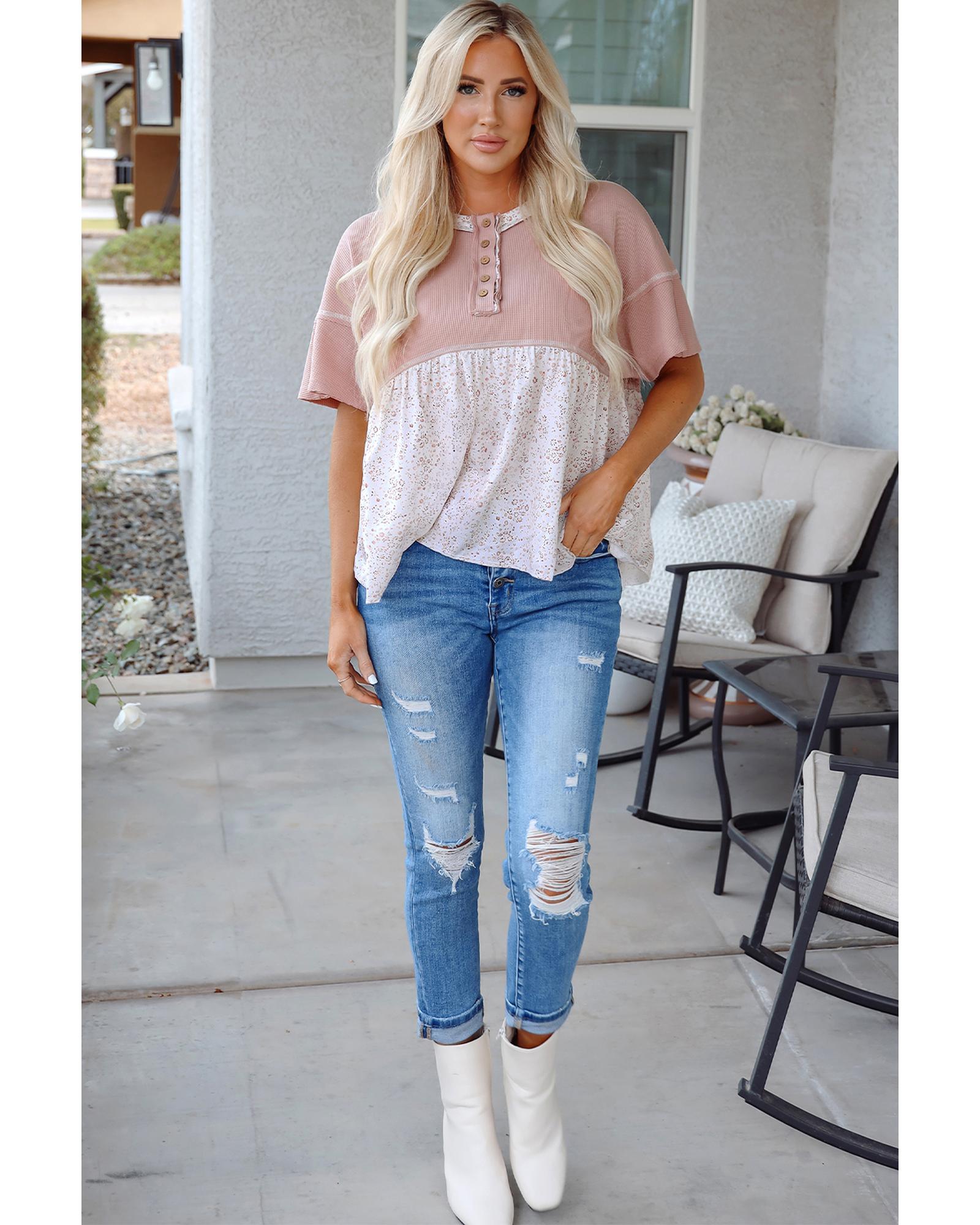 This short sleeve top features a floral crinkled patchwork design combined with a waffle knit fabric, creating a stylish and textured appearance. The exposed seam detail adds an edgy touch, making it a versatile piece for casual wear. Designed for comfort, it offers a breathable fit that pairs well with jeans for a relaxed and fashionable look.
