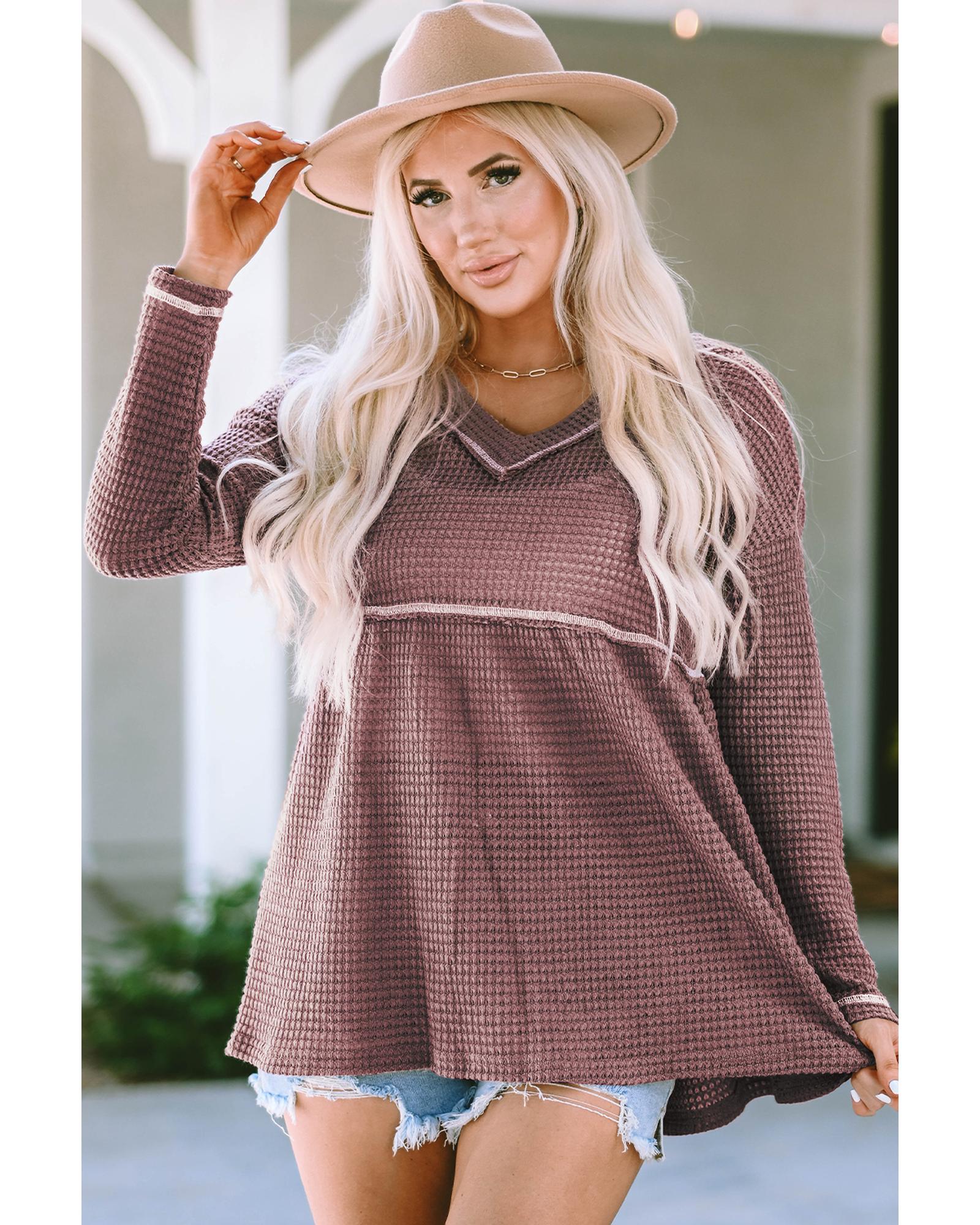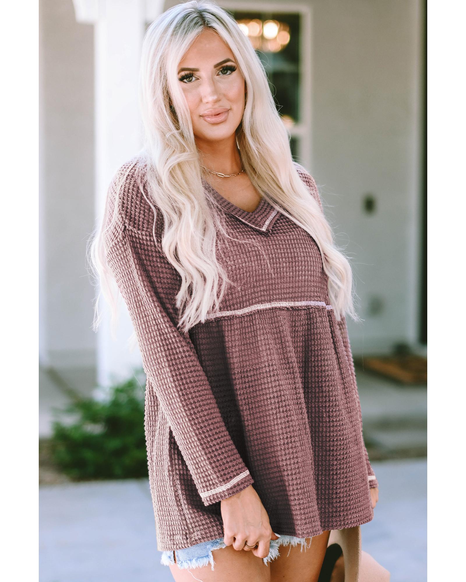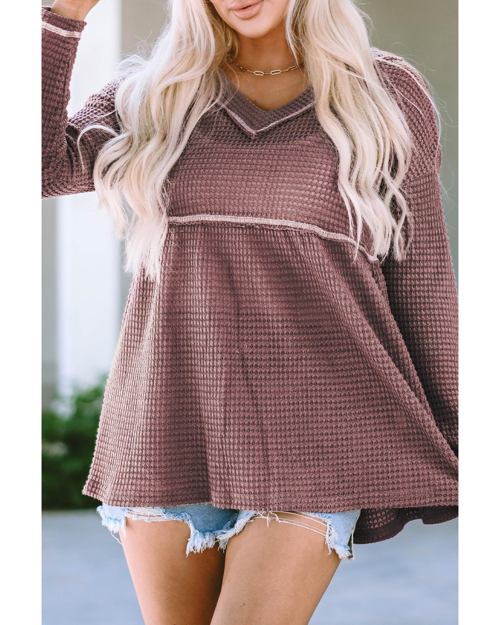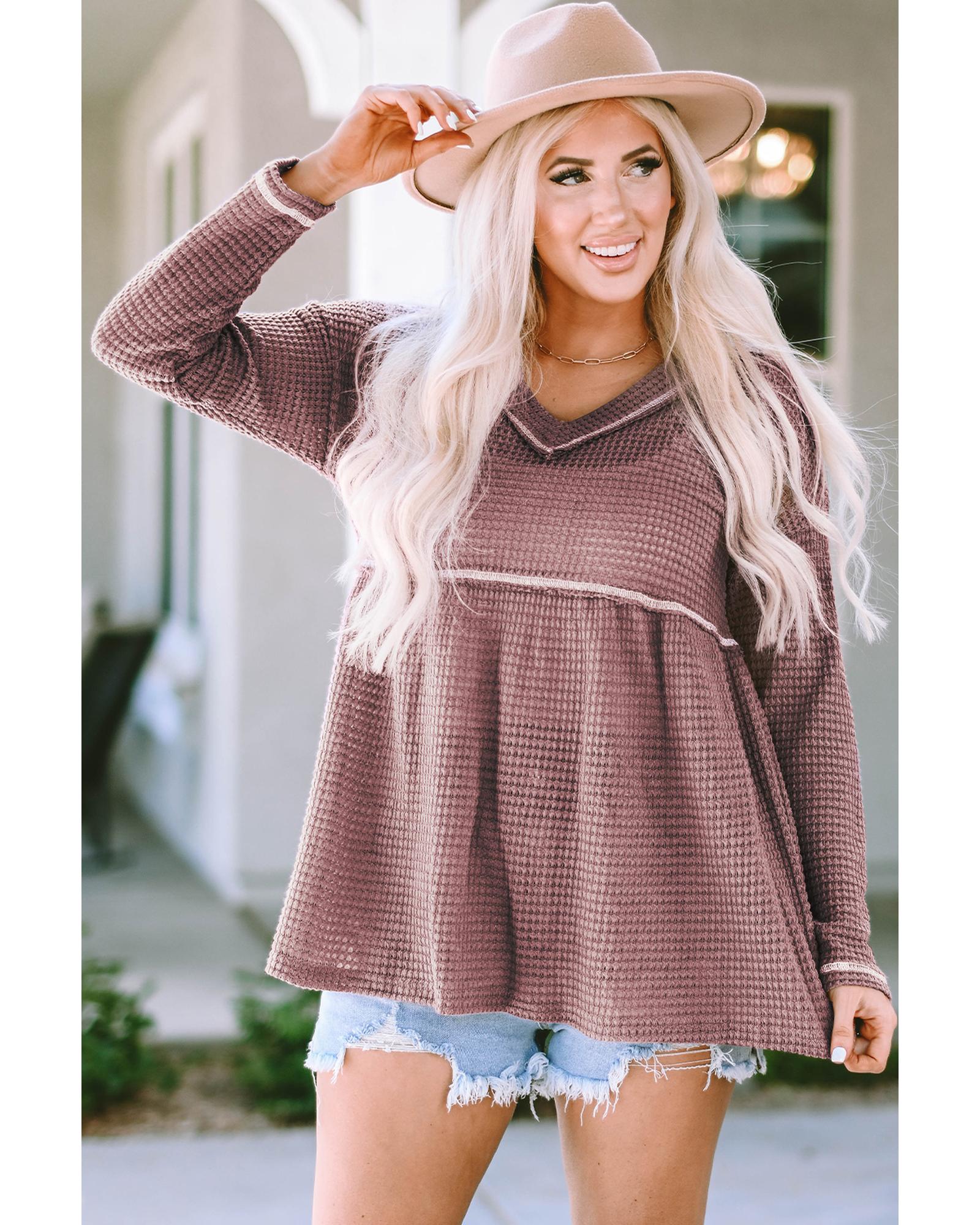 This pink waffle knit V-neck long sleeve babydoll top offers a trendy fitted look with a comfortable and cozy feel. Its versatile design makes it suitable for various occasions and easy to pair with different bottoms, providing understated elegance and a flattering silhouette.