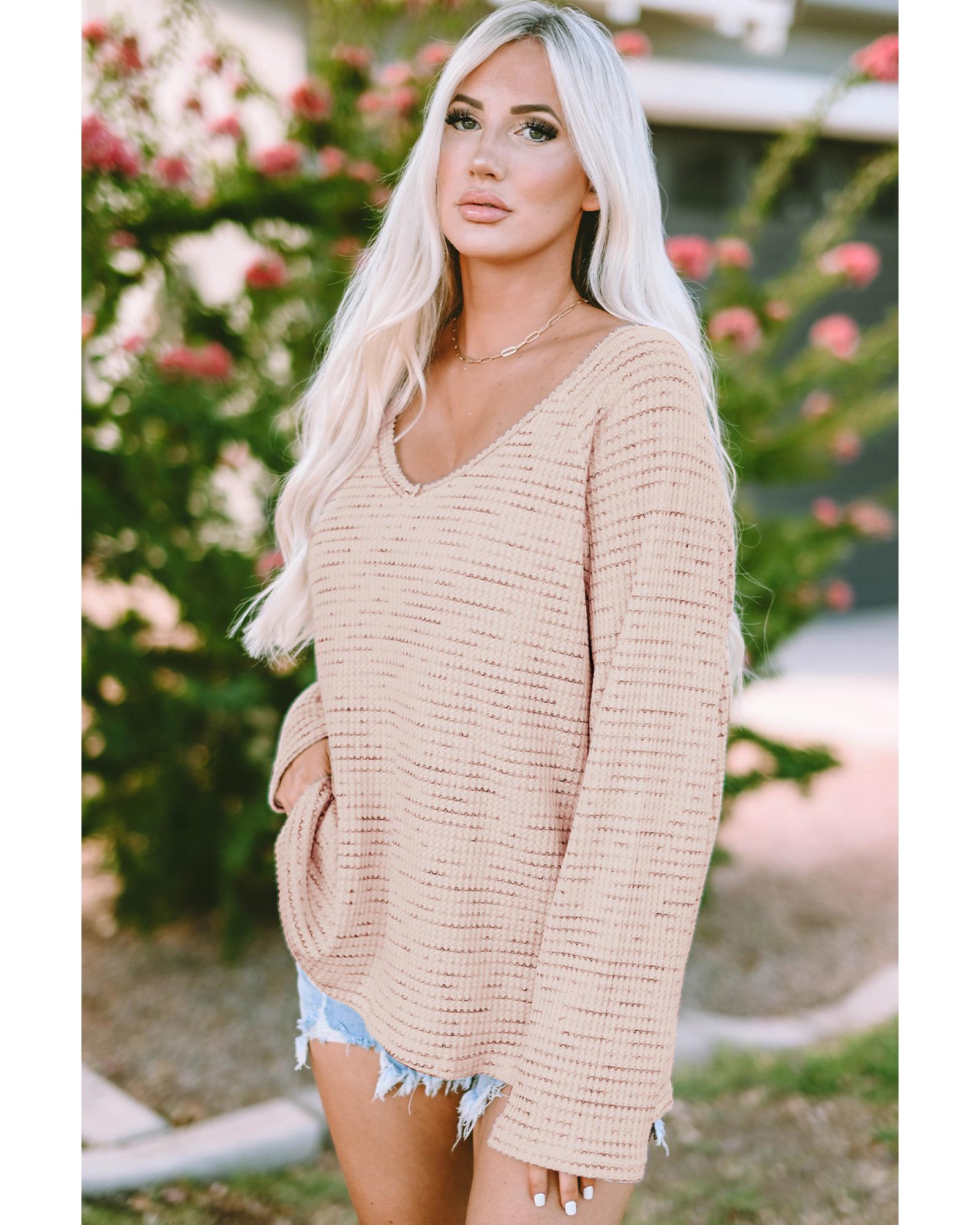 This long sleeve V-neck top features a trendy waffle knit design with frayed details, offering a versatile style suitable for both casual and formal occasions. Its comfortable fit and solid color make it a stylish addition to any wardrobe.