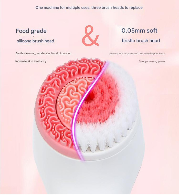 - Three interchangeable brush heads including silicone and soft bristle options for different skin needs