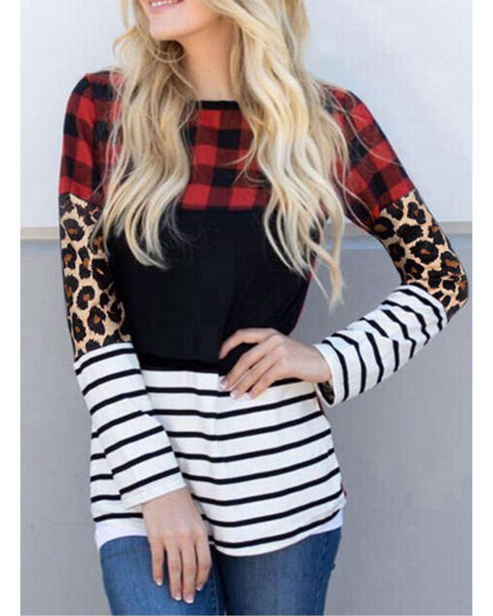 This long sleeve top features a trendy plaid print combined with leopard splicing and striped color blocking, creating a bold and fashionable look. Designed with a fitted silhouette, it offers a stylish and comfortable fit suitable for various casual occasions.