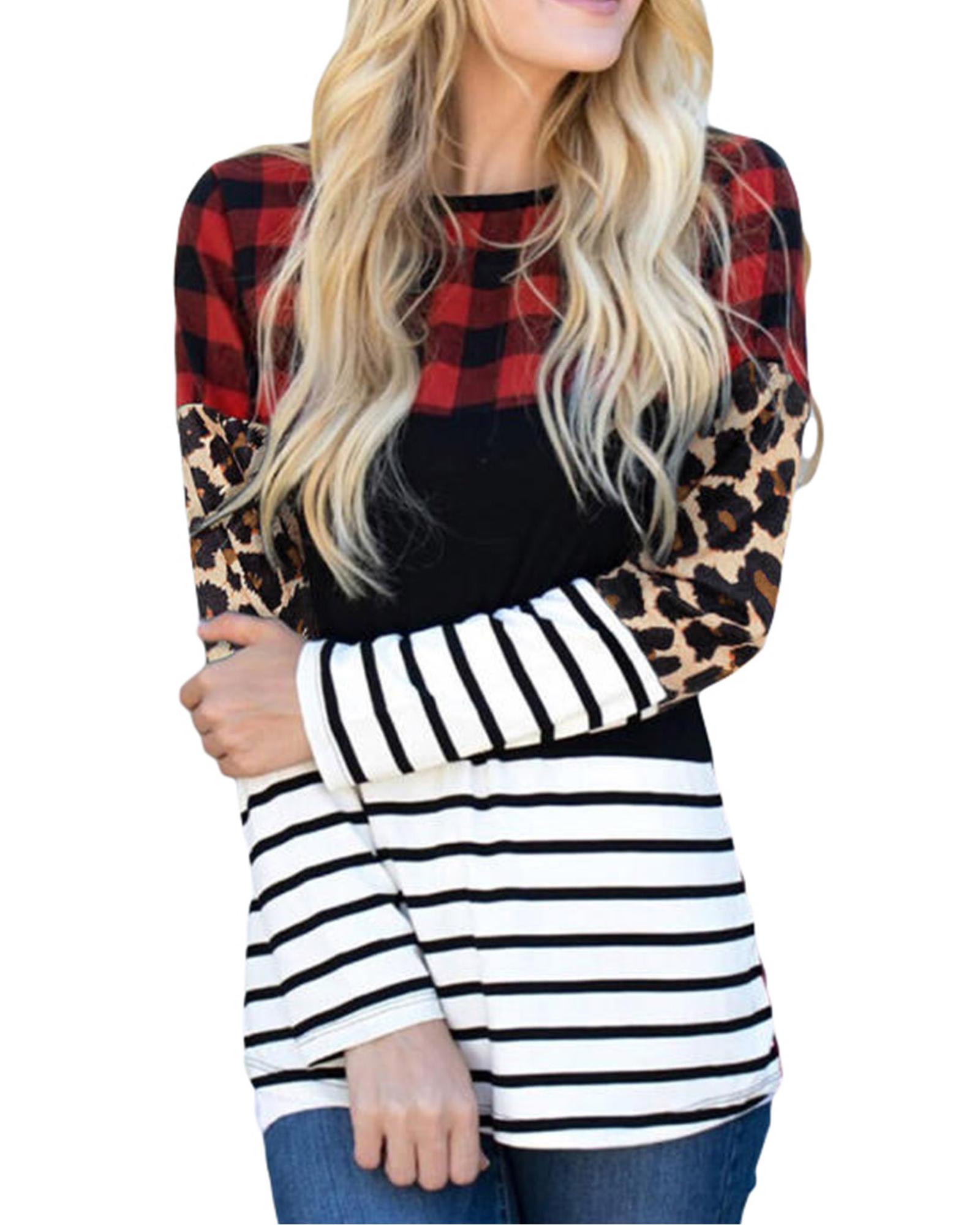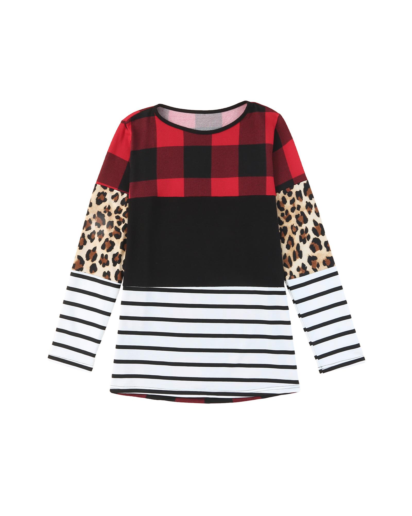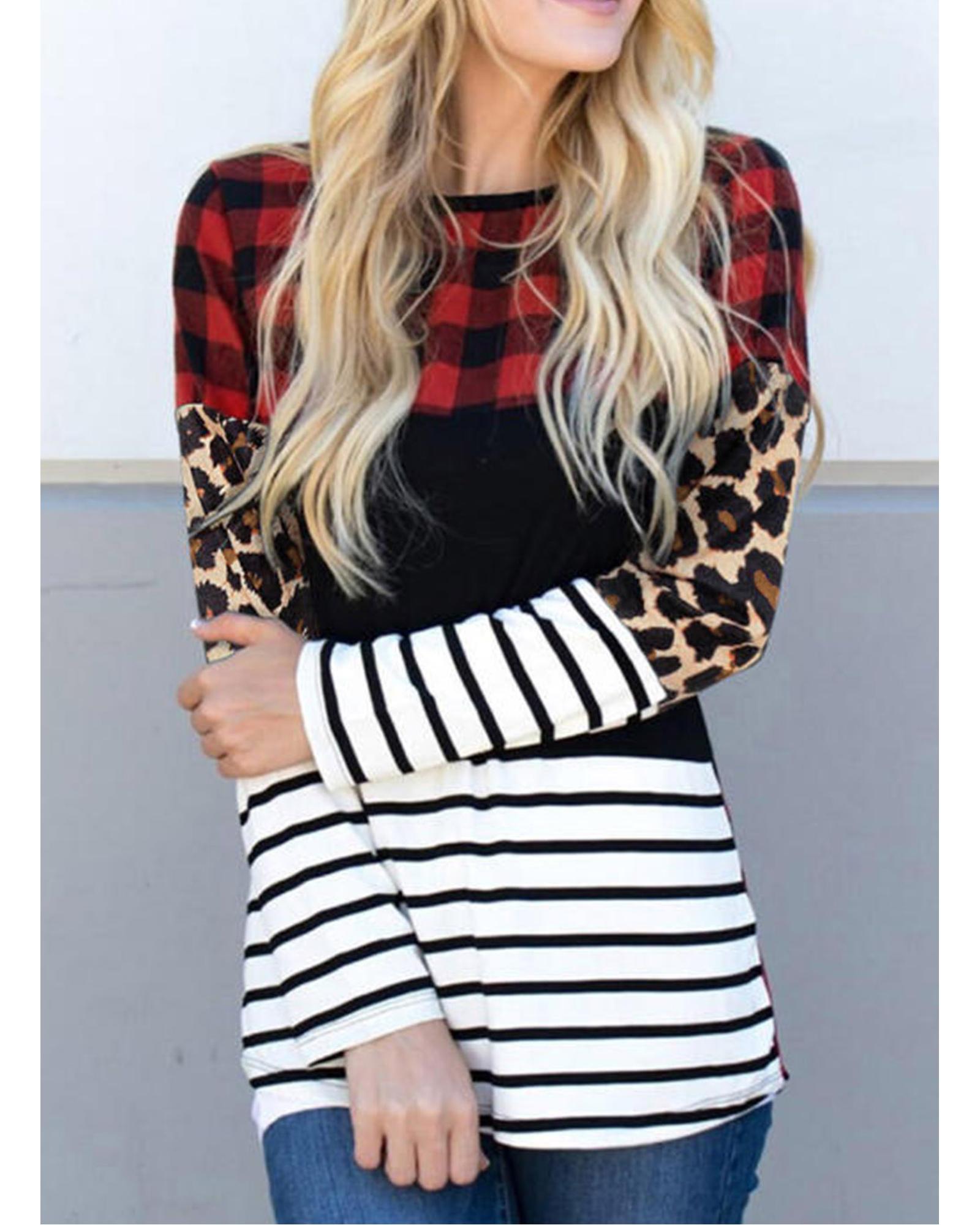 This long sleeve top features a trendy plaid print combined with leopard splicing and striped color blocking, creating a bold and fashionable look. Designed with a fitted silhouette, it offers a stylish and comfortable fit suitable for various casual occasions.