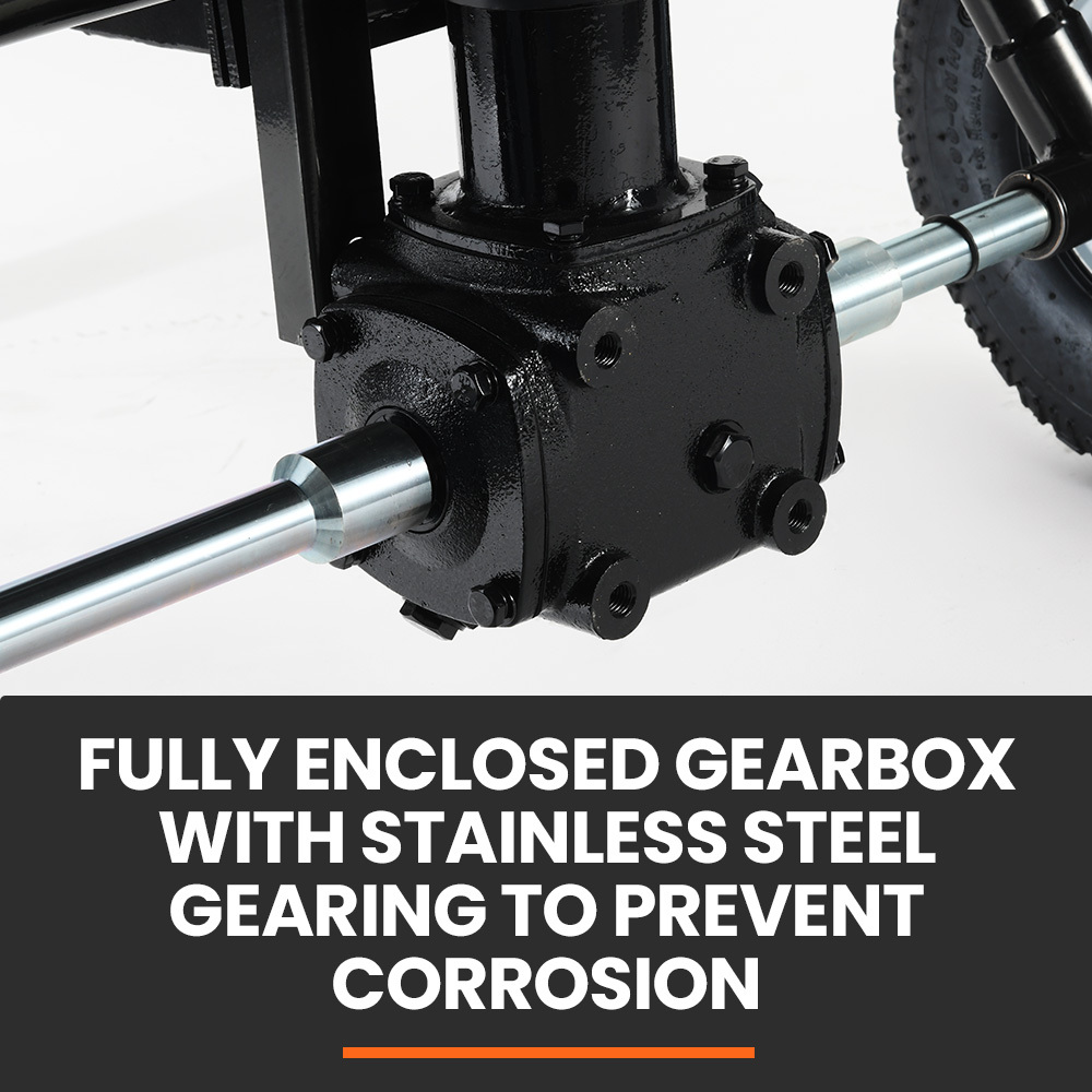 - Heavy-duty high carbon steel gears with a cast iron, oil-filled gearbox