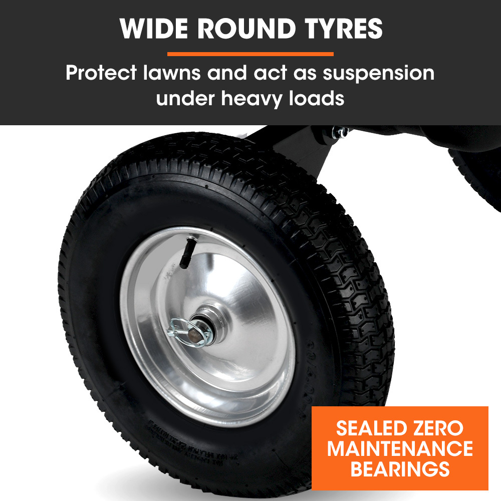 - Pneumatic 16-inch tyres with 4-inch tread width, suitable for rough terrain and turf surfaces