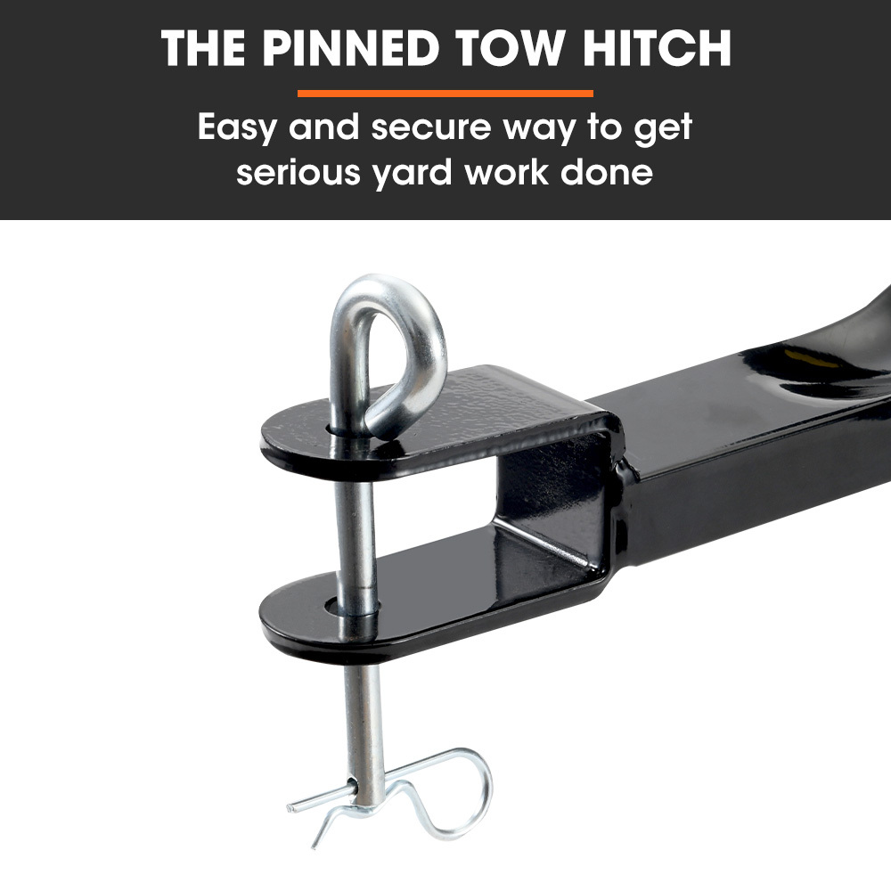 - Pin-style hitch compatible with lawn tractors, ride-on mowers, and some ATVs