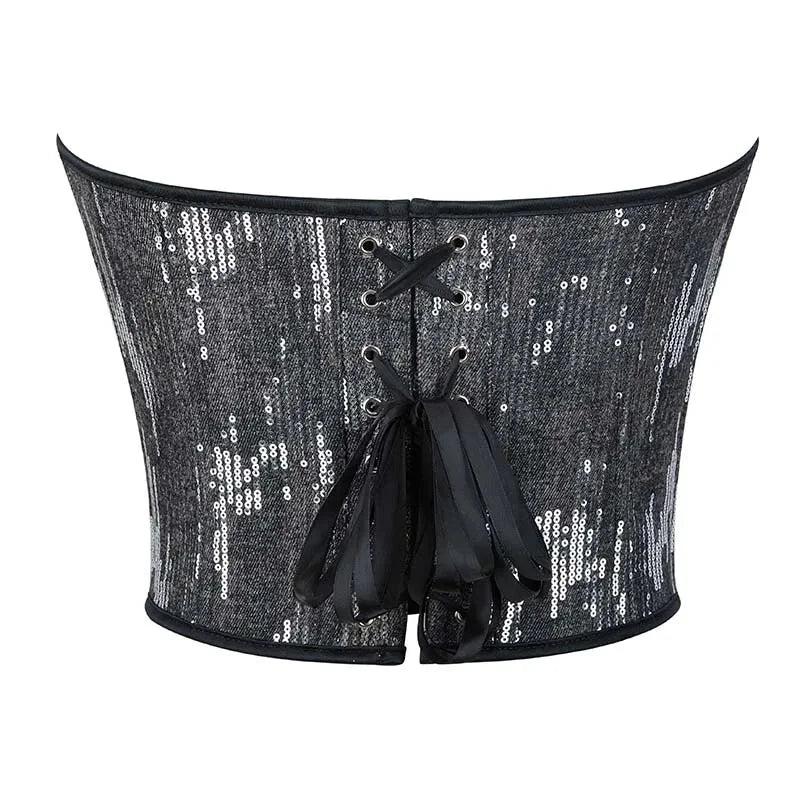 This plus size silver sequin crop top features lace detailing and provides support with 14 fishbones. It is designed to be stylish and versatile, suitable for various occasions such as parties, dates, work, and dancing. Made from a high-quality polyester and spandex blend, it combines durability with a comfortable fit.