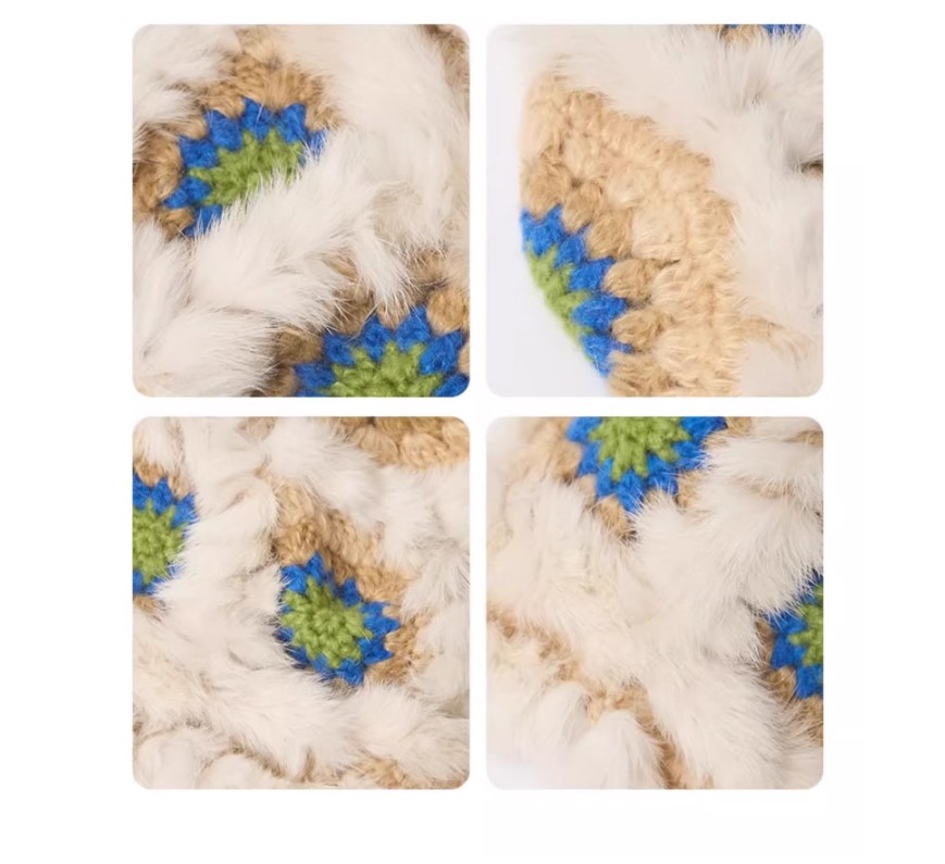 This plush floral bucket hat is designed to add warmth and style to your winter wardrobe. It features a soft plush exterior combined with a crocheted floral pattern, offering both coziness and a fashionable appearance. Suitable for most adults, it provides comfortable coverage during cold weather.