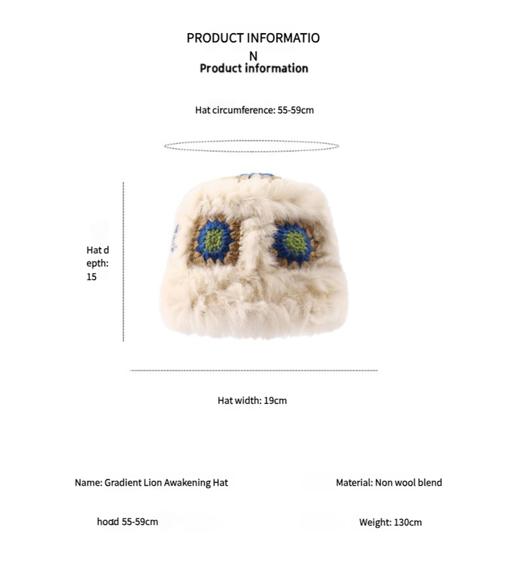 This plush floral bucket hat is designed to add warmth and style to your winter wardrobe. Crafted with a soft plush exterior and featuring a crocheted floral pattern, it offers both coziness and a fashionable appearance. Suitable for most adults with a head circumference of 55-59cm, it provides a comfortable fit for cold weather outings.