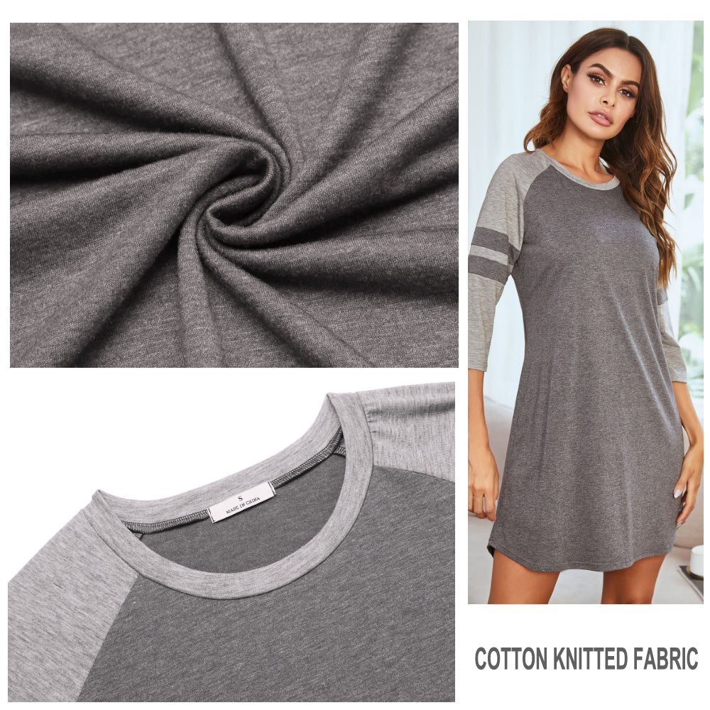 This women??s nightgown combines comfort and style, designed to provide a cozy and elegant sleep experience. Made from a soft blend of cotton and polyester, it offers breathability and a luxurious feel. The color matching design in deep gray and light gray adds a sophisticated touch, while the 3/4 sleeves and round neckline ensure a relaxed and graceful look.