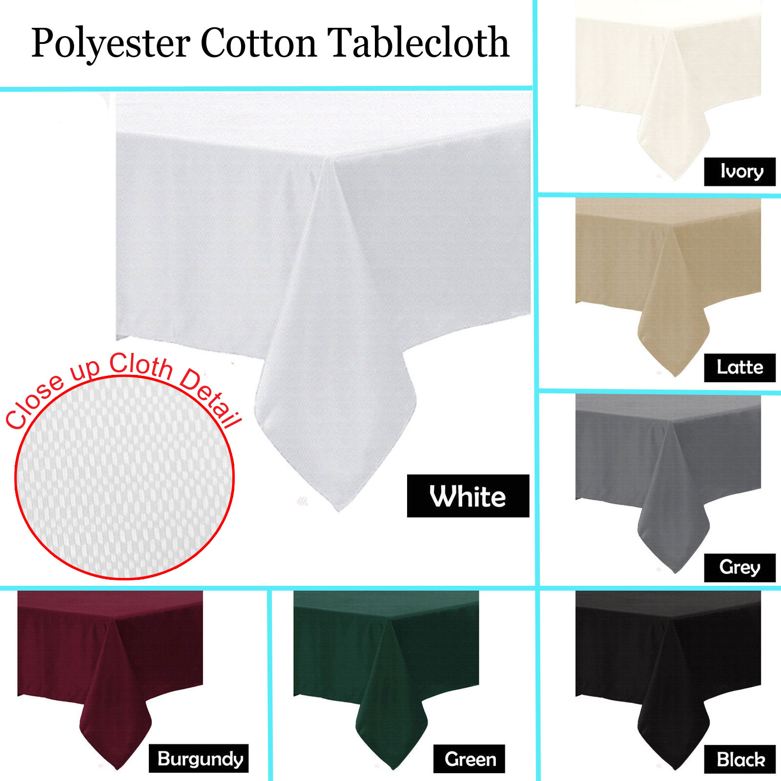 - Available sizes include various dimensions for square, round, and oblong tables