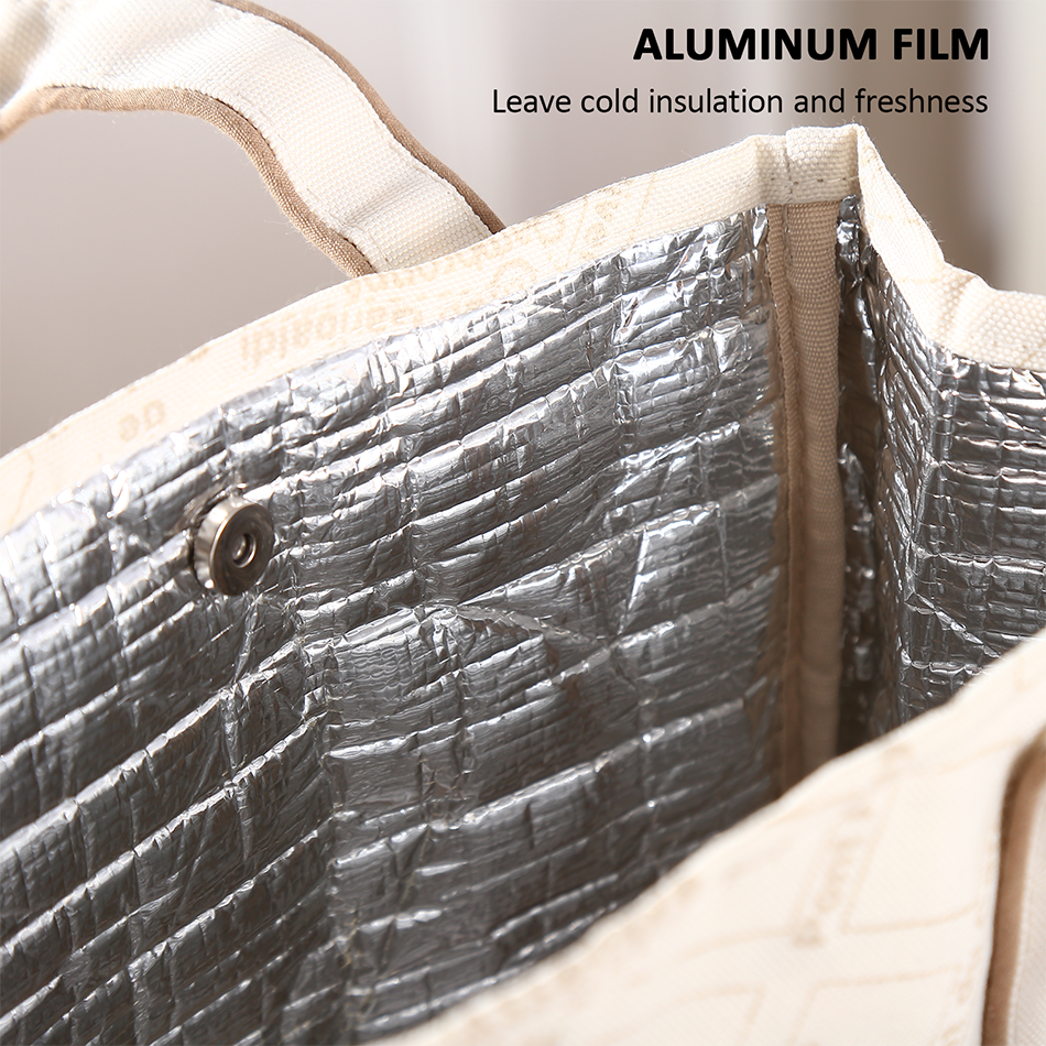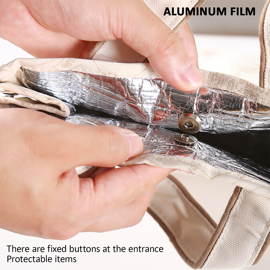 This portable insulated lunch bag is designed for convenient food storage and transport. Made from durable polyester with a fully thickened aluminum film interior, it provides waterproof, oil-proof, and easy-to-clean insulation to keep food hot or cold. The bag features a magnetic buckle closure for secure storage, adjustable side buckles to change its shape, and a small external pocket for quick access to small items. An internal mesh pocket is included for refrigerants or additional small items. The reinforced handle ensures comfortable carrying and increased load capacity.